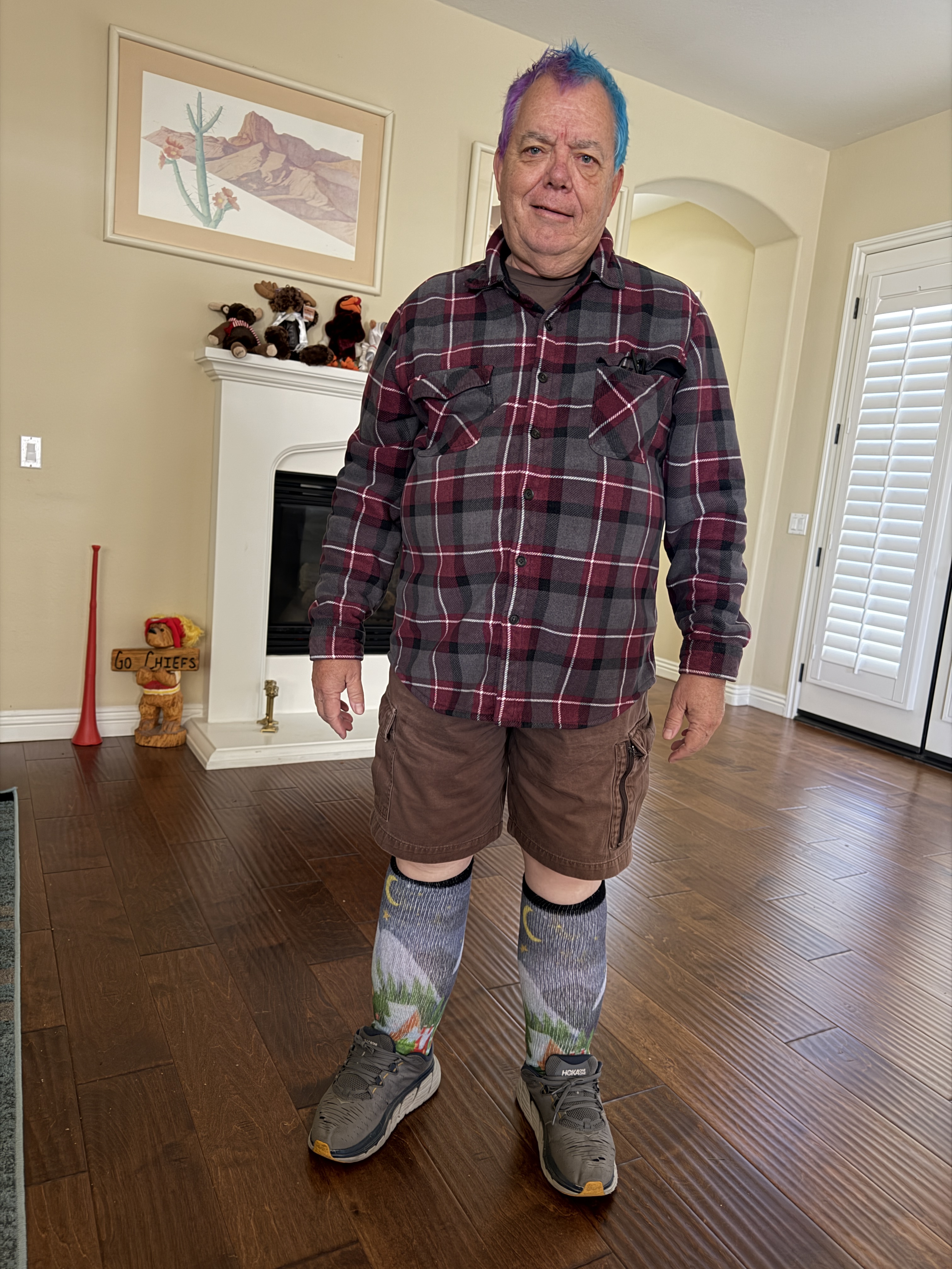 For the record, the hair’s the hair, the flannel shirt’s because I was cold (it was only about 65° in the house this morning), the shorts are because I was going for my first (and probably ONLY) pedicure so despite the chilly temps I needed easy access to my feet and little piggies, the knee-high compression socks are because I’m old and exploding, and the running shoes are because I always wear comfy running shoes these days due to a serious lack of fucks. The attitude and facial expression? Well, those come with the package and go without saying.