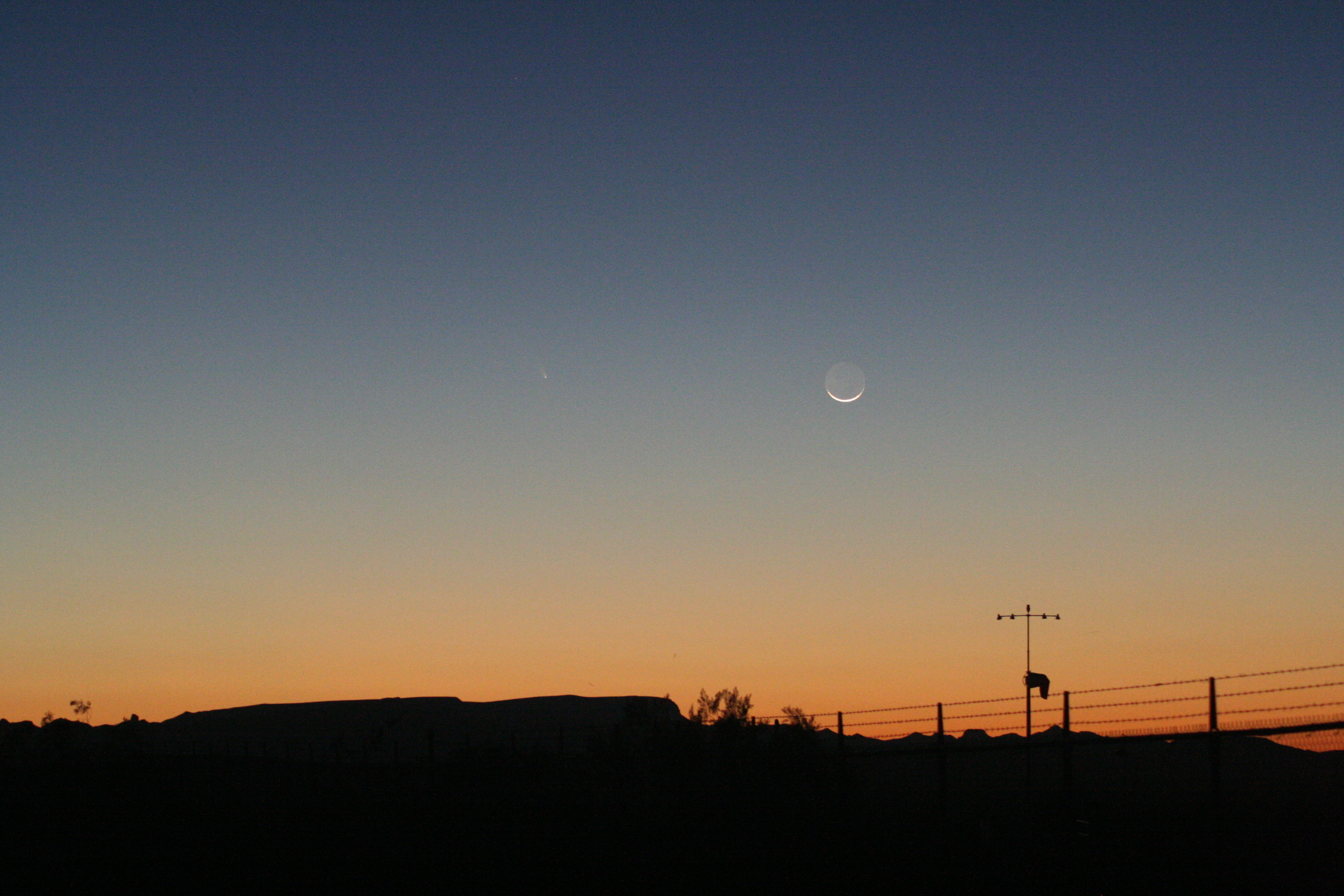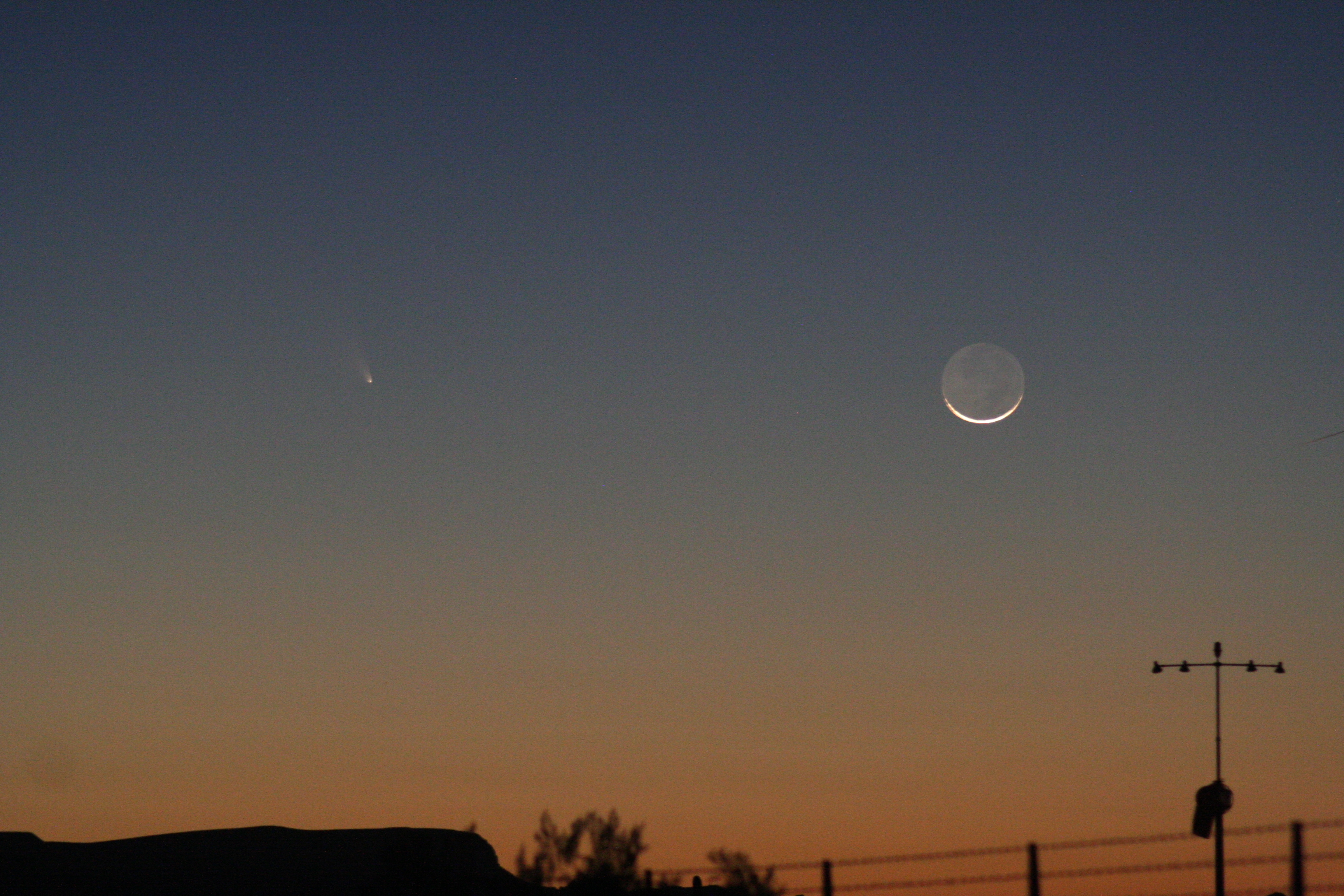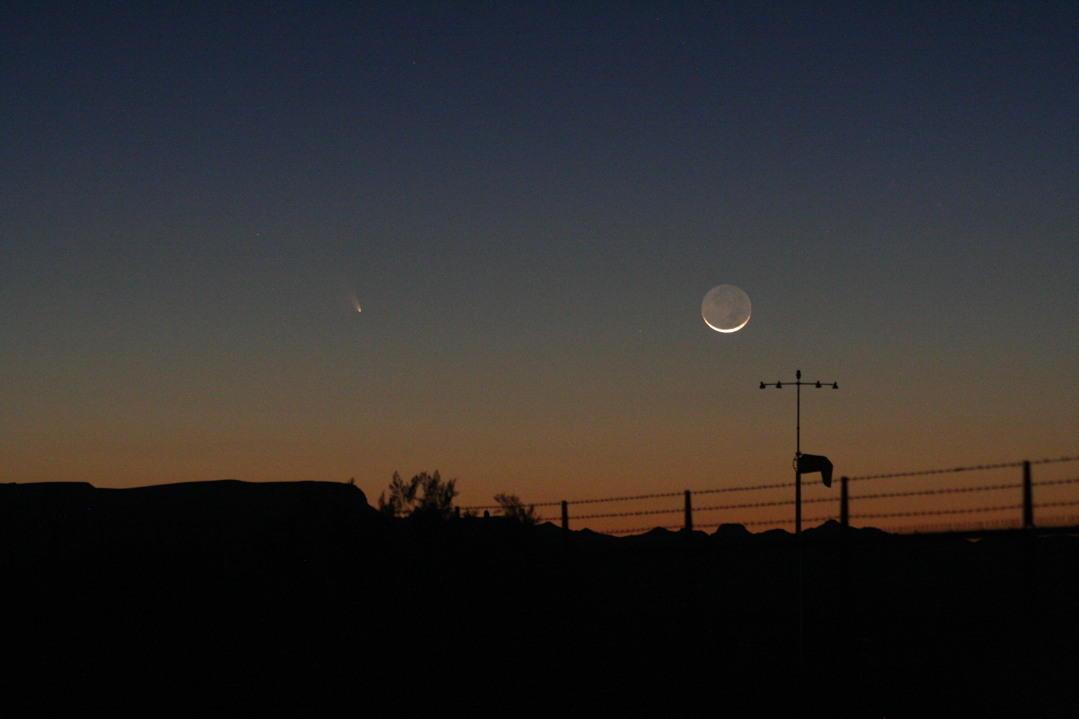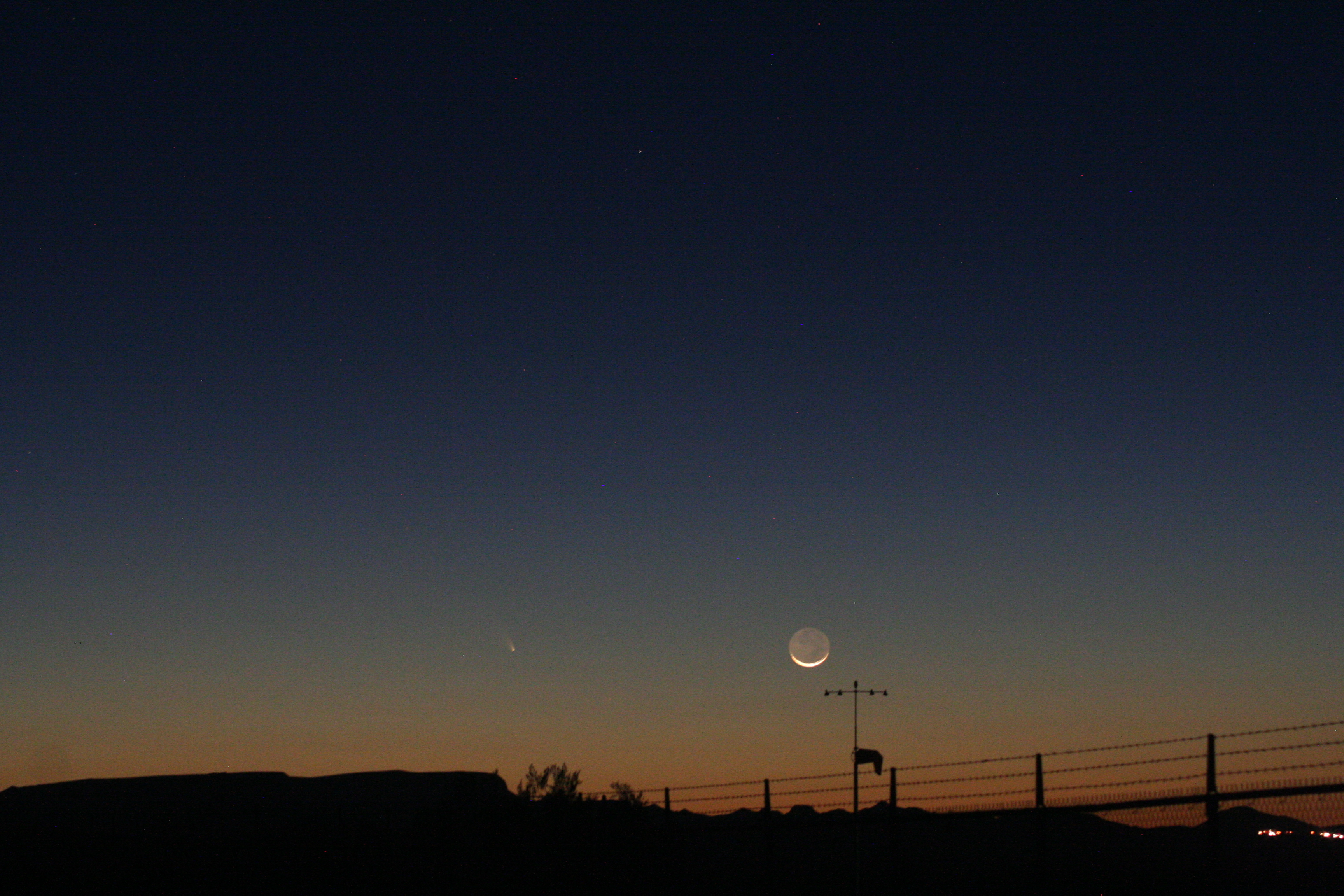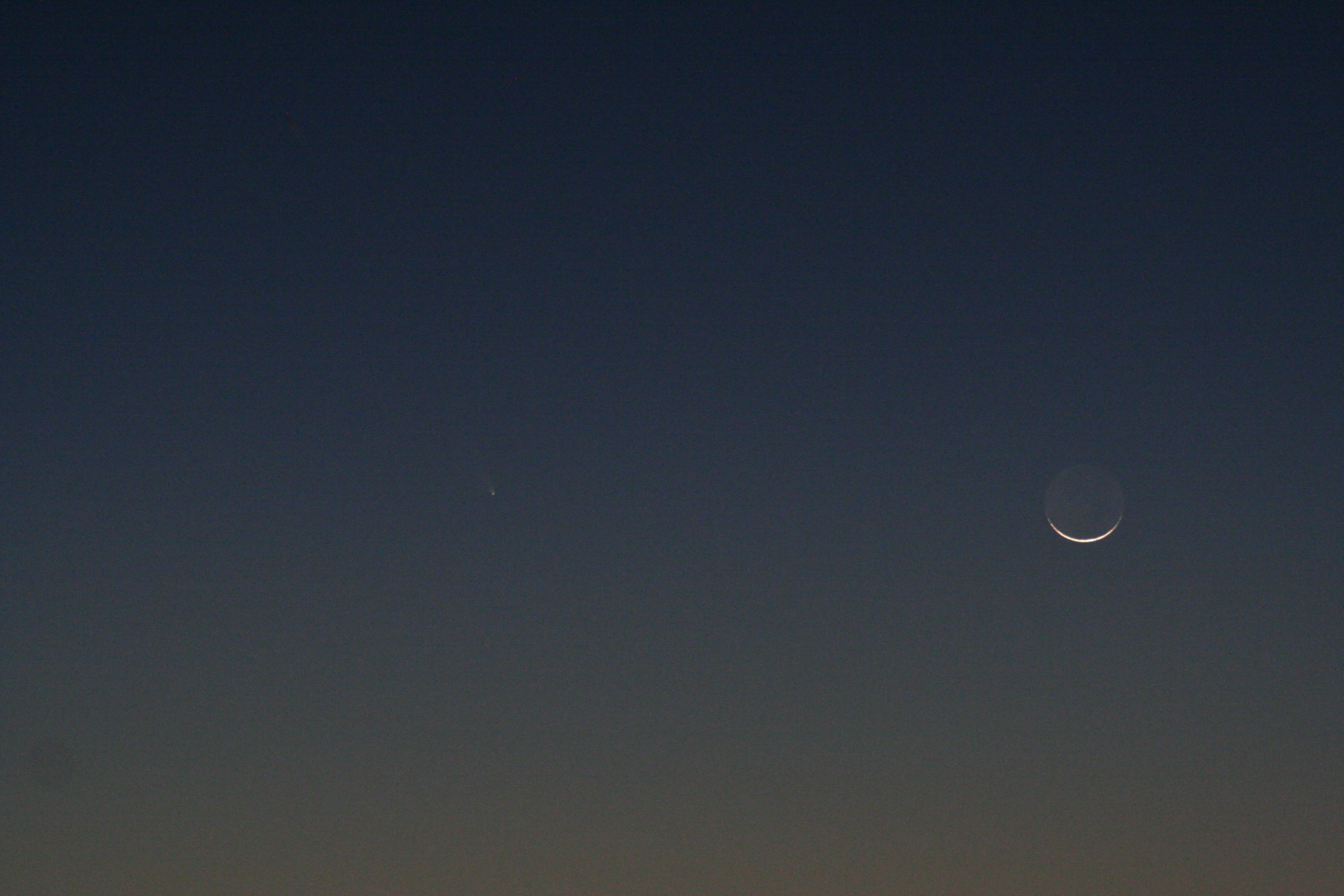 From the time we set up and it started to get dark enough to see the comet, I took multiple series of photos, starting each series at about 1/10 second and increasing the exposure on each through about 15 seconds. The pictures taken at 1/10 second are so underexposed that they’re almost black, barely showing the moon; the pictures taken at 15 seconds are so overexposed and blurred that they’re almost completely white. Each series of pictures has twenty or so pictures in it at 0.10 second, 0.125 sec, 0.167 sec, 0.20 sec, 0.25 sec, 0.33 sec, 0.40 sec, 0.50 sec, 0.60 sec, 0.80 sec, 1.00 sec, 1.30 sec, 1.60 sec, 2.0 sec, 2.5 sec, 3.2 sec, 4.0 sec, 5.0 sec, 6.0 sec, 8.0 sec, 10 sec, 13 sec, 15 sec, and so on. It takes maybe two or three minutes to do a “set” of pictures. Then change the view, change a lens, zoom in, zoom out and take another set. Repeat as necessary or possible, in this case until the moon and comet set.