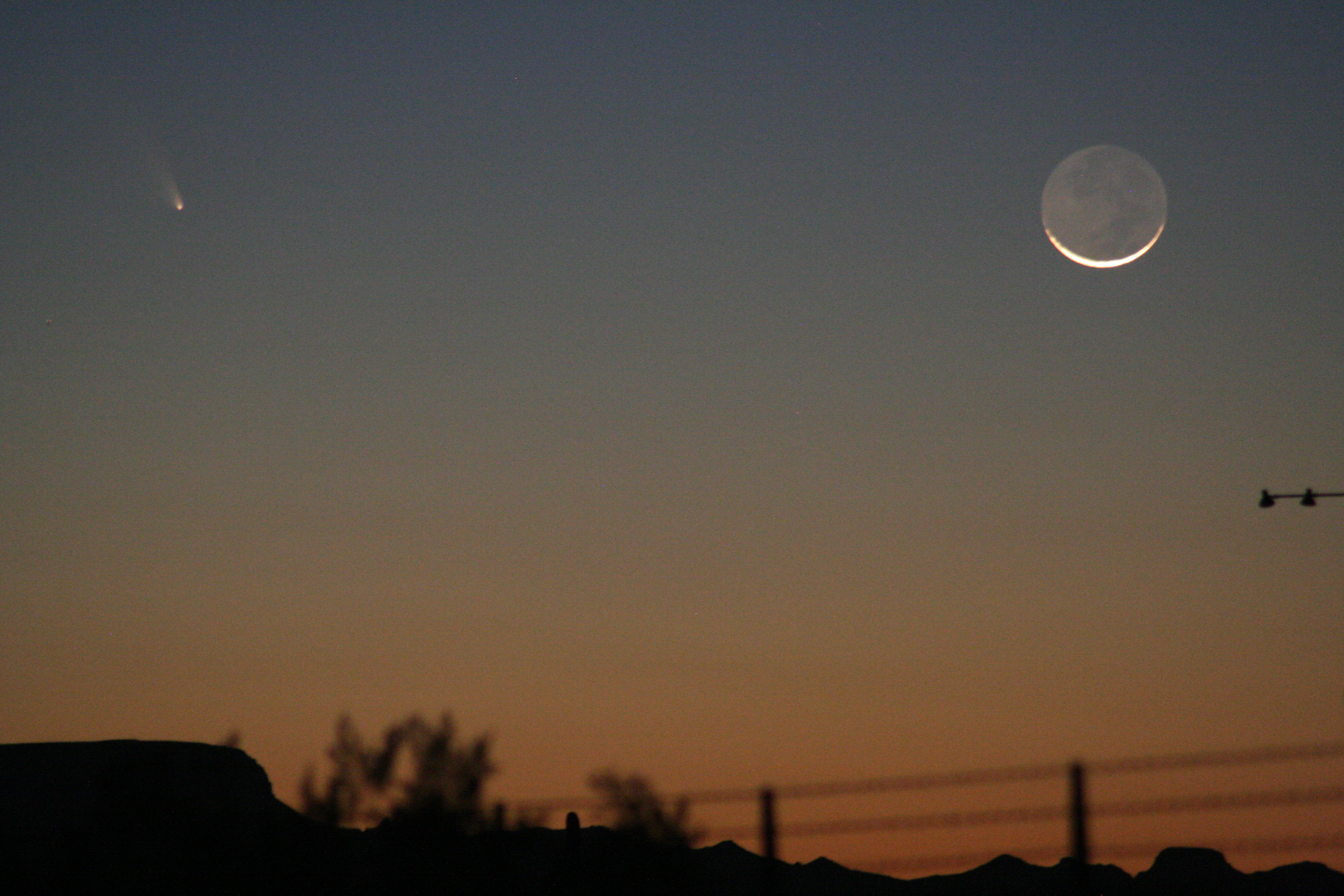 This picture was taken March 12, 2013 at 19:39 PST using a tripod-mounted Canon Eos Digitial Rebel Xt and a Tamron 70-300 mm zoom lens set at 70mm, manually focused. The exposure was 2.5 seconds at f5.6. The moon was just over one day after new moon and nicely shows the “old moon in the new moon’s arms” effect, with the majority of the lunar surface illuminated by light reflected off of the Earth but the lower limb of the moon much more brightly lit by direct sunlight. To the left of the moon, level with it about six lunar diameters out, you can see Comet Pan-STARRS at nearly it’s brightest for northern hemisphere viewers.