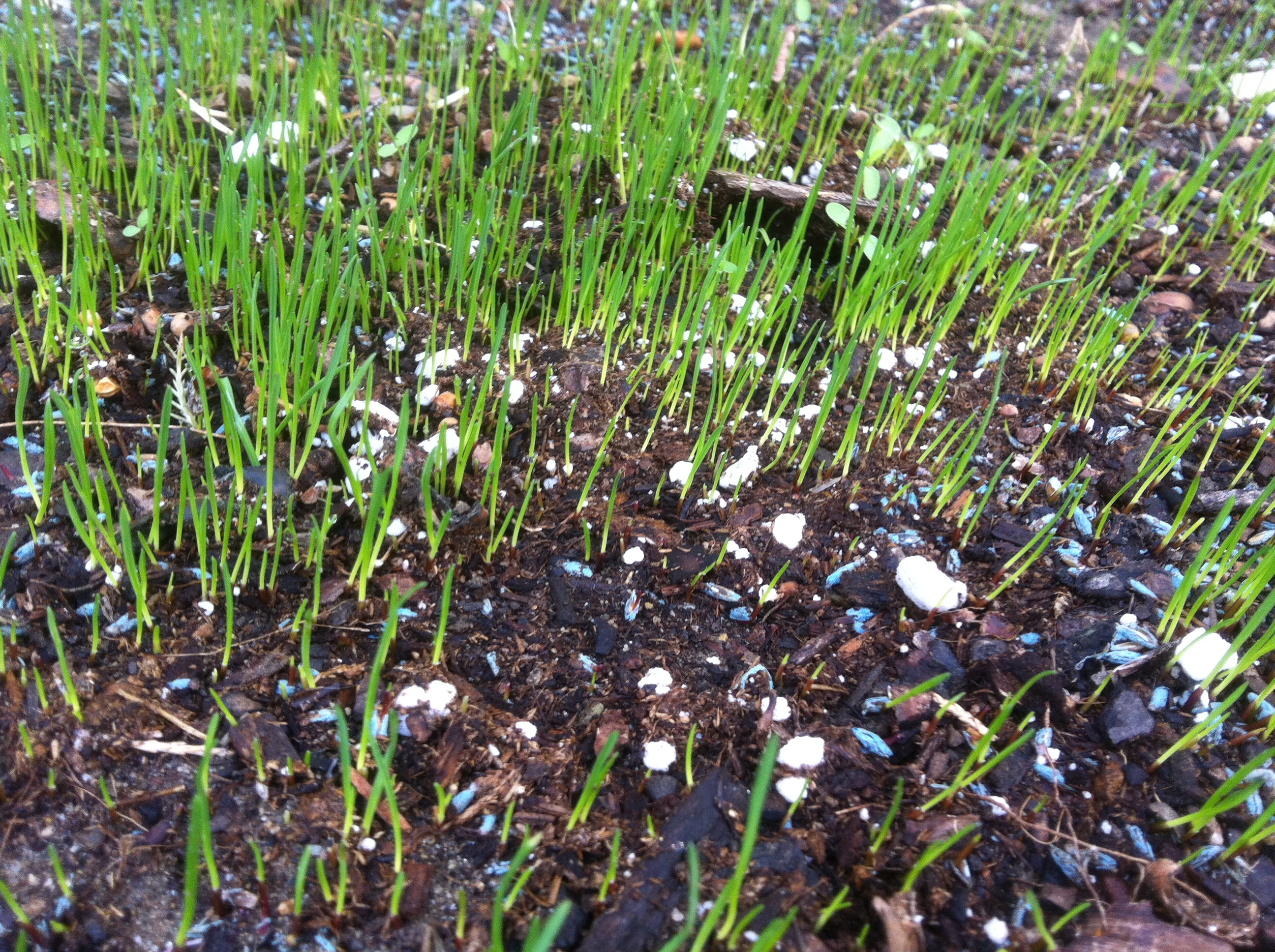 Once the mess was cleaned up I put down some fertilizer and grass seed, then waited the 6-14 days that the package said before the seed would start to grow. That was nearly three weeks ago. I’ve been watering, it’s been sunny, I’ve been keeping the dog from wandering across that section of the lawn — but nothing has grown.