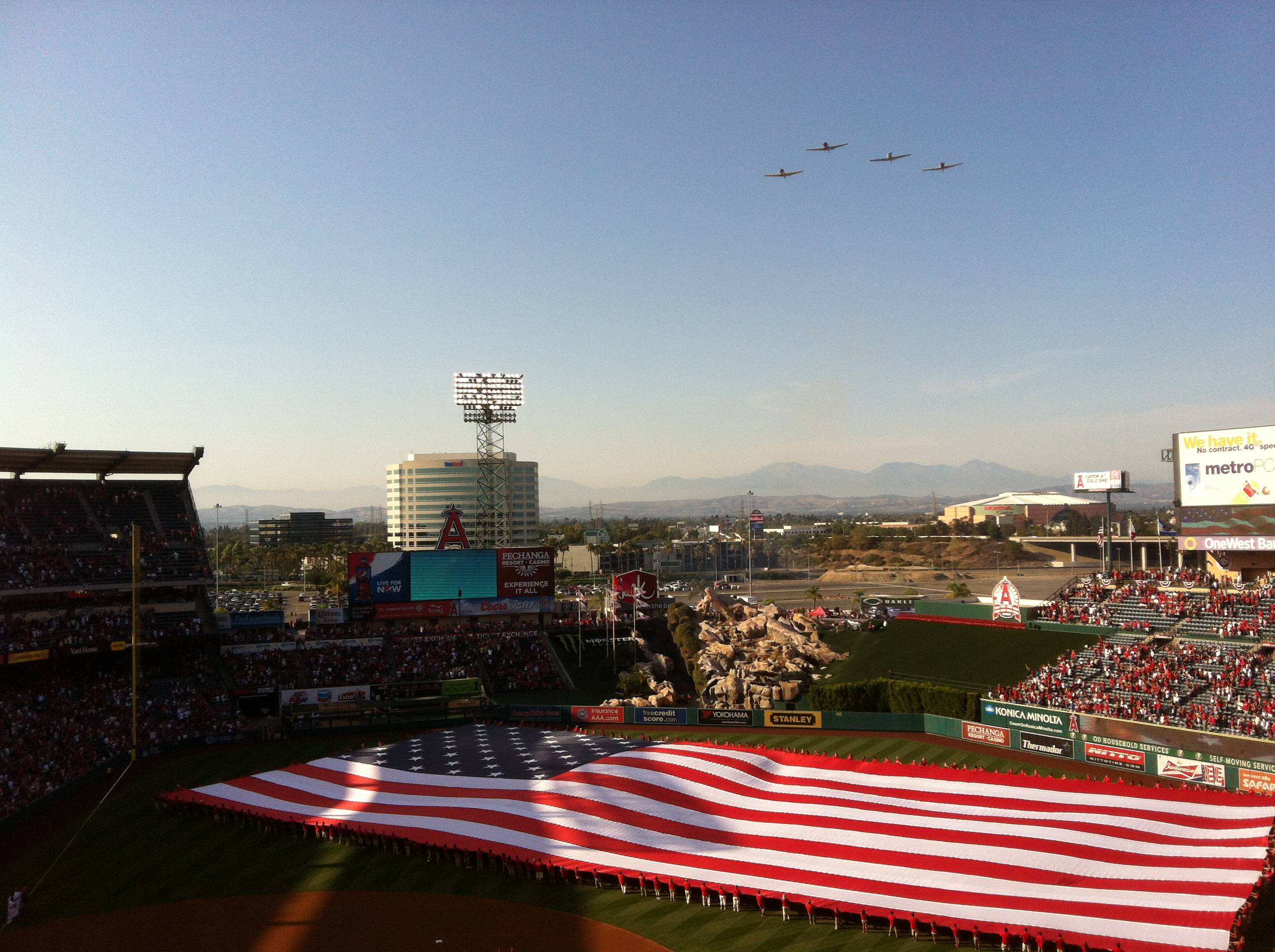 The game started with the unfurling of a gargantuan US flag covering most of the Anaheim Stadium outfield, as well as a flyby. Since all US military flybys have been cancelled due to sequestration, the Angels are using the Condor Squadron out of Van Nuys, a group of WWII vintage T-6 “Texan” trainers. Bravo to the Angels for this!!