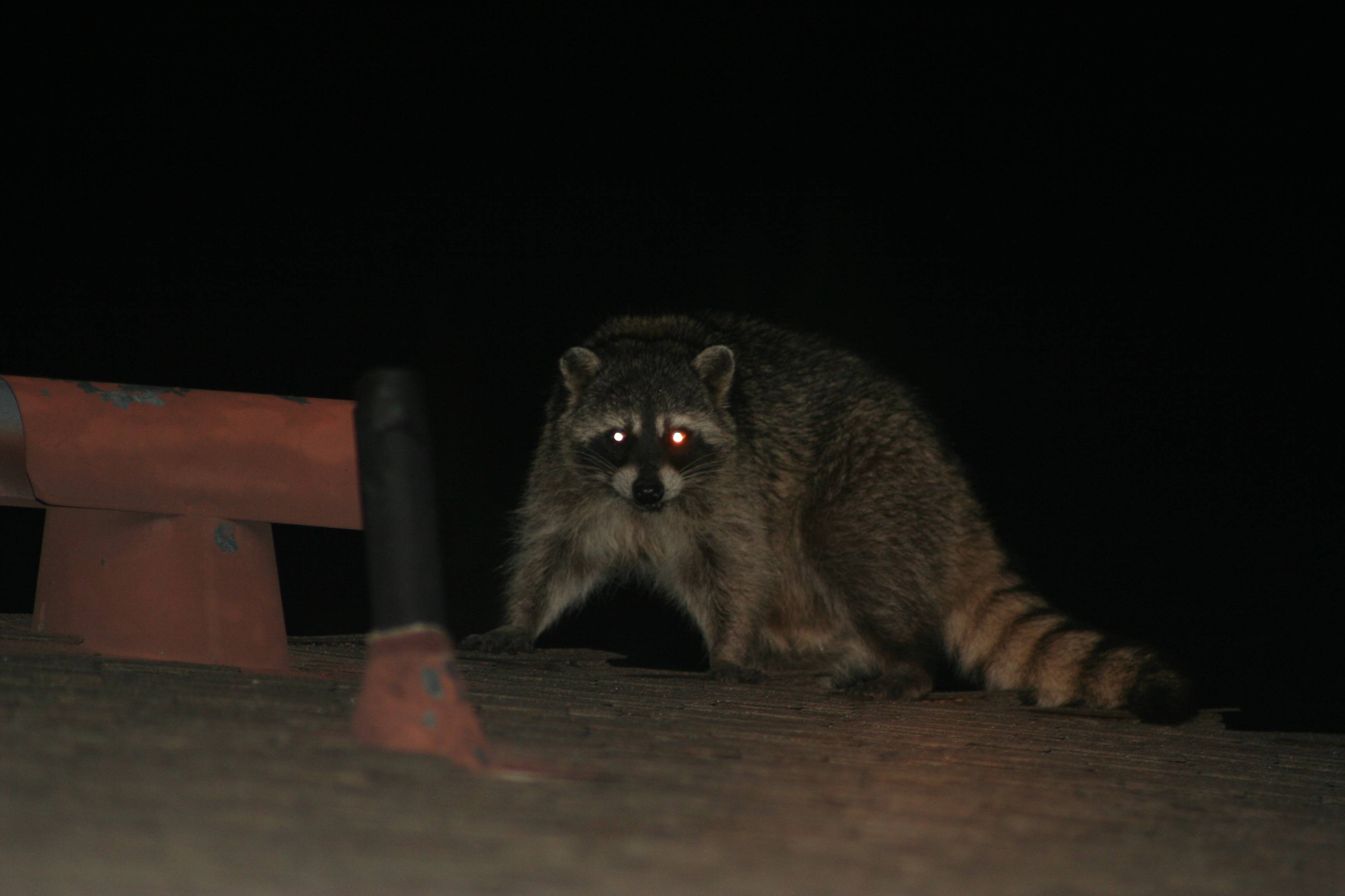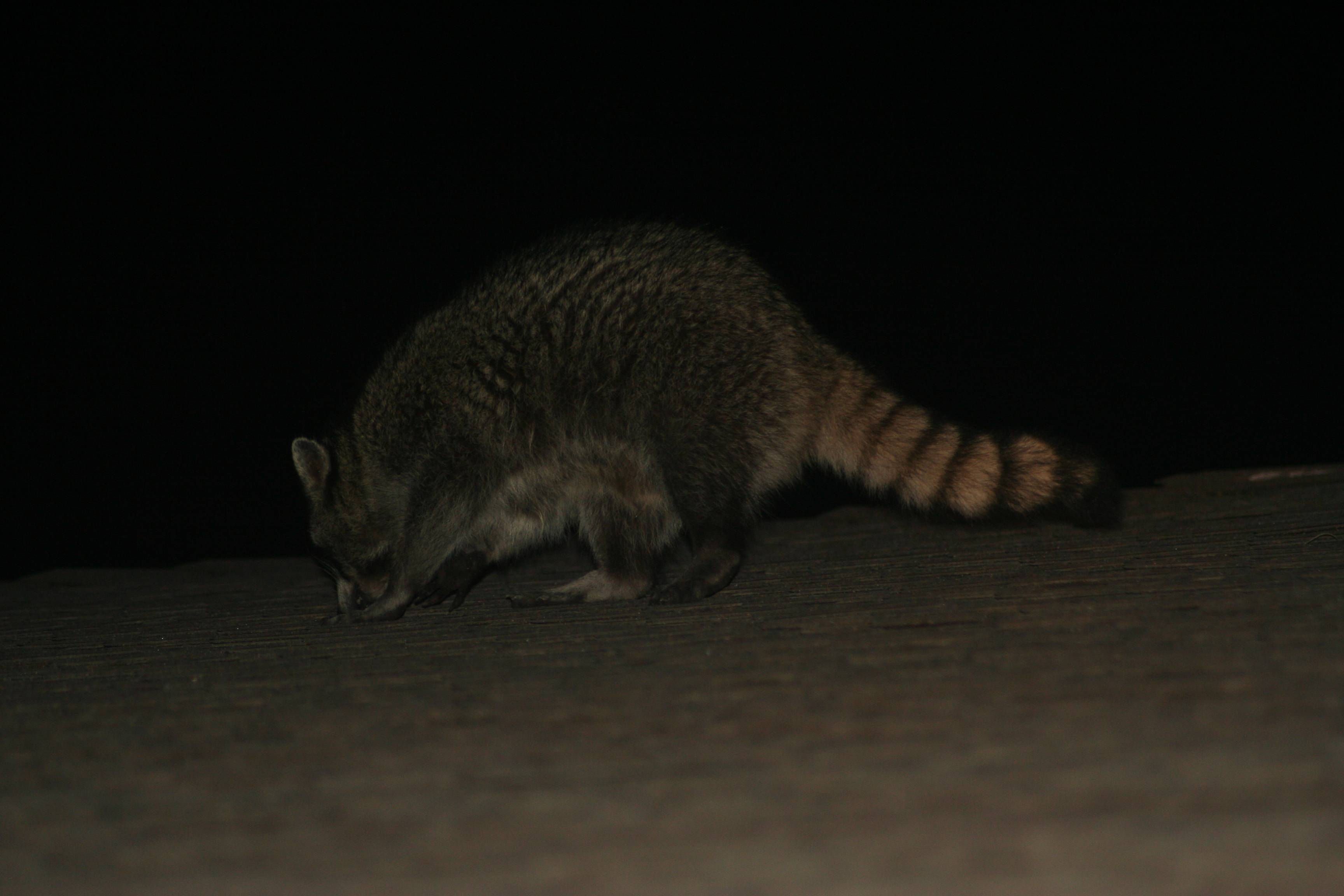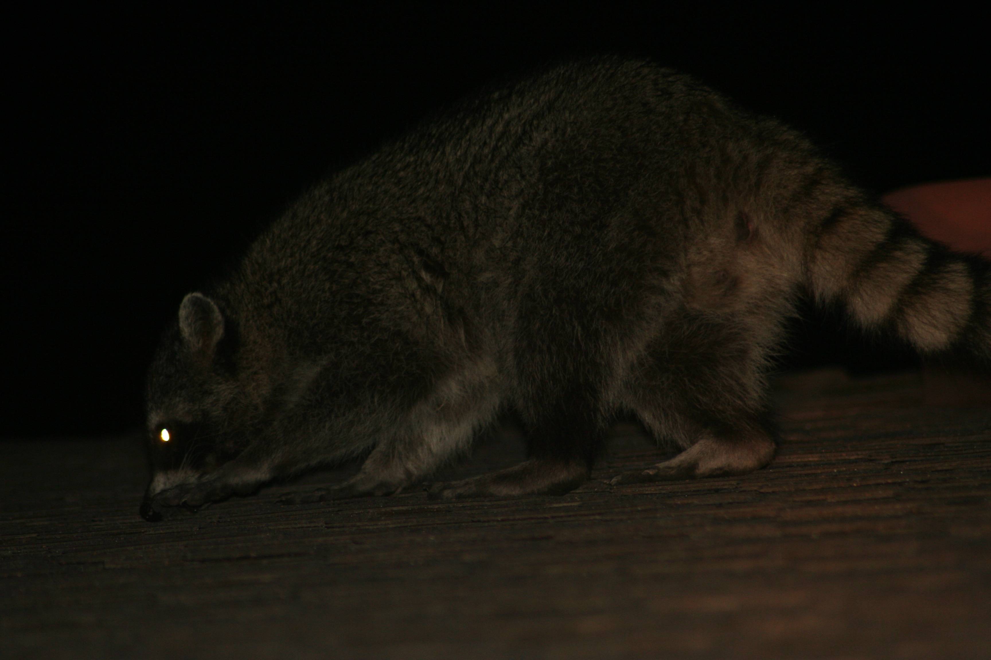 Around the 4th of July they vanished (we can tell because the water in the dog’s outside dish is clean in the morning), probably off to feed somewhere else in their territory. However, this morning the dog’s water was muddy, she got all poofy when she went out & sniffed the bowl, and now they’re out there on the roof rattling around again.