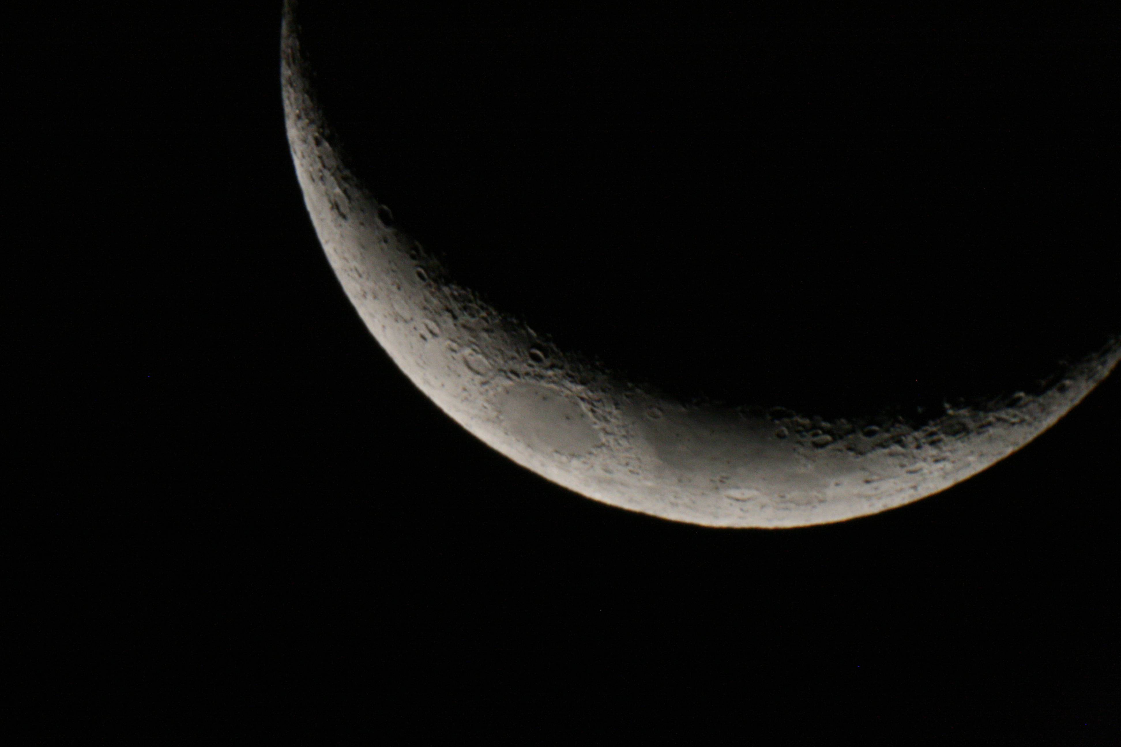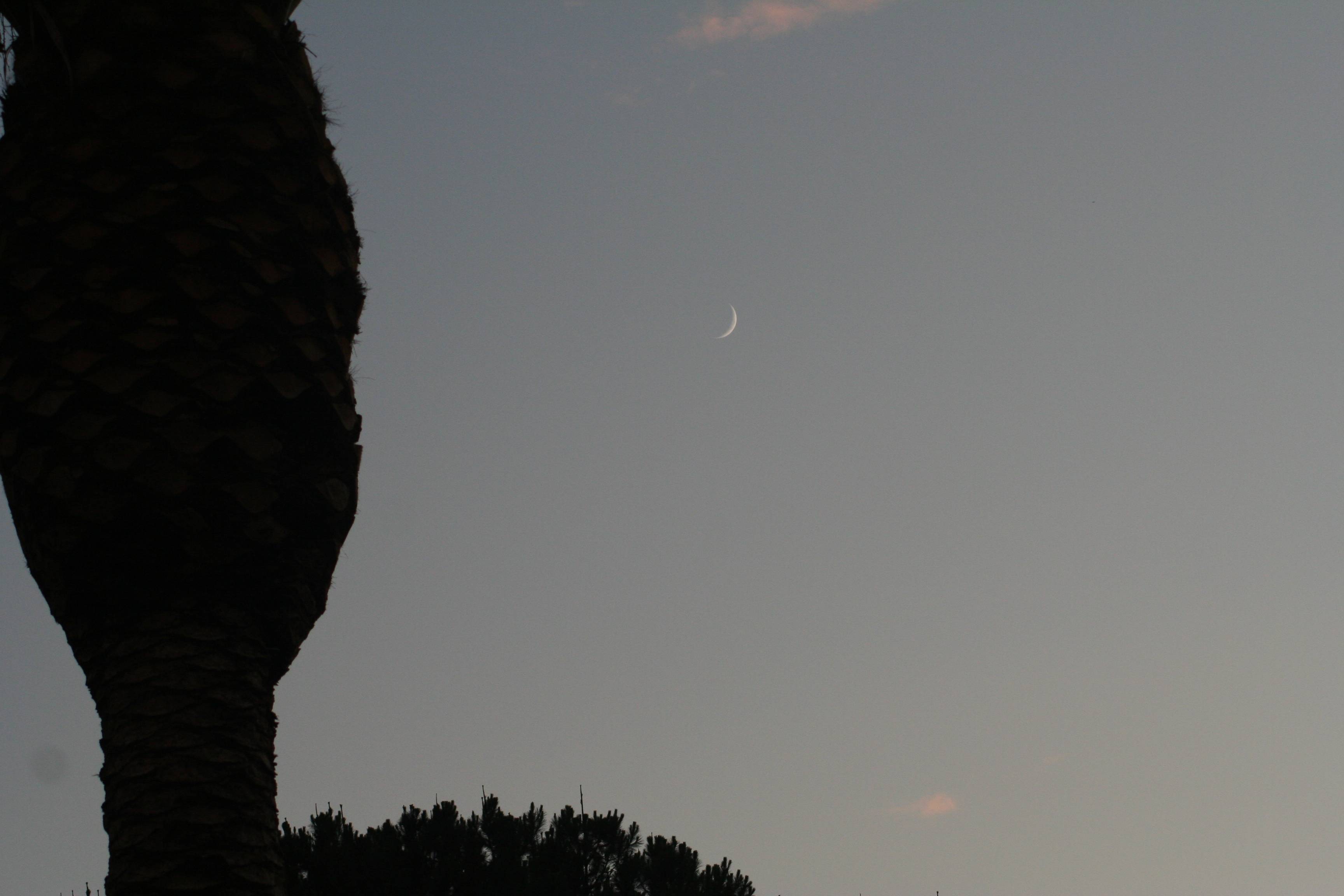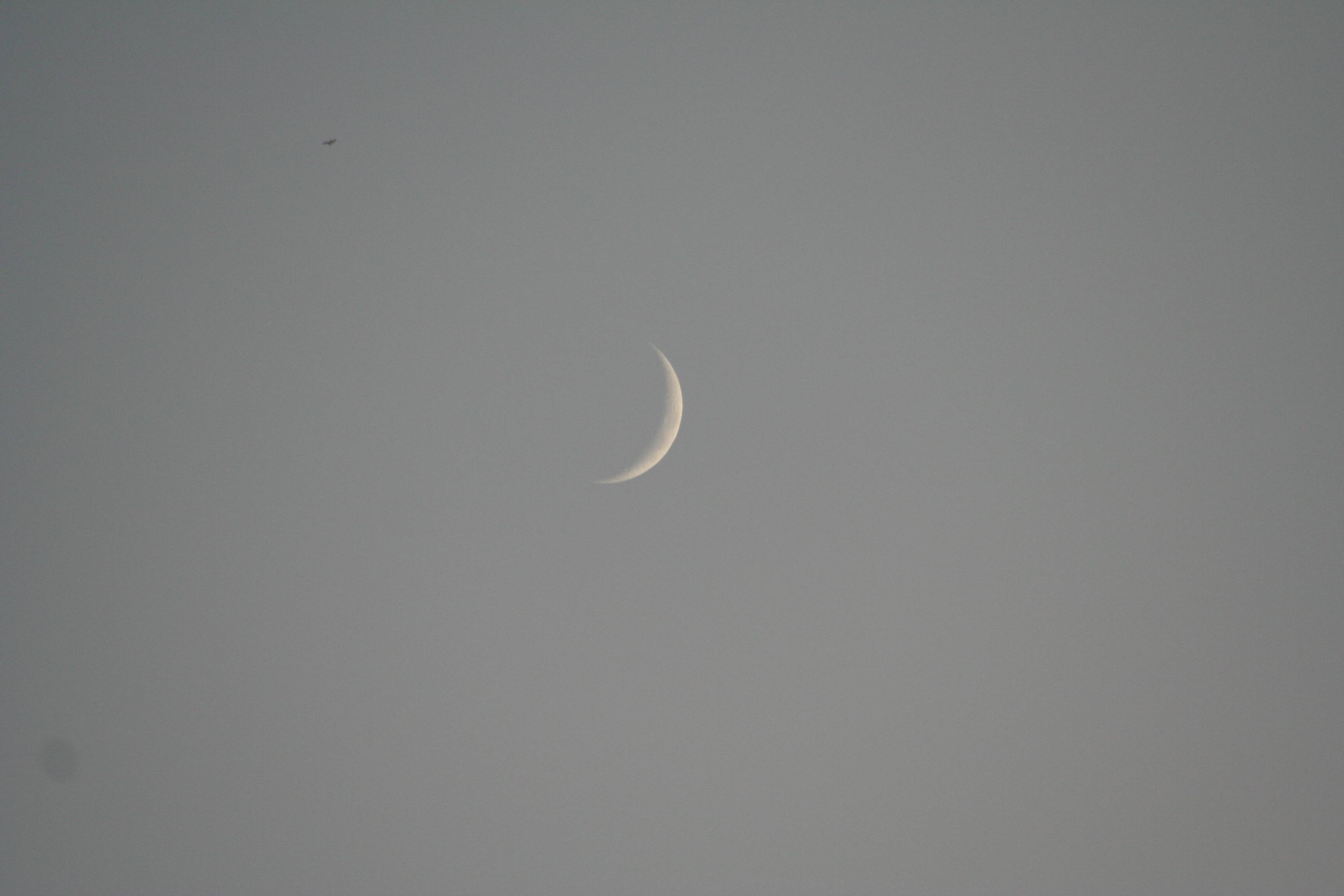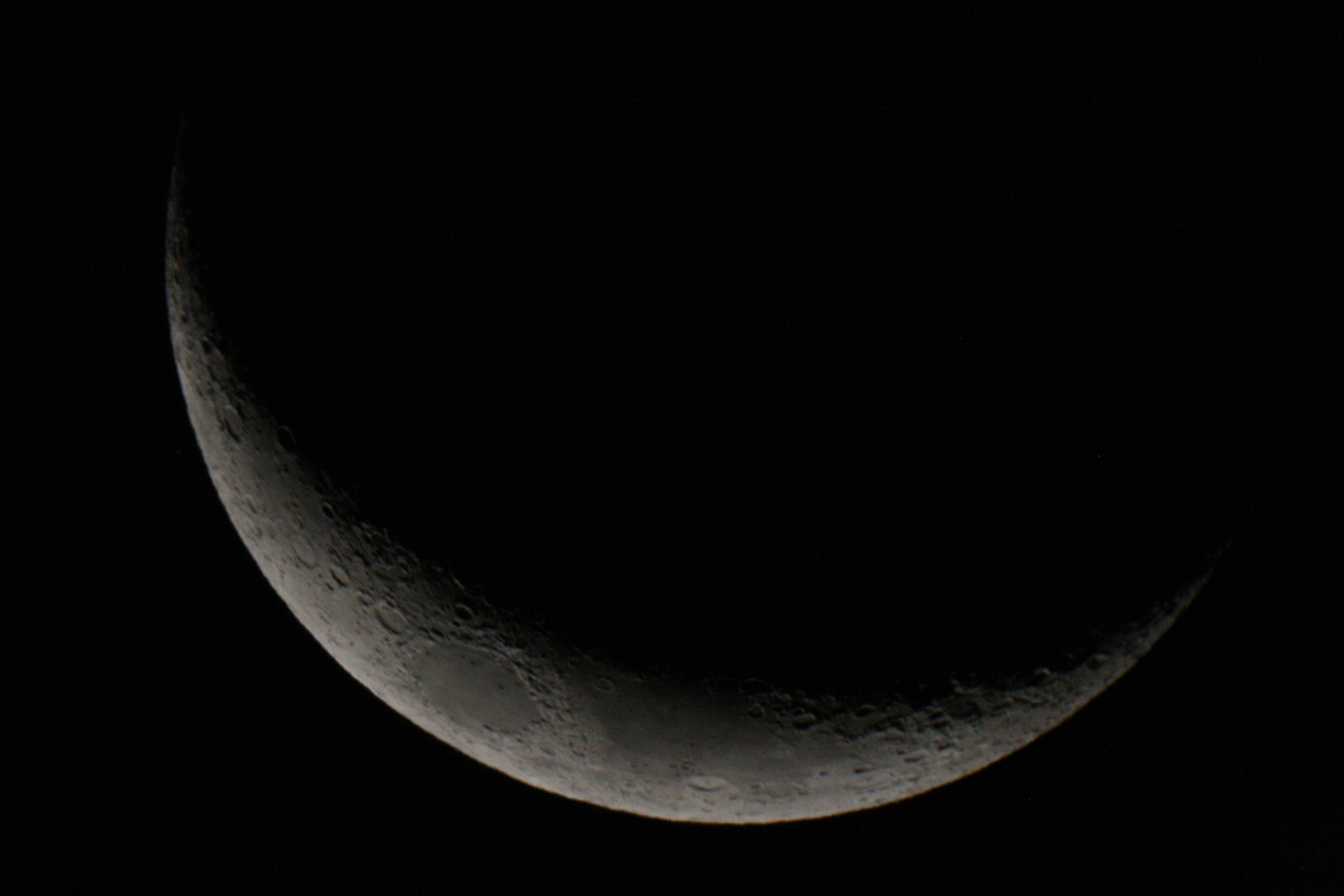 Using the telephoto lens at 70mm, you can see the crescent moon, three days old and 13% illuminated.
