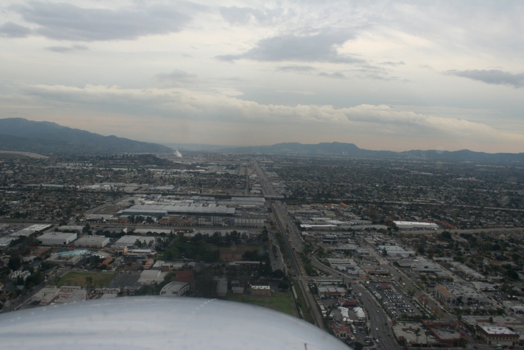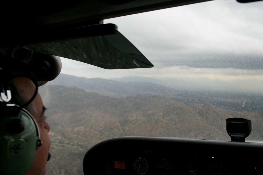 Headed back home, we’re at about 2,500 feet or so coming east through the Santa Suzanna Pass back into the San Fernando Valley. We clearly have more than ten miles’ visability and the cloud base is up around 5,000 feet, so we’re legal, if wet. This is about the point on the way back where we call Van Nuys (sort of visible far off in the distance on the right edge of the picture) to get clearance to transition through their airspace to Whiteman.