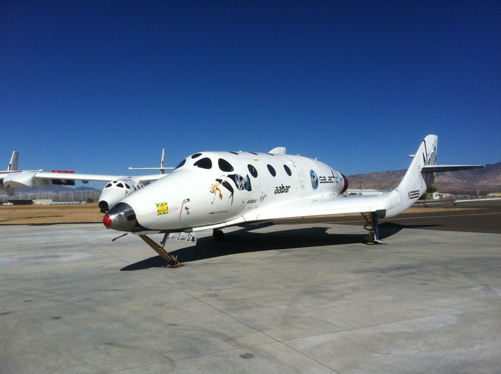 Behold, the current spaceships of Virgin Galactic! On the left is WhiteKnightTwo, the first of the Virgin Motherships, christened VMS Eve, named after company founder Sir Richard Branson’s mother. On the right is the first SpaceShipTwo, which had its second powered test flight just last Thursday, reaching 69,000 feet after a twenty-second engine burn.