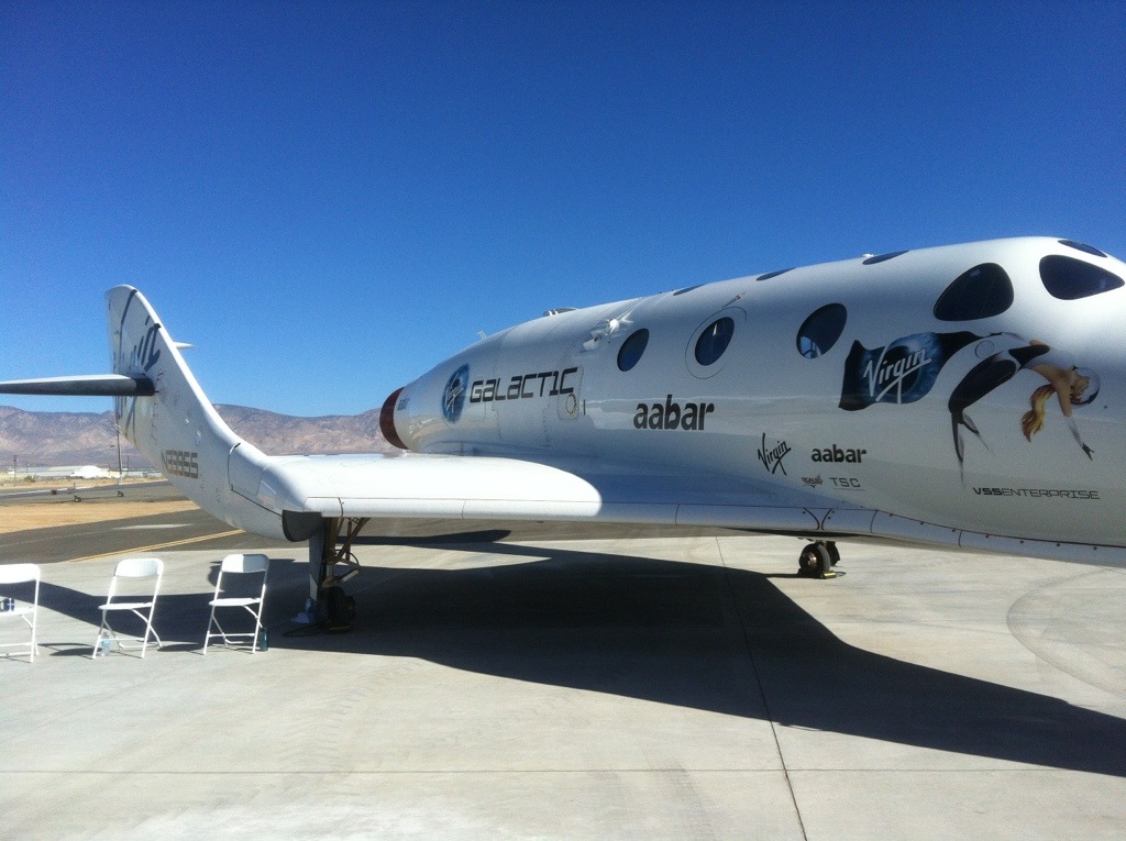 Up close and personal with the SpaceShipTwo. Notice that there is no front wheel – a skid is used instead.