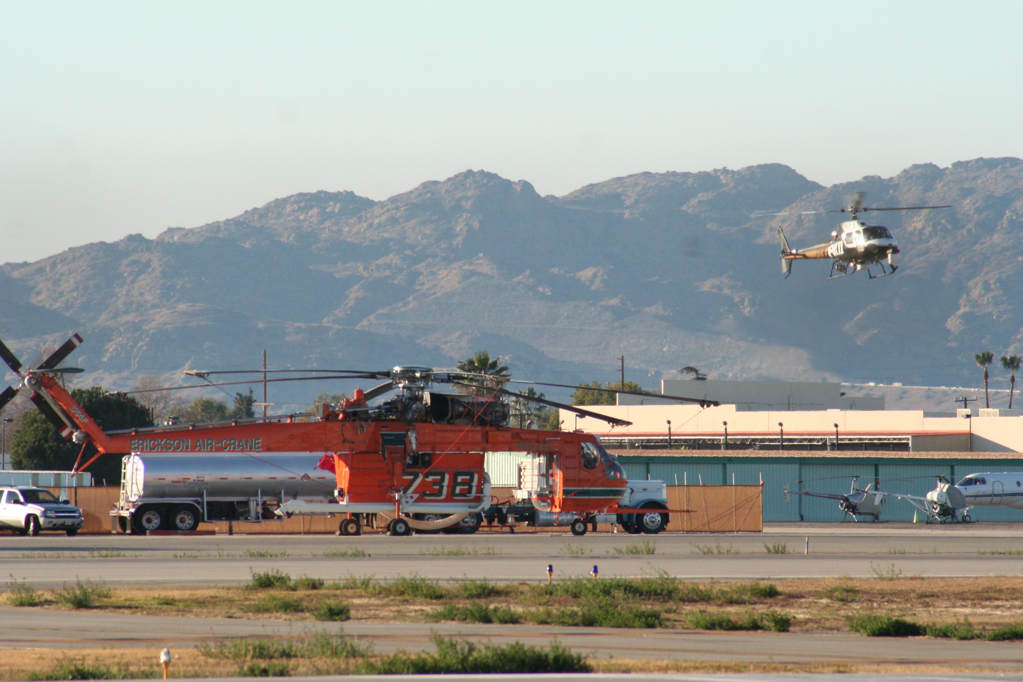 Channel 11’s helicopter landing, next to one of the big Sky Cranes that they use for fighting brush fires.