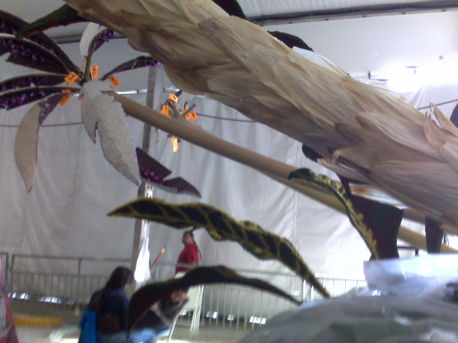 At that point the big honcho came around, the artist who designed all of the floats. He was reviewing all of the work being done and it was soon clear that his vision of the palm tree trunks and the vision I had been creating did not coincide well. One or two of the trunks were deemed adequate, but two more were not.I was told to strip off about three hours worth of work, re-paint it with glue, and start over.