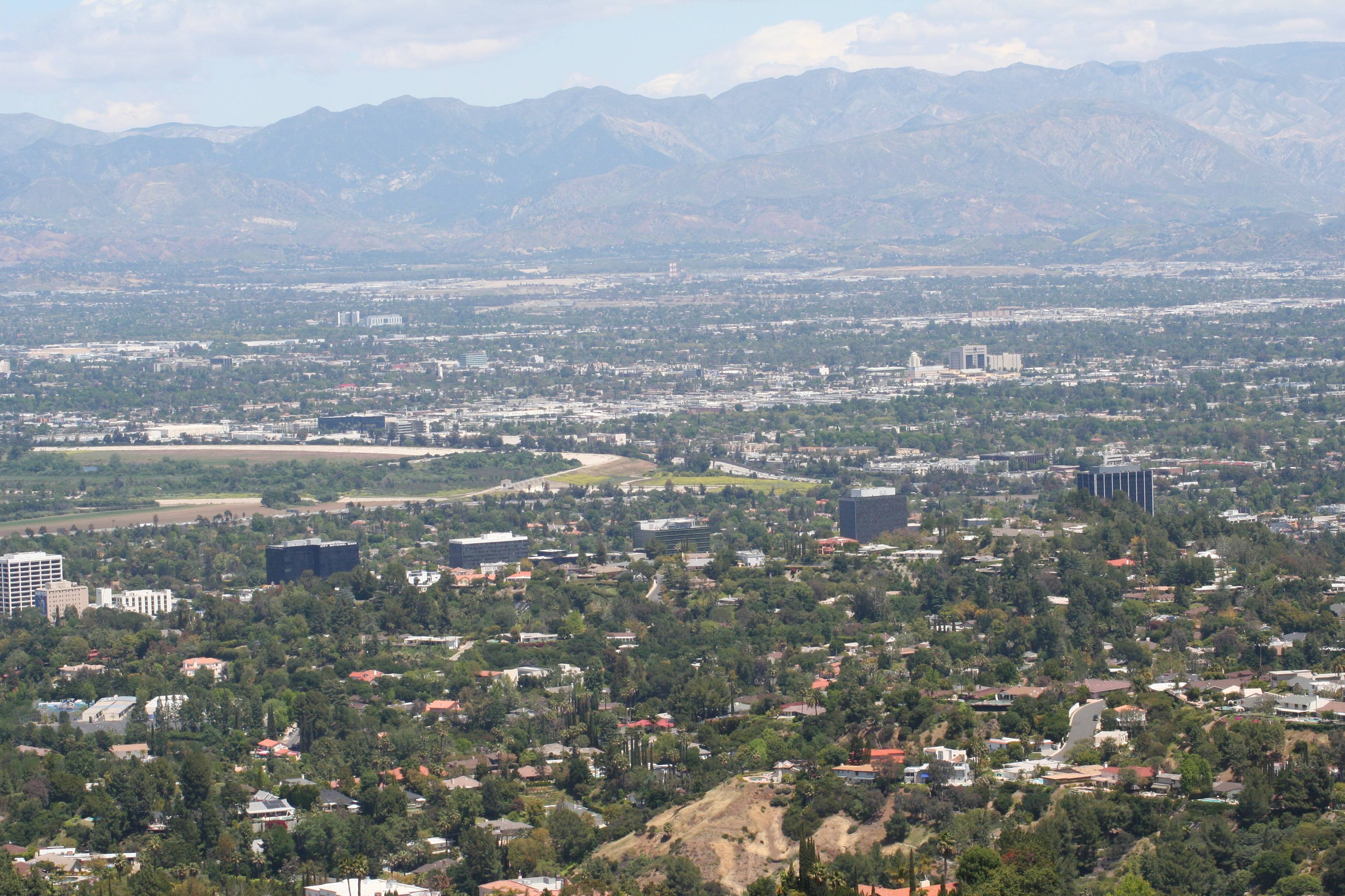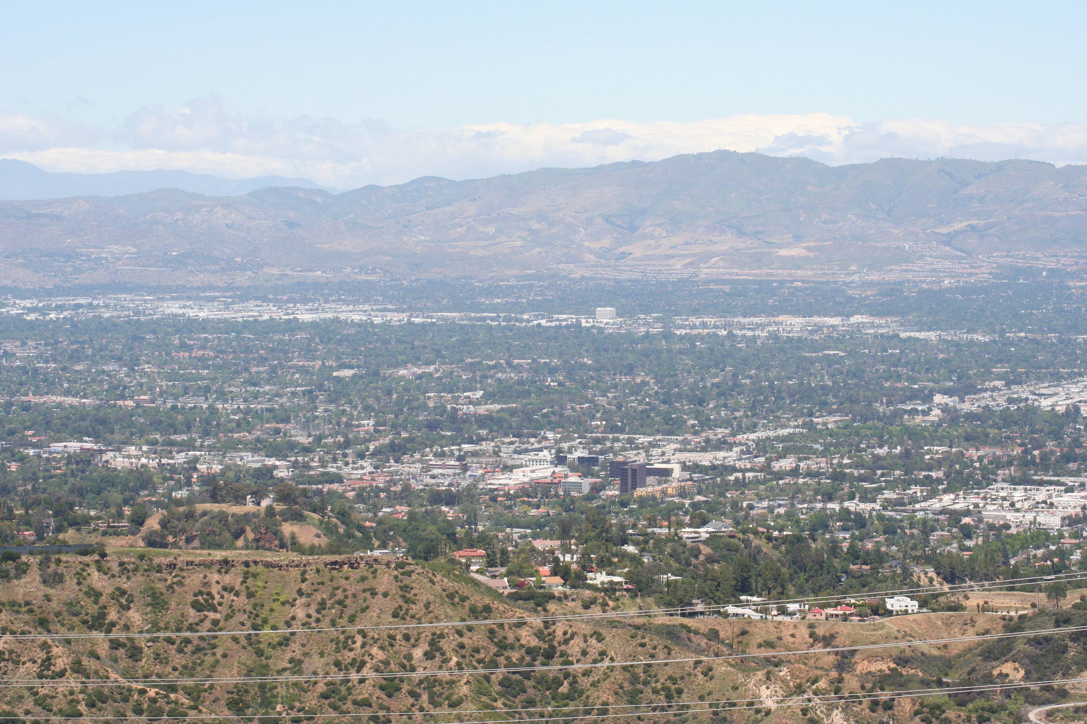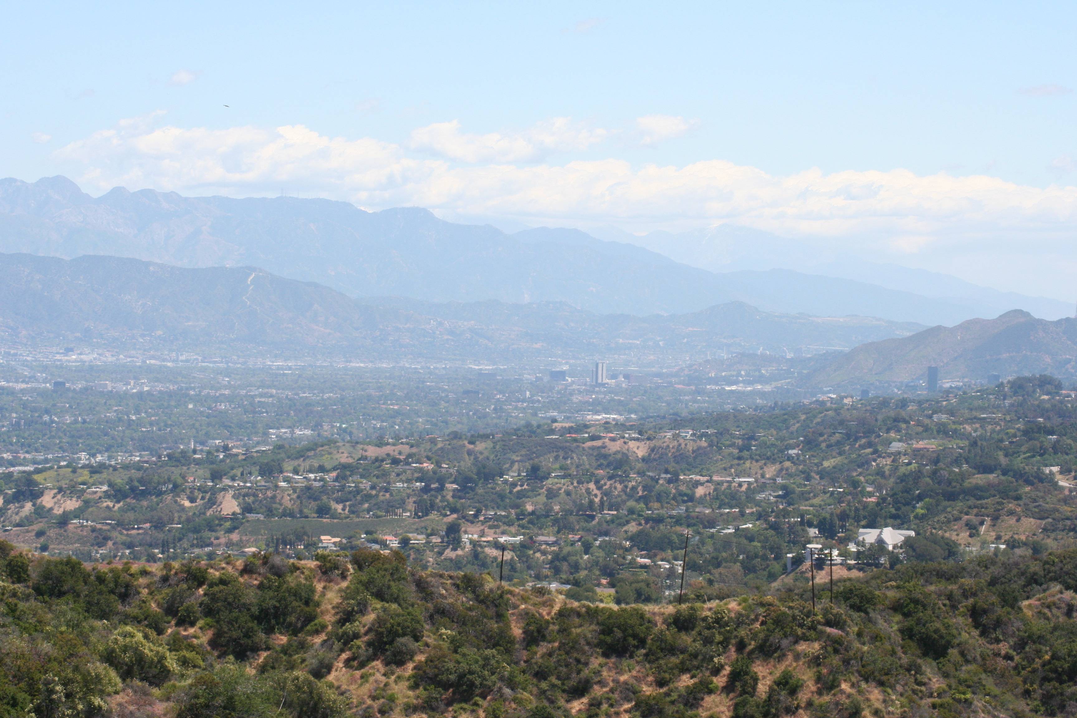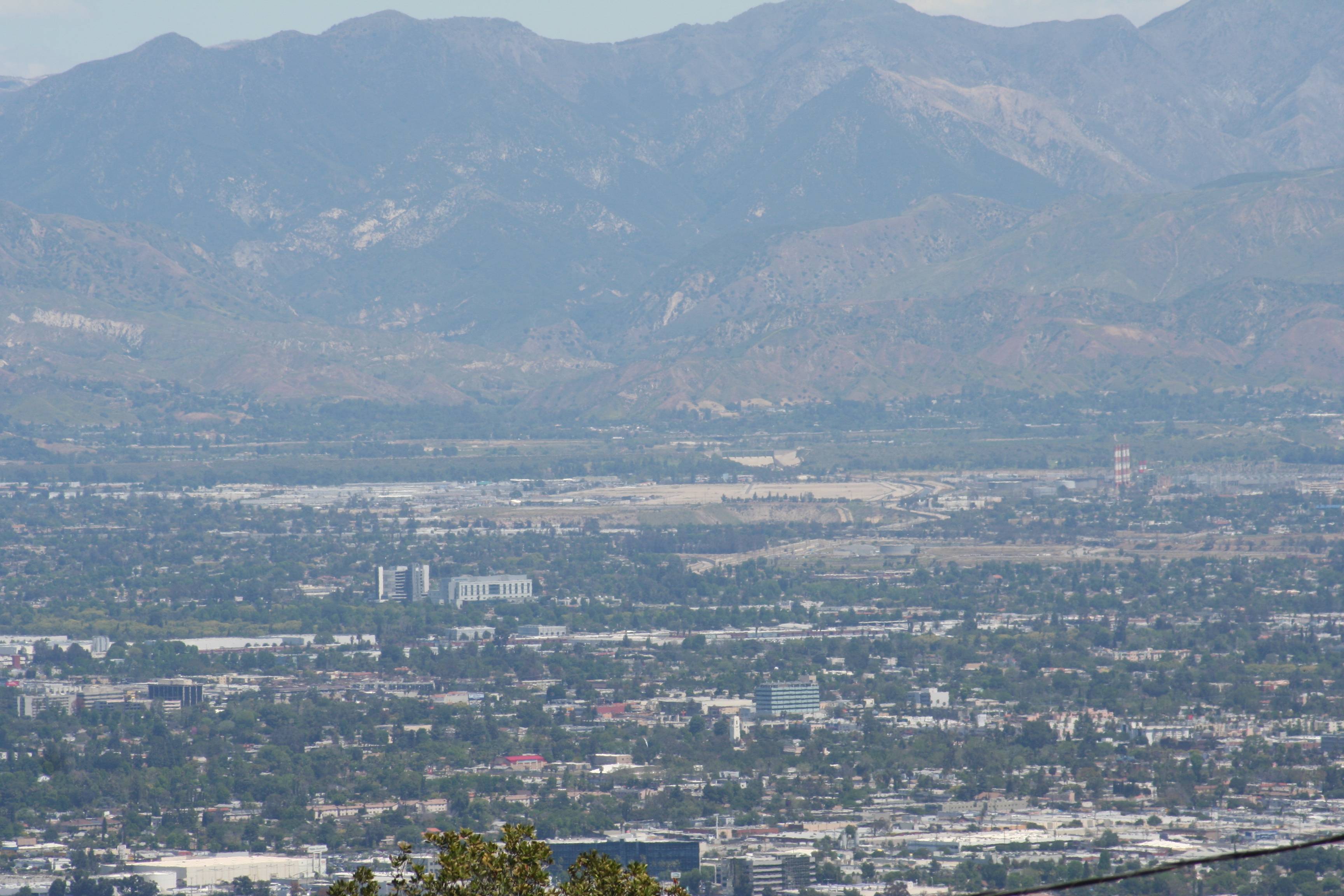 11_IMG_6273_smallThe eastern San Fernando Valley, with the San Bernardino Mountains rising up in the distance. In the center middle distance you can see the skyscrapers of Glendale, and the infamous Universal City “black tower” is at the middle near the right edge. Griffith Park is in the hills behind the black tower. That gap you see between Griffith Park and the San Bernardinos will take you off to Pasadena, the Rose Bowl, and into the San Gabriel Valley.