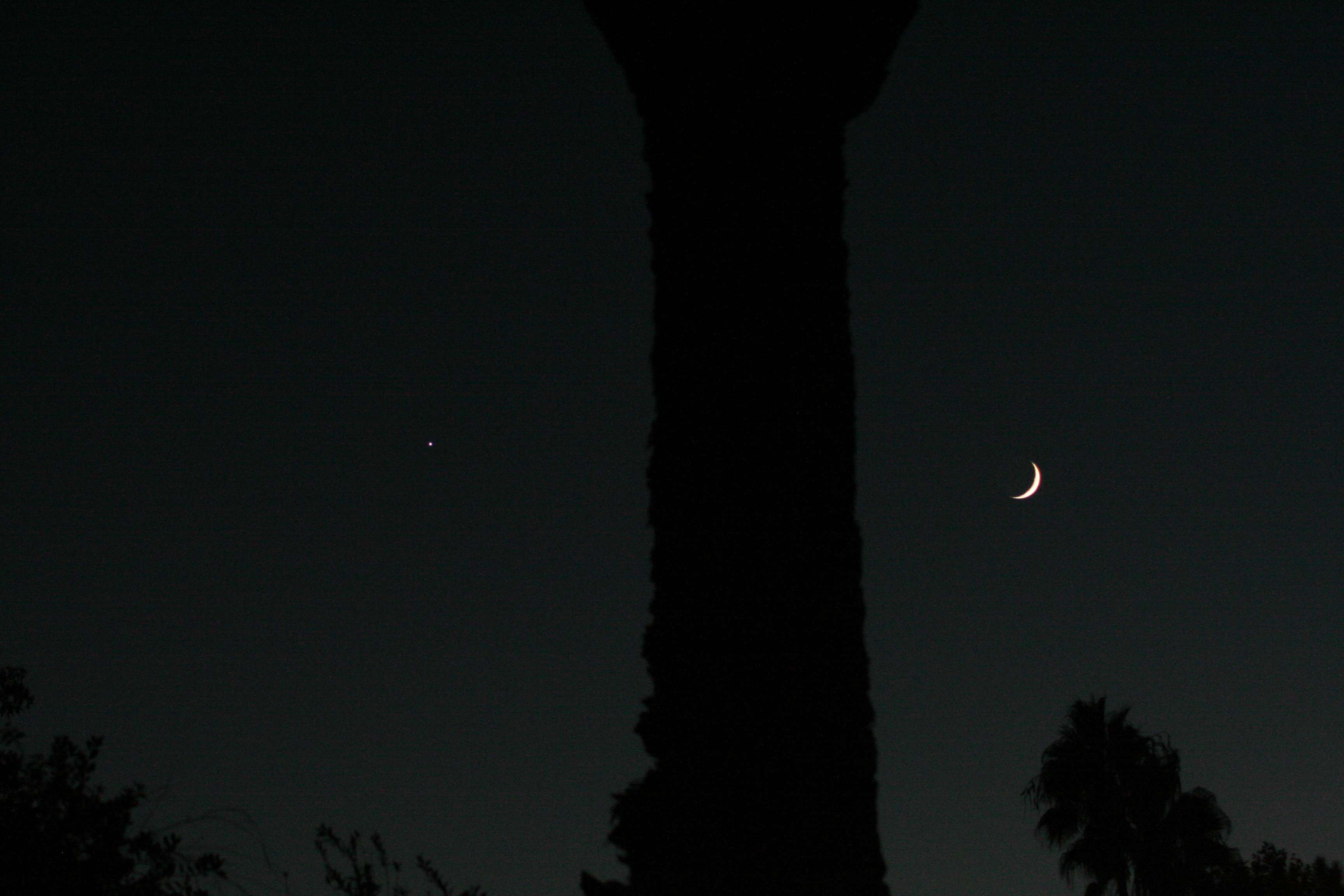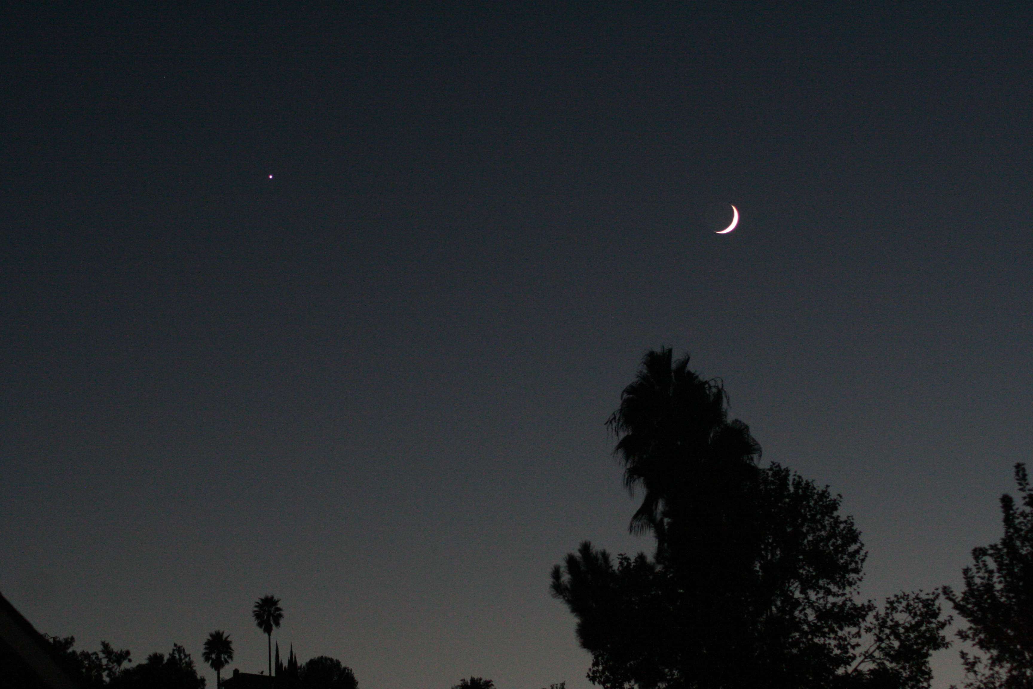 I just took these pictures of the setting crescent moon and Venus eight to ten minutes ago. If you’re on the US West Coast and it’s not cloudy, for the next half hour or so you can go see the same thing in your western sky!
