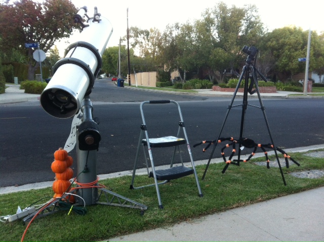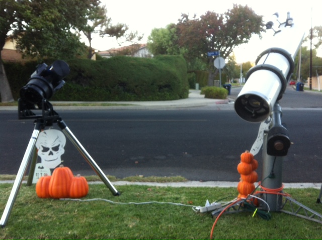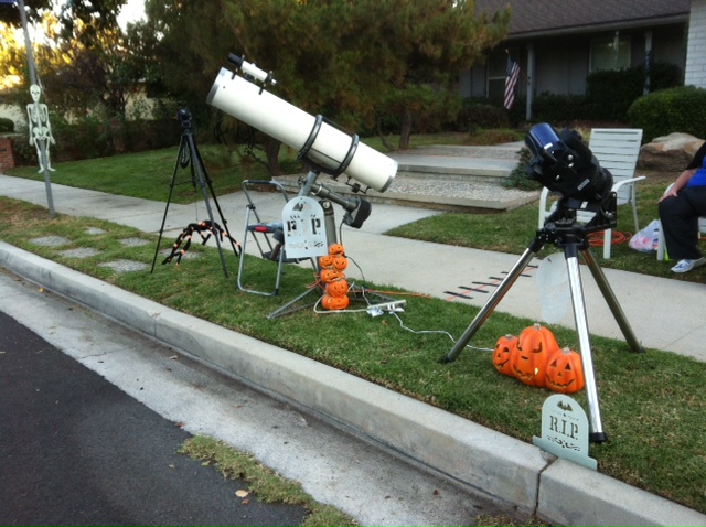 As mentioned elsewhere, when the weather on Halloween allows it, we take a couple of telescopes out by the sidewalk and let people take a look while we’re handing out the candy. Last year, when it was cloudy, we had a decent percentage of folks asking why we didn’t have them out. Apparently we’ve become a minor “thing” in the neighborhood. Last night, the weather was perfect.