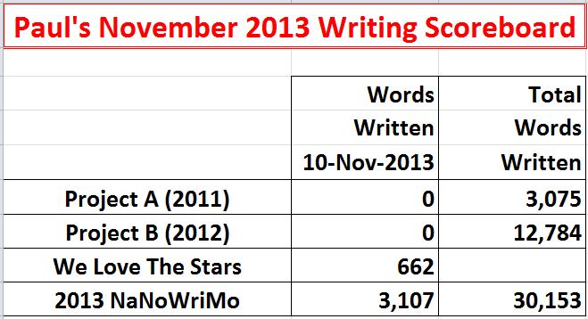 To continue the running/marathon analogy, I had a great pace and was going strong — but now I’ve stumbled. My rhythm has been broken. I realize now just how hard I was pushing myself for this first week and I would really like a break – but one does not take breaks while running a marathon, if one can avoid it! While I’m still making progress, I feel a little bit like the football player who’s just caught a toe while running at full stride. (The analogy works for either version of “football”.) My figurative arms are windmilling and my figurative strides are uneven as I try to catch my balance and reset my stride, or, if that fails, at least go down semi-gracefully and not get hurt and knocked out of the game. So it will be important to see if I “fall” (i.e., end up with little or no output for NaNoWriMo for a day or two) or if I can “recover” (i.e., pick up the pace again and get back on track) in the next day or two.