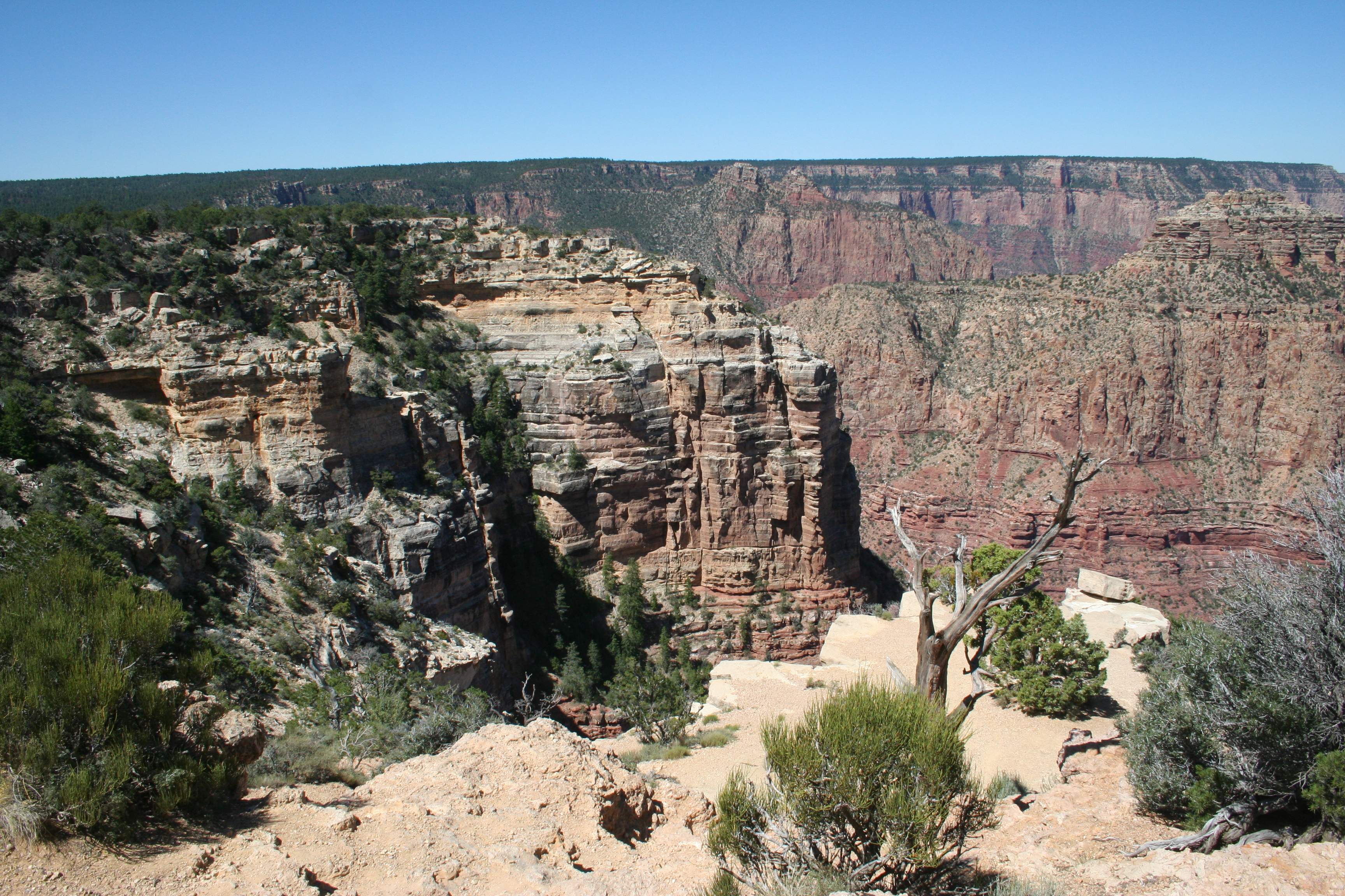 From Moran Point you can see several structures like this one, like long, narrow fins sticking out into the canyon. The top is covered with layers of harder rock that protects the rock underneath it, while everything on the sides erodes away. On this one, the rocks at the top got tilted up at an angle at some point after being formed horizontally by sediment. Given fifty million years or so, it’s amazing what you can accomplish.