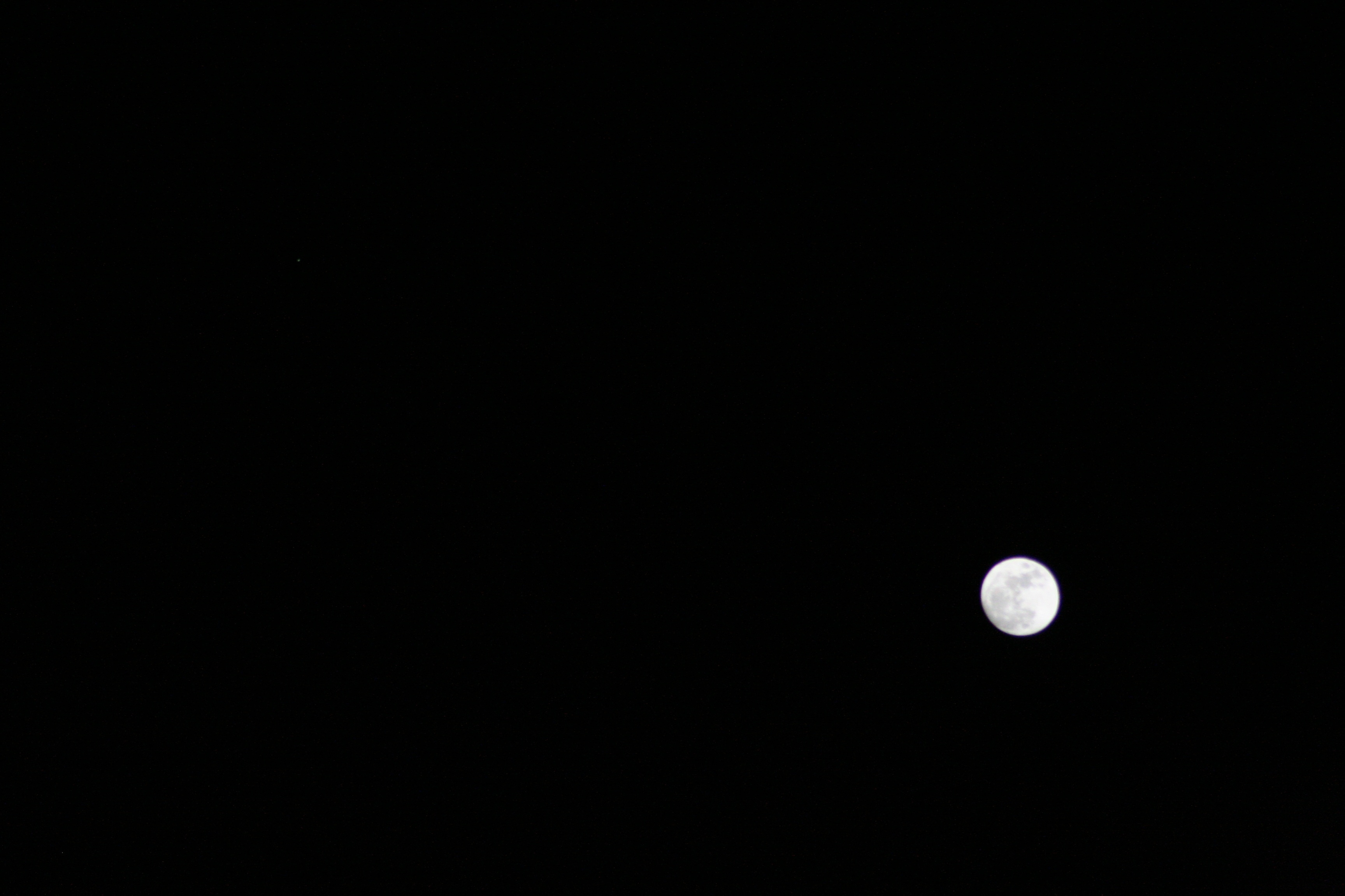 This is that very first picture, at 1/4000 second. In the lower right, of course, is the full moon and in the upper left is a little dot that’s Jupiter. (You should click on the images to get the full sized versions, it’s much easier to see what I’m talking about.) This is a great example of just how bright the full moon is and how big the dynamic range is between the two objects. You can actually see the big features of the moon pretty well, even with this simple setup. Even at this fast, FAST exposure, the full moon is starting to be overexposed. Yet Jupiter is just a dot, barely seen, which is not unexpected since this was a really short exposure.