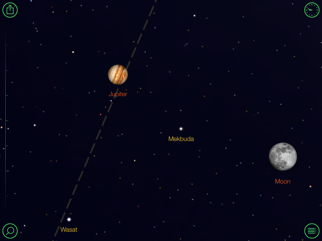 Image from the Star Walk iPad app. It looks a bit like this. Jupiter obviously isn’t shown to scale, although the moon’s size is probably close to being the correct size.