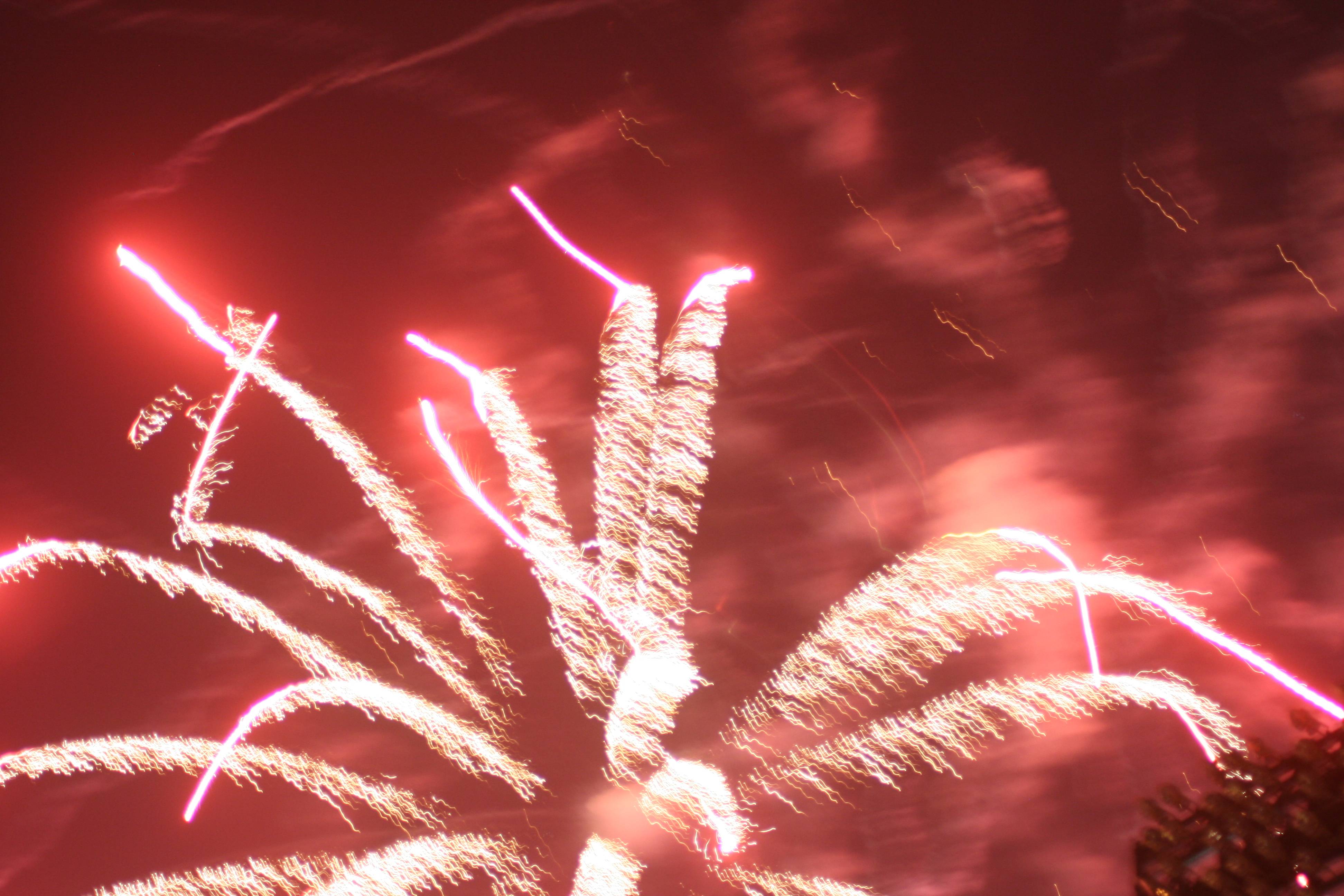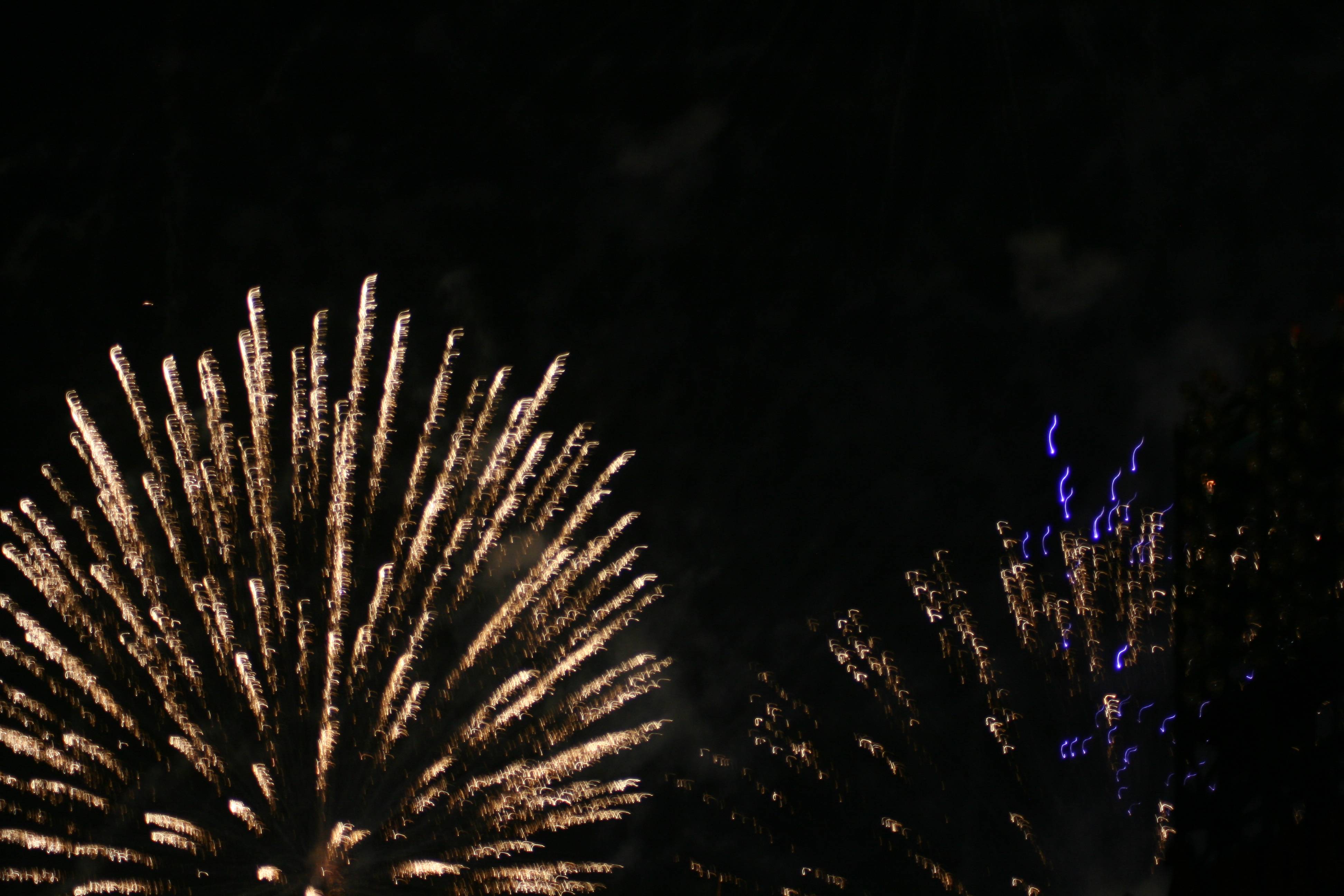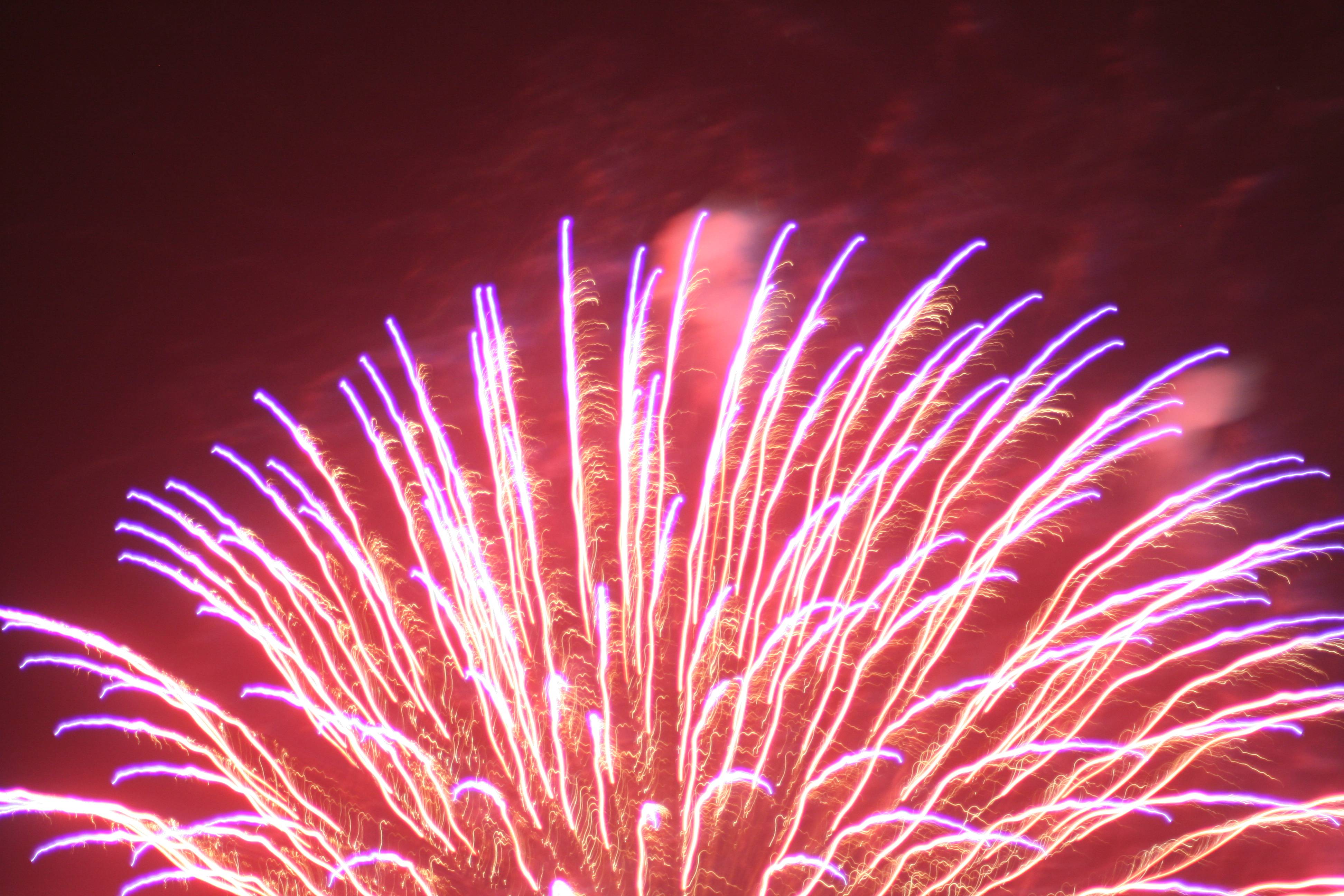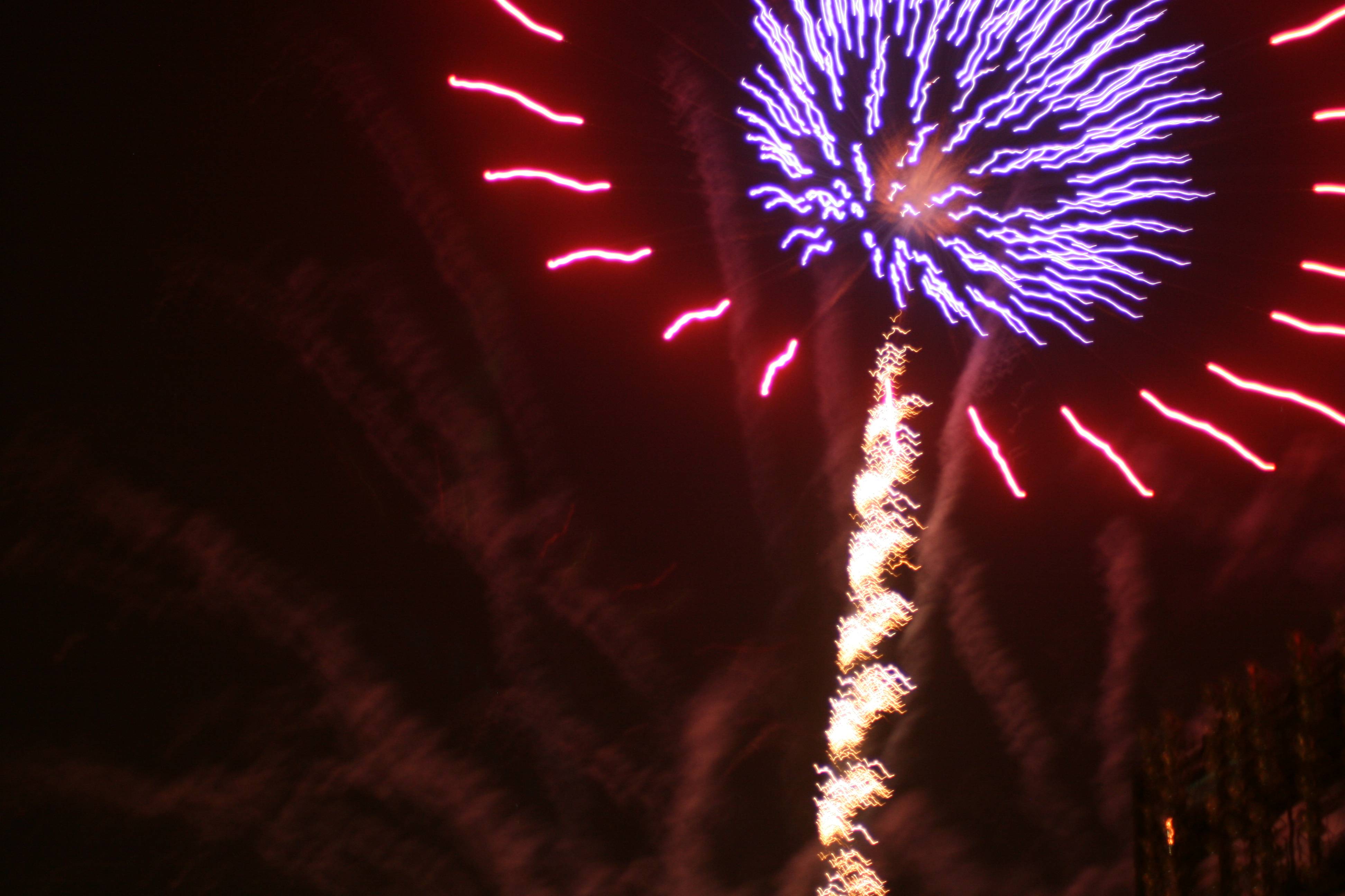 • For some reason (probably a screw-up on my part) the focus was ever so slightly off. (Never leave your camera on auto-focus when shooting fireworks. It will go nuts and try to focus in and out and in and out, spending half of the time trying to lock onto a quickly moving set of bright lights on a very dark background. Switch the focus to manual, set at infinity, and leave it there — if they’re not in focus then, you’re too damn close to the fireworks and you’re gonna die!)