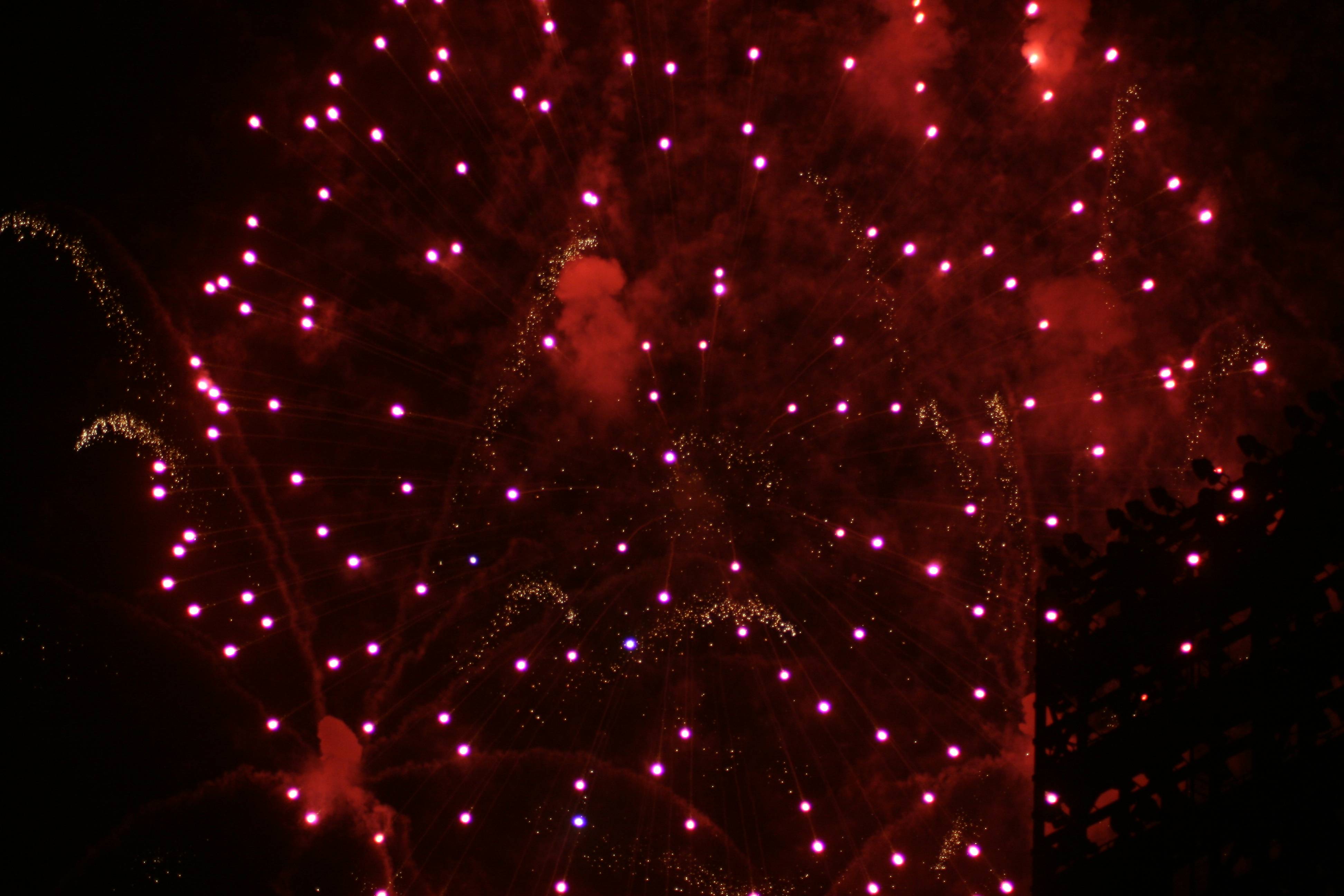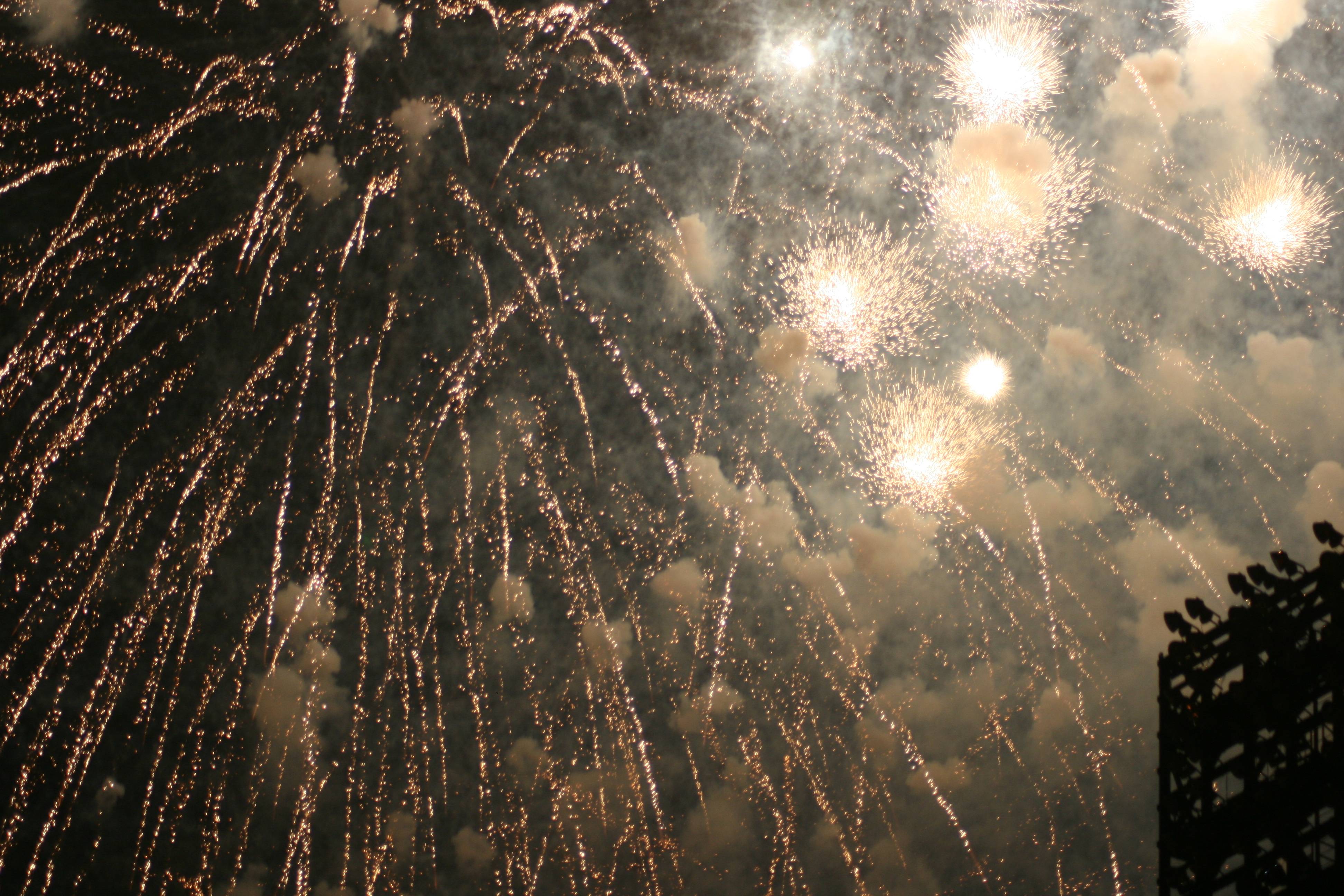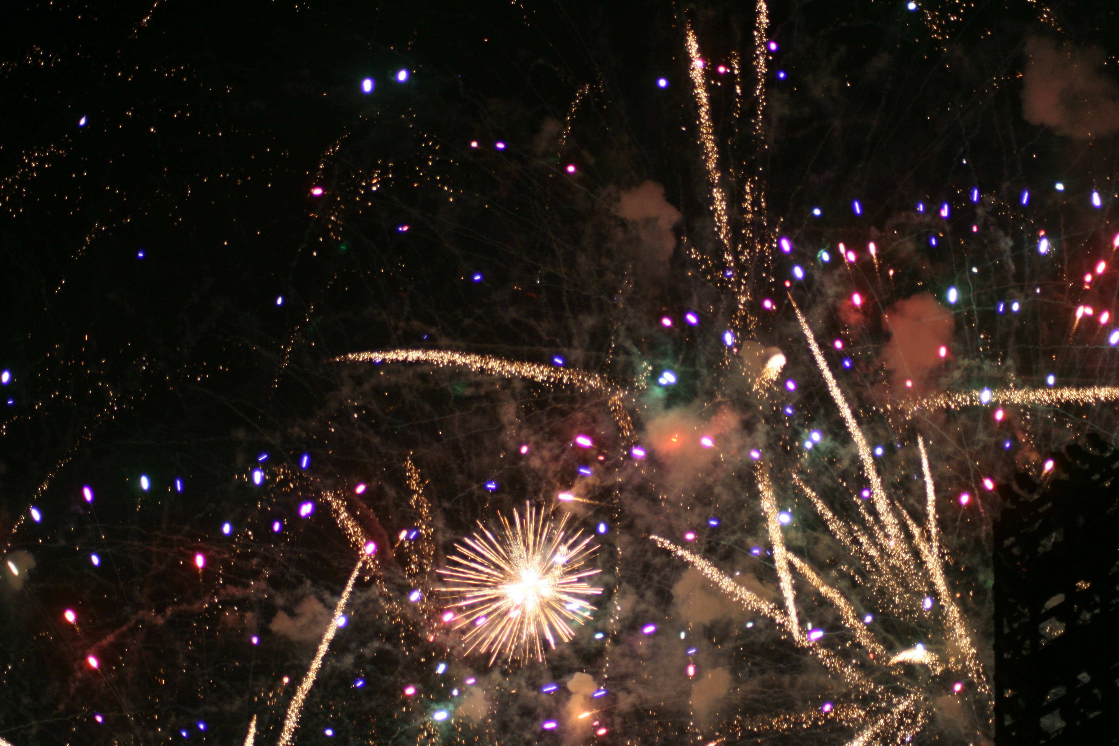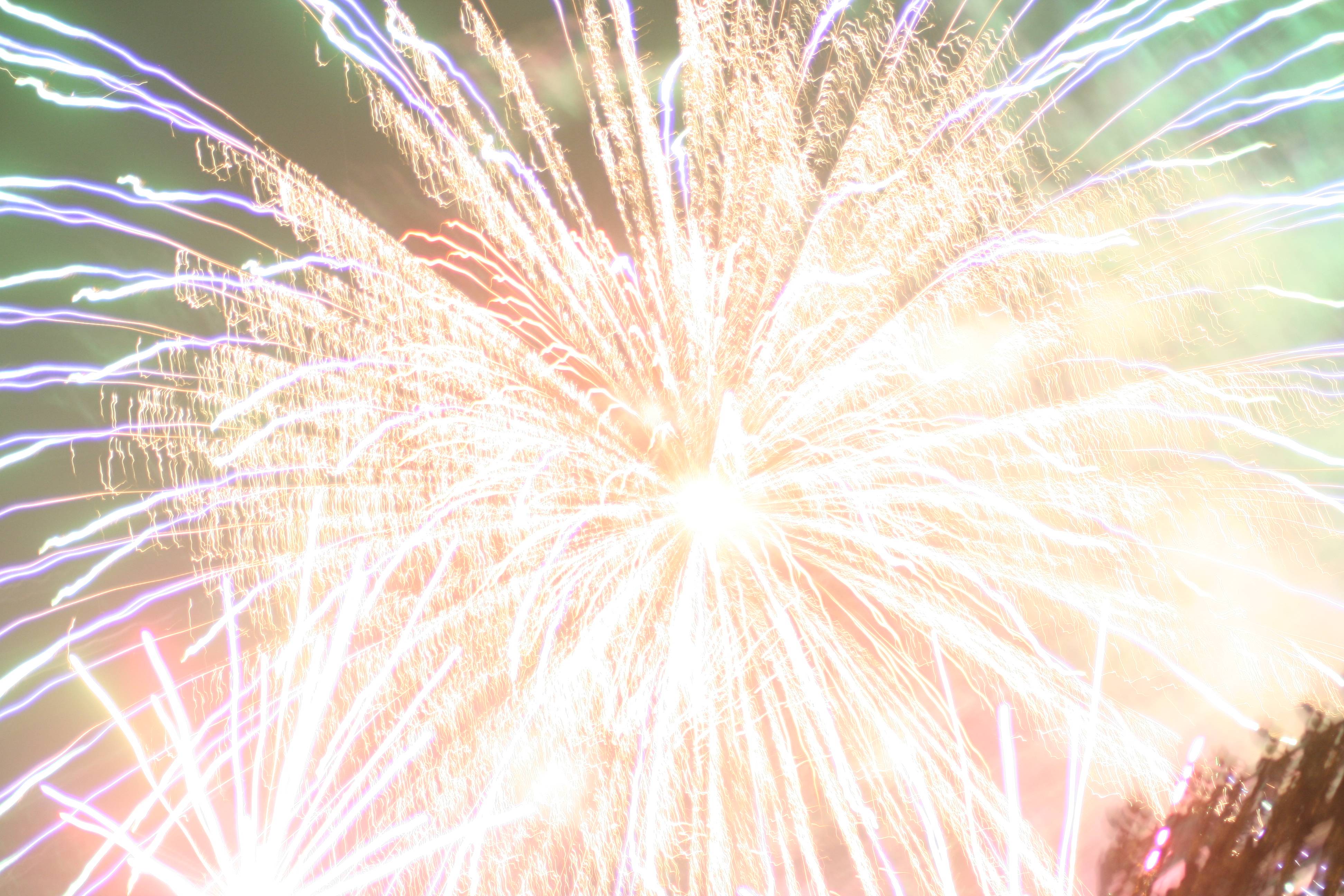 • For some reason (probably a screw-up on my part) the focus was ever so slightly off. (Never leave your camera on auto-focus when shooting fireworks. It will go nuts and try to focus in and out and in and out, spending half of the time trying to lock onto a quickly moving set of bright lights on a very dark background. Switch the focus to manual, set at infinity, and leave it there — if they’re not in focus then, you’re too damn close to the fireworks and you’re gonna die!)
