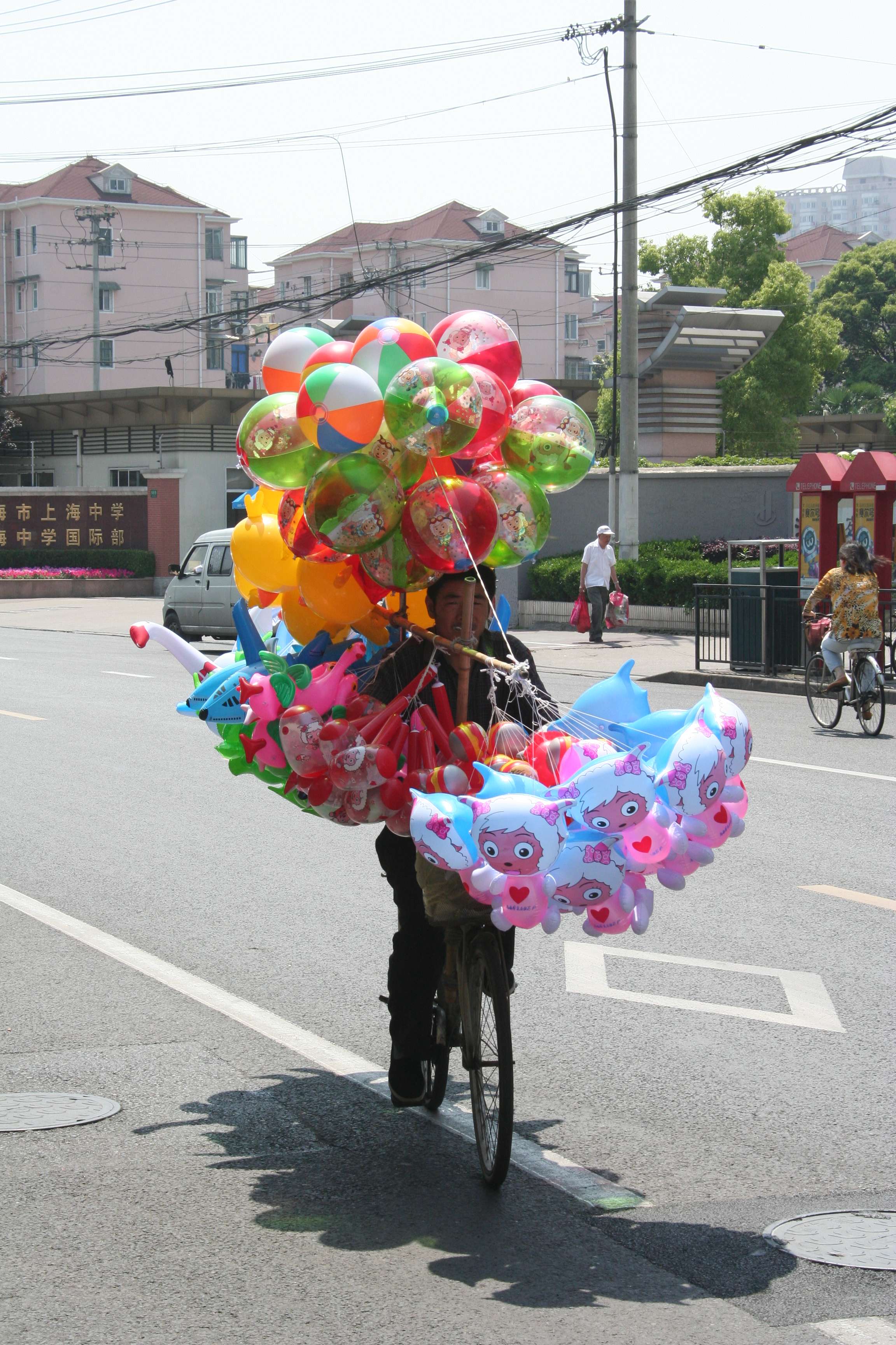 Along with all of the tiny shops, you could also find vendors on bicycles, so overloaded that it seemed impossible that they could move, let alone move safely. This guy at least had balloons instead of dozens and dozens of boxes of food & merchandise.
