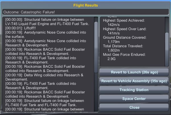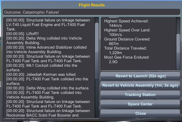 Cool! “Catastrophic Failure!” We only got to 520 meters and 142 meters/second, before impacting at 2.7 Gs. On impact we also managed to take out the Space Plane Hanger! That’s how a highly experimental space program is supposed to start, with epic failure! Sorry, “catastrophic” failure!