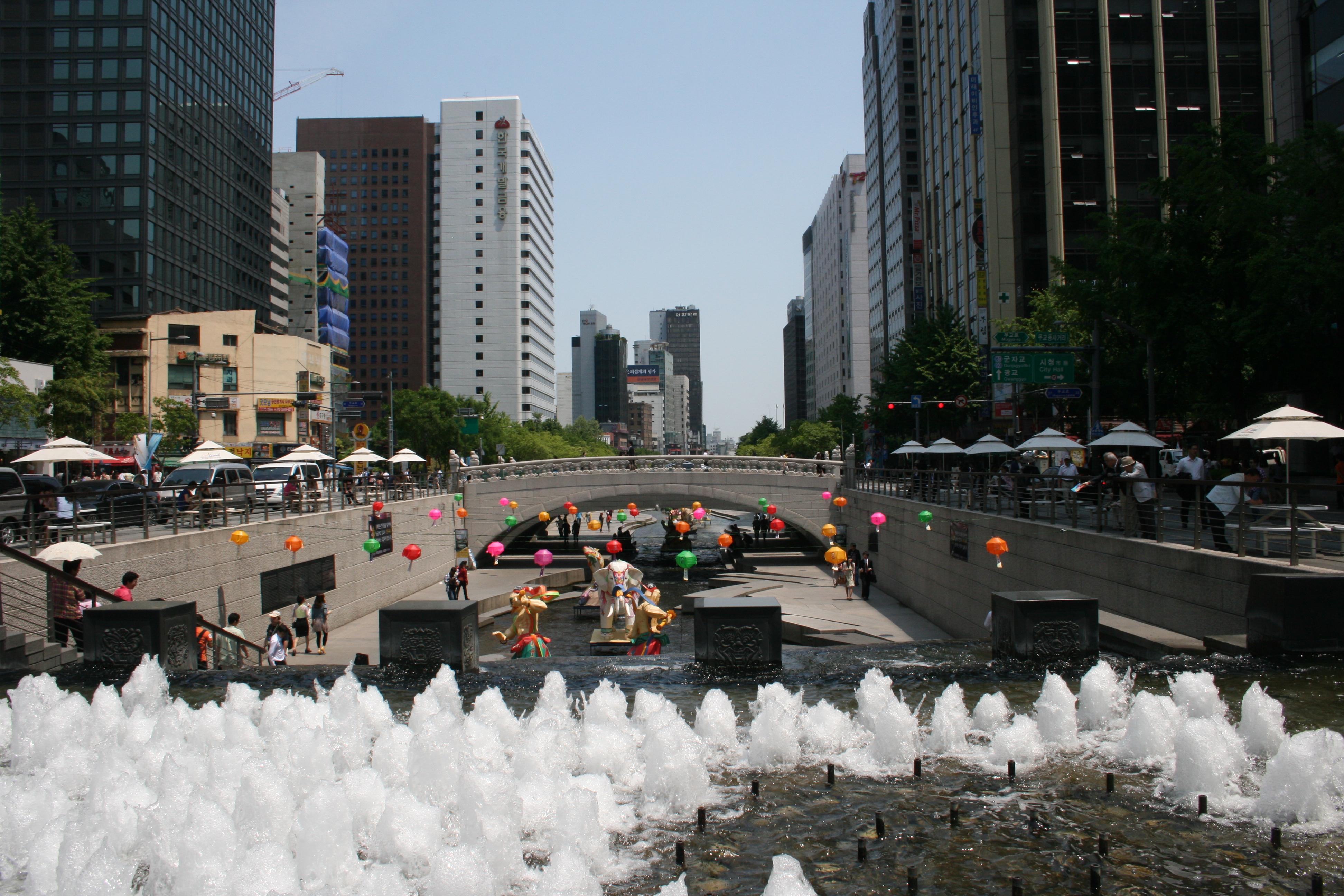 The Cheonggyecheon Stream runs down the middle of one of the east-west boulevards. With fountains at the west end, it runs toward the east with the “river bed” accessible to everyone.