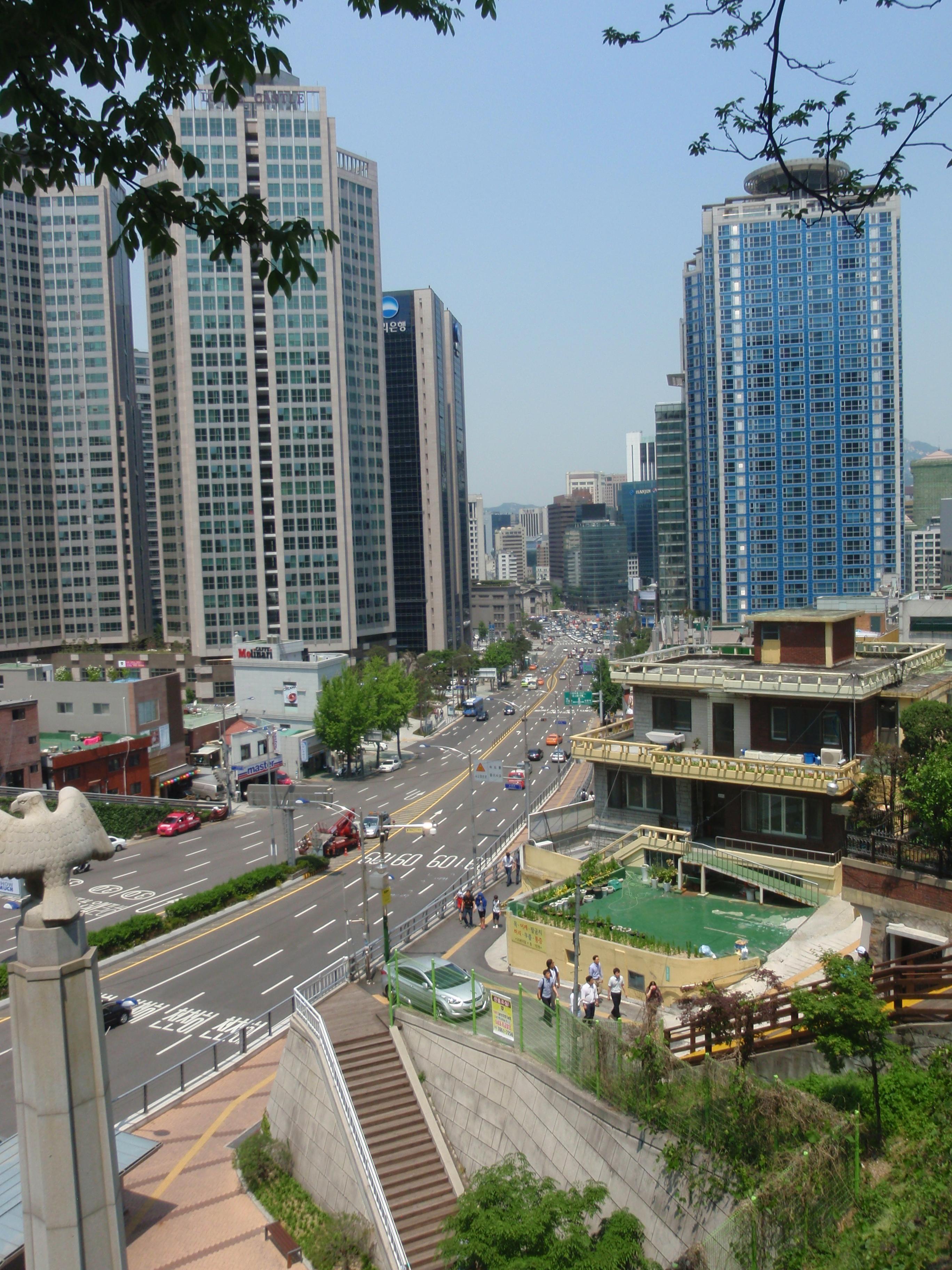 After starting at the Seoul Tower in Namsan Park, we started walking down the hill toward the nearby Jongno-gu business district. (It is to the north of Namsan Park, between the tower and the Gyeongokgung Palace.) Just before we got to the bottom of the mountain, this is the view to the north.