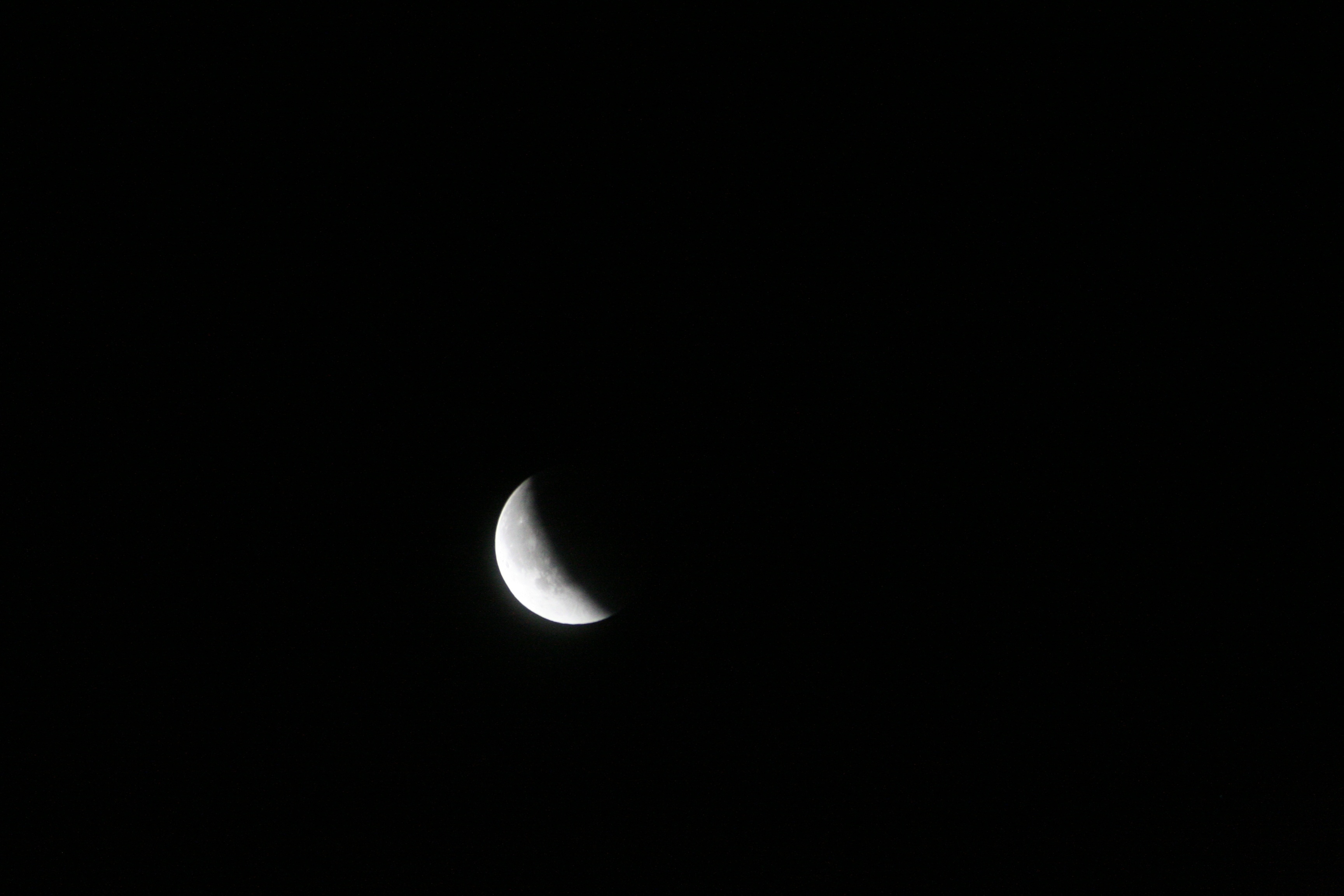 Okay, tech stuff out of the way first. The pictures with the moon only filling a small part of the frame were taken with a Canon Rebel XT DSLR using a Tamron 75-300 mm zoom lens, mounted on a tripod. The pictures where the moon fills the frame (and then some) were taken with a Canon Rebel XTi DSLR attached to a 5″ Meade ETX-125EC telescope mounted on an equatorial fork mount.
