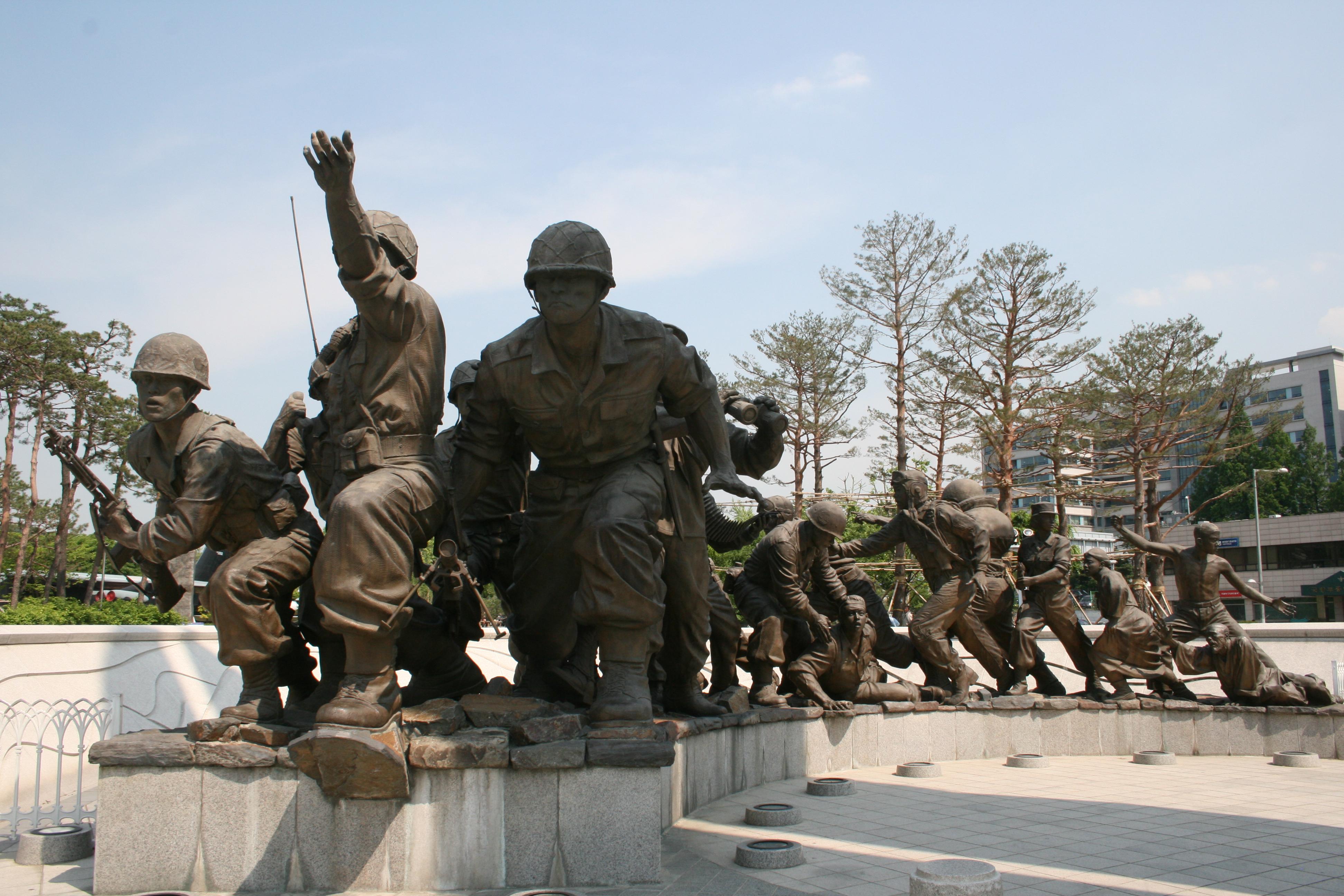 One side of the arc of bronze sculptures shows the United Nations and United States soldiers coming to the aid of South Korea.