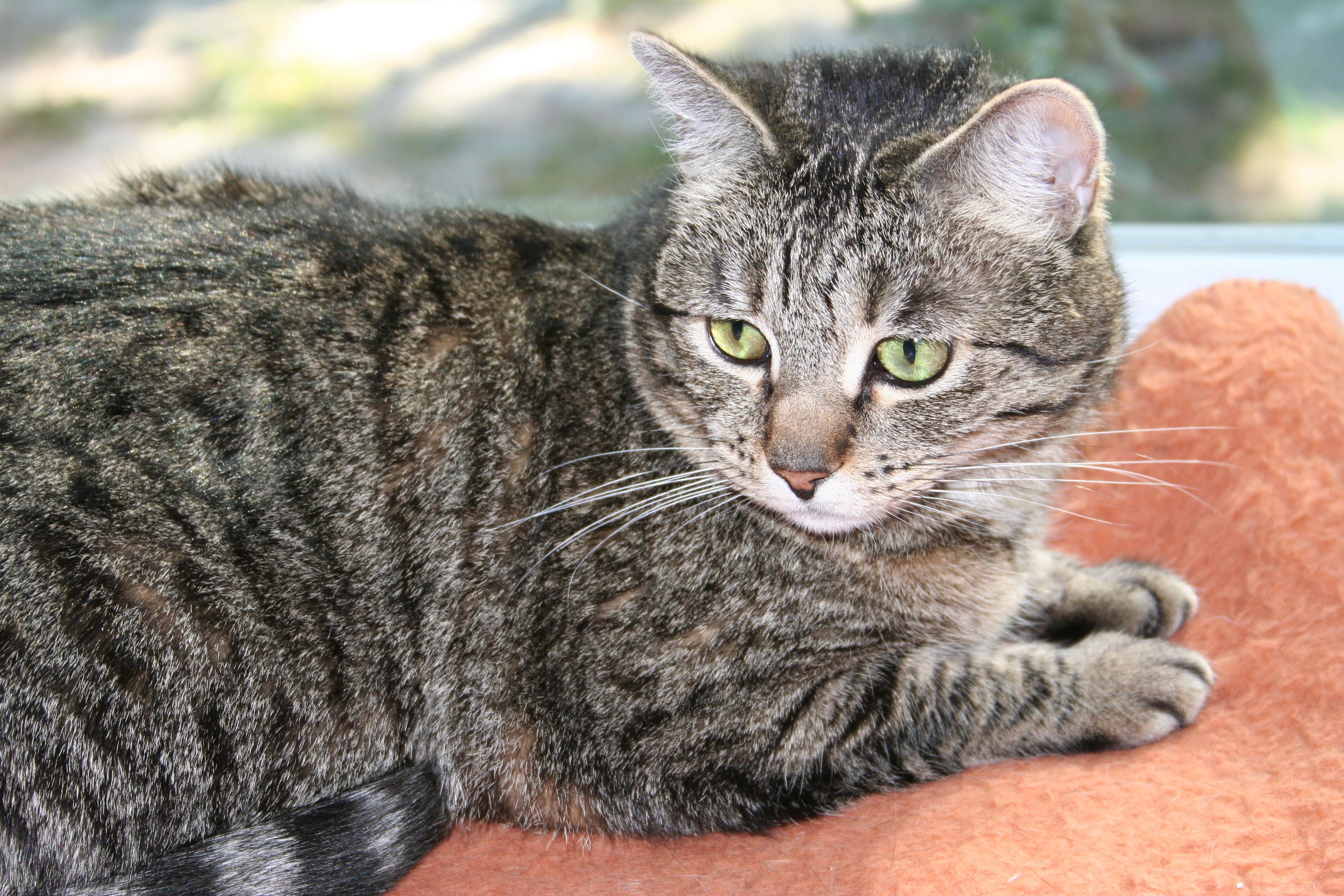 Instead of thinking, have a couple of cat pictures from when I got my first DSLR at Christmas of 2005. I had bought the camera less than a week earlier and was still playing with buttons and learning what setting did what. Joey-from-almost-eight-and-a-half-years-ago made a good test subject. This bay window (recently installed at that time) was already her favorite place — still is.