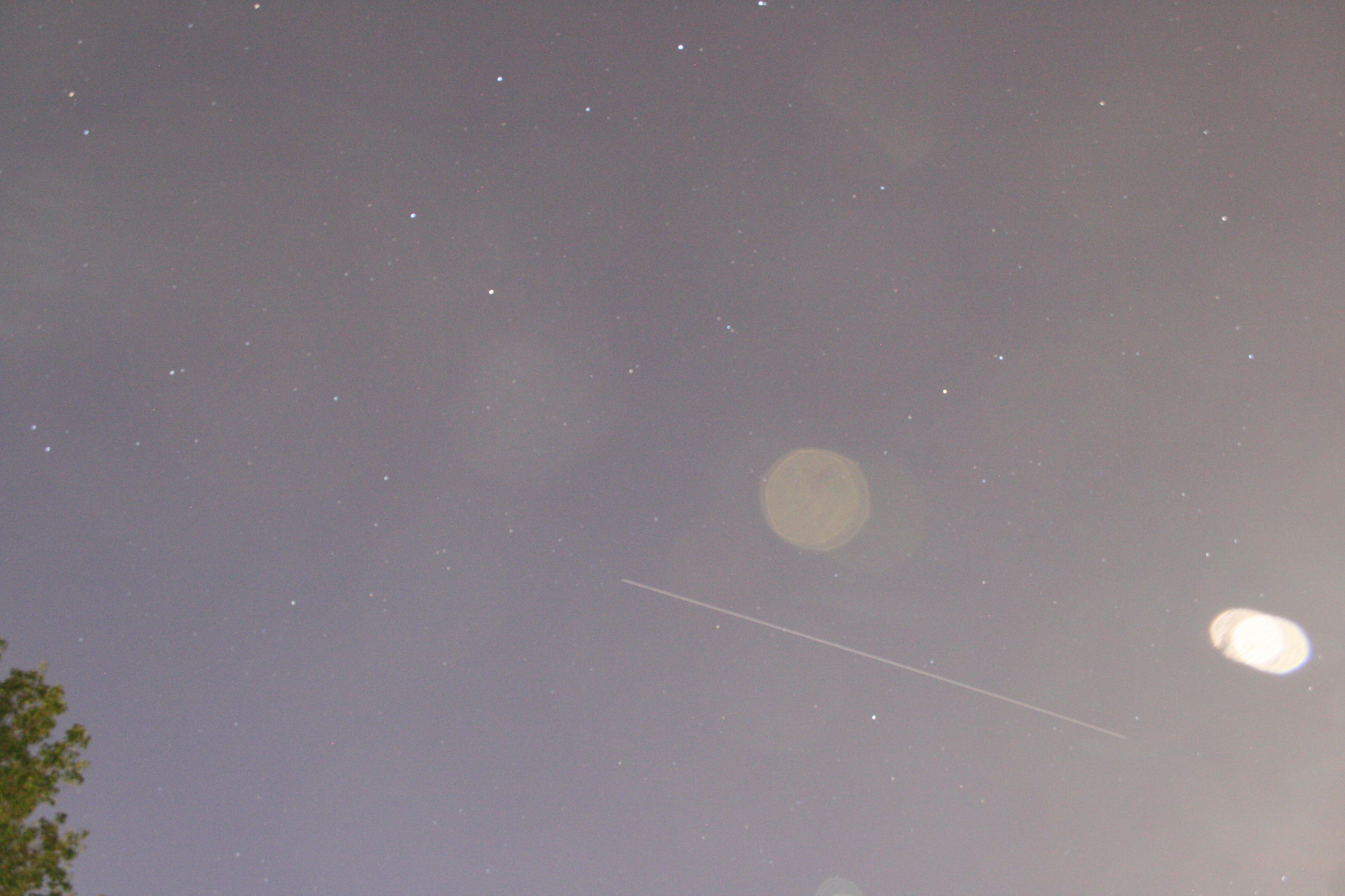 Another 31-second exposure, coming from the lower left (west southwest from this view) to the upper right (almost due north). The Long-Suffering Wife came out to watch this pass with me. She was treated to the sight of me gallivanting insanely across the street and back carrying camera gear and tripods.