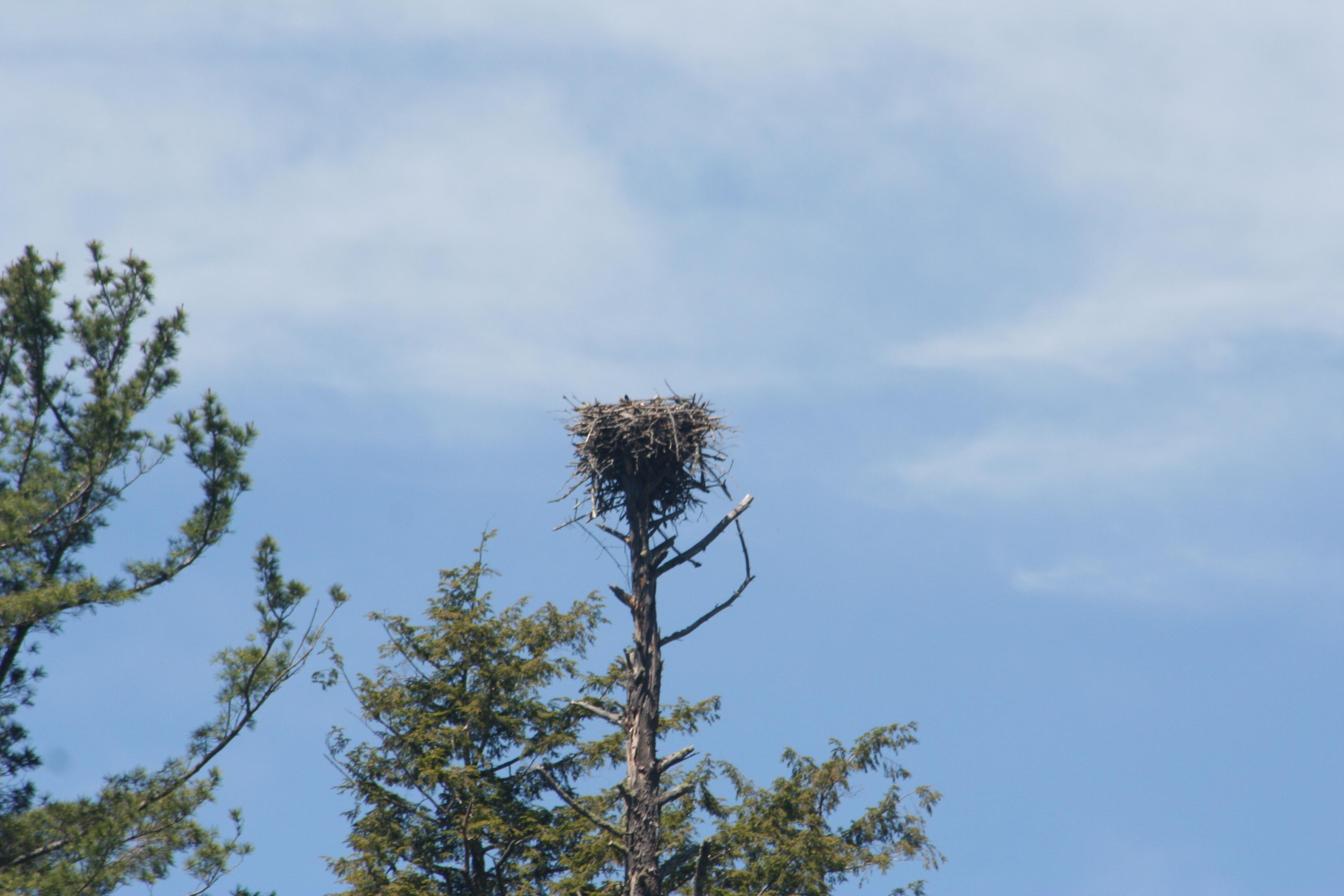 There is wildlife all over the place. We saw a pair of loons, a blue heron, and this bald eagle nest, which has now been stolen by an osprey, who you can just see sticking his head up over the edge. There are sightings of deer, moose, bear, and all sorts of smaller critters such as skunks, porcupine, raccoon, and so on.