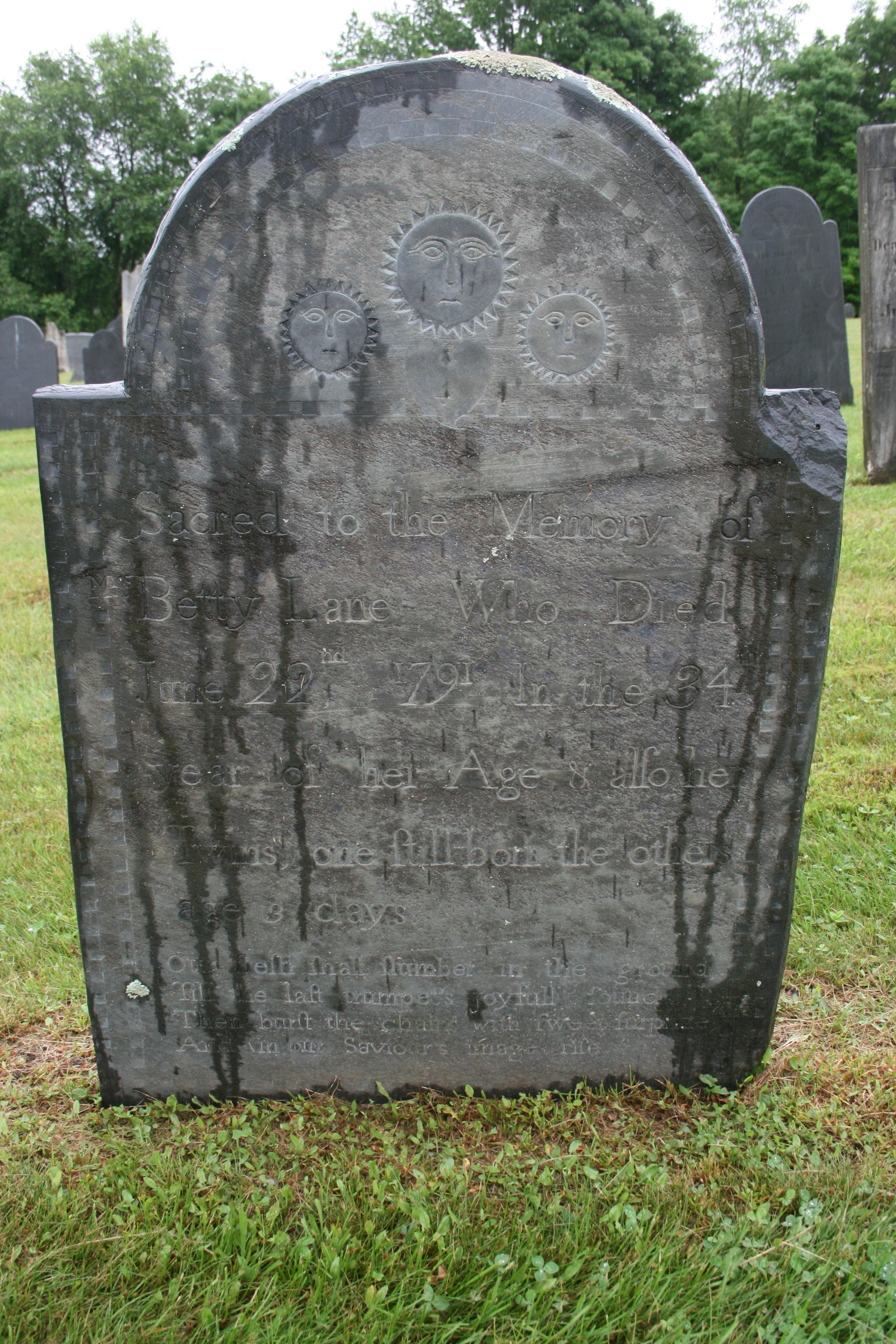 “Sacred to the Memory of Betty Lane Who Died June 22nd 1791 In the 34 year of her Age & alfo her Twins, one ftill-born the others age 3 days” (I’m quoting verbatim, including the archaic spellings, which often use an “f” where we would use an “s.”)