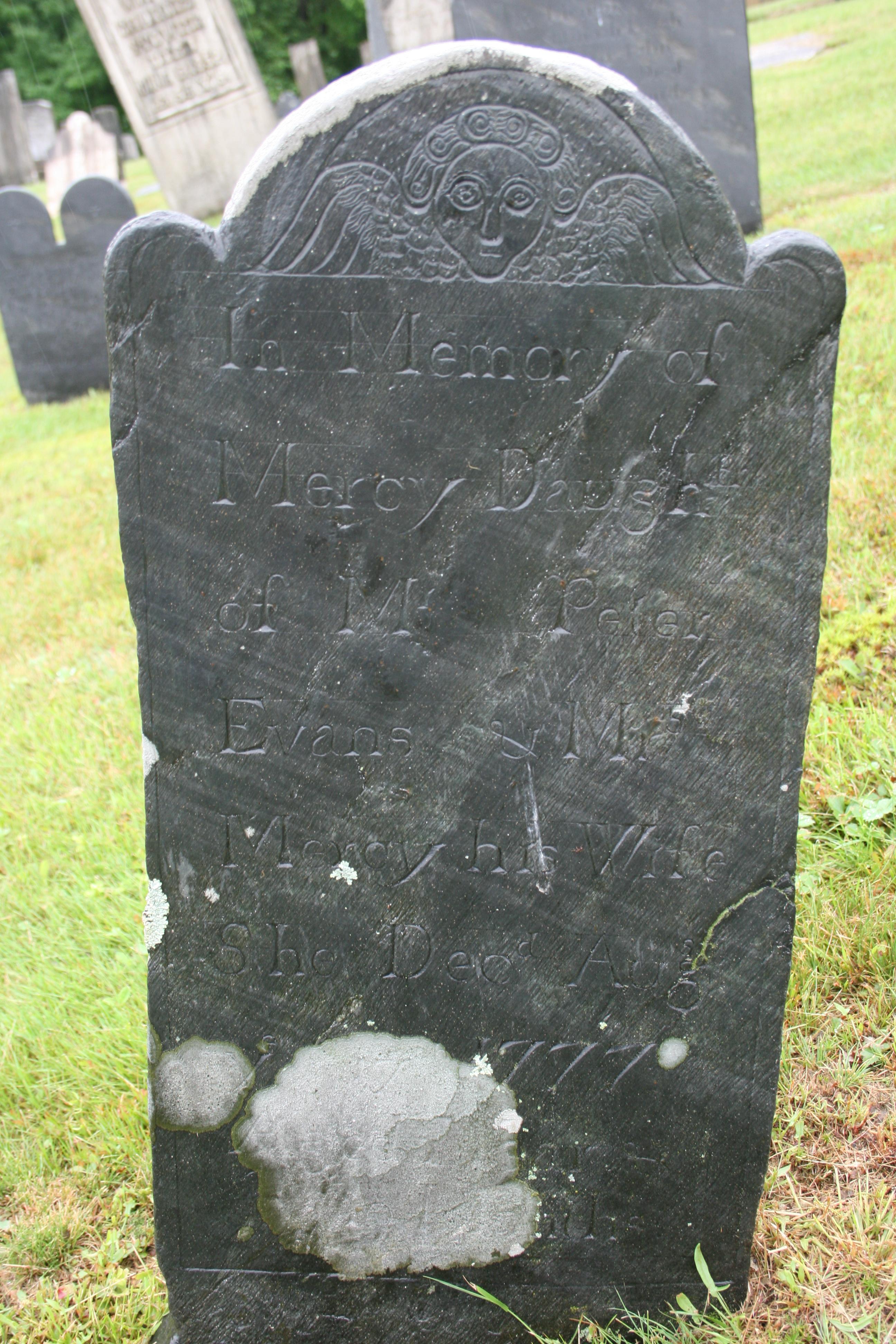 “In Memory of Mercy Daugh’tr of Mr Peter Evans & Mrs Mercy his Wife She Dec’d Aug [illegible] 1777”