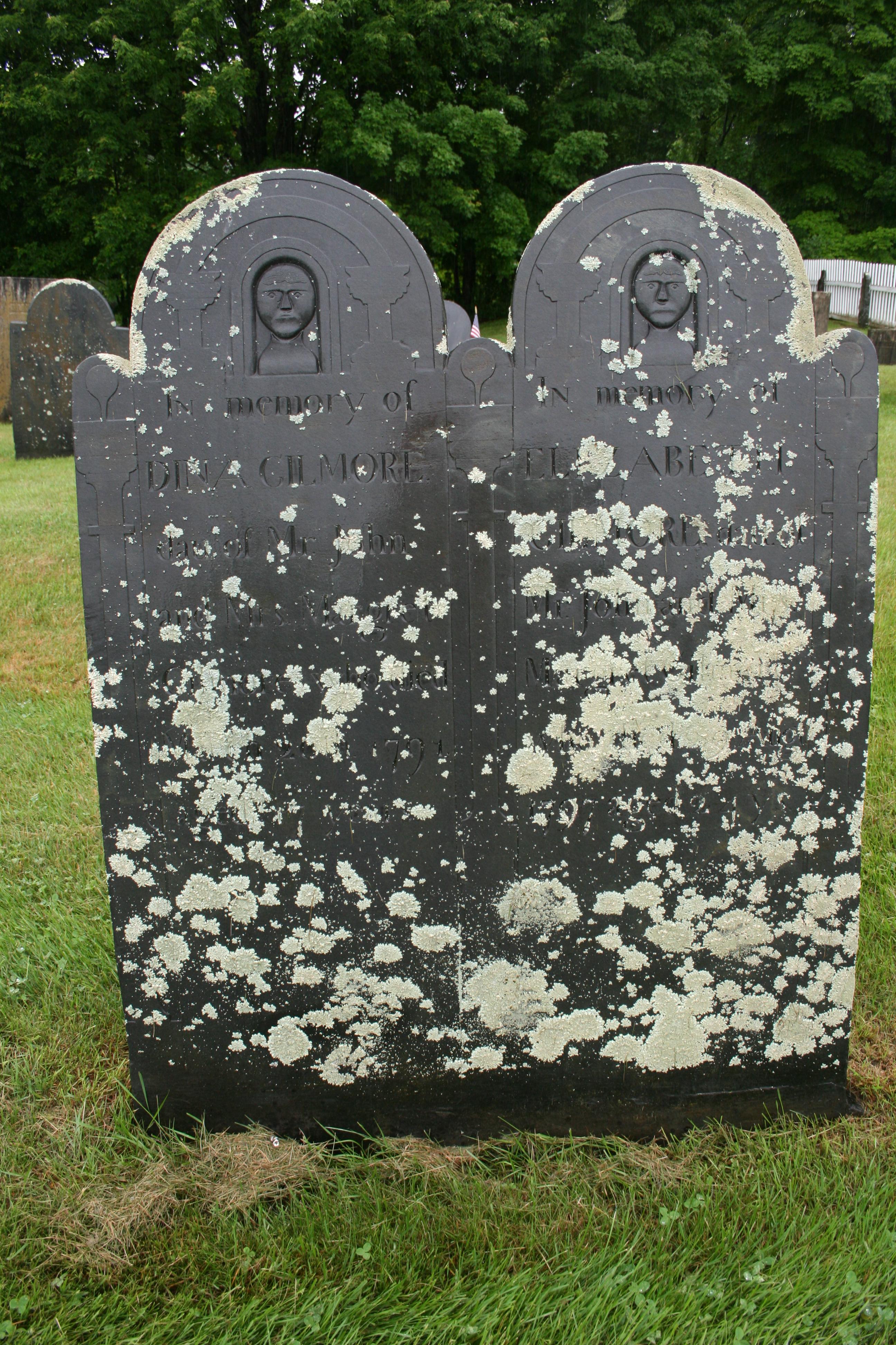 This one’s pretty illegible all the way around due to the moss and lichen growing on it, but that was part of the reason I liked it. “In memory of Dina Gilmore,” daughter of Mr. John and Mrs. Margaret [illegible], died some time in March, 1791. “In memory of Elizabeth Gilmore,” also daughter of John & Margaret, died in 1797, aged 24 years (maybe).