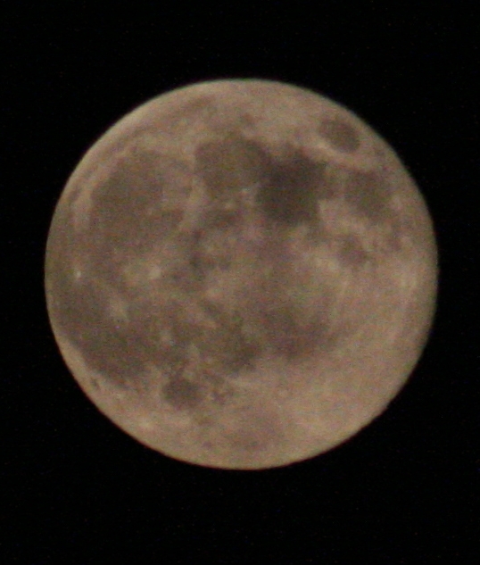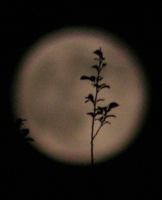 The full moon came up behind the trees to our southeast. Note that he full moon is BRIGHT if you’re using a telephoto lens or telescope. Obviously not as bright as the sun, but if you try to photograph it taking up any decent part of the frame, you’ll need to take really fast exposures to get any detail. All of the closeup photos here tonight were taken at 1/4000 second, the fastest my Canon Rebel XTi DSLR will go. (I was using a Tamron 75-300 zoom lens.)