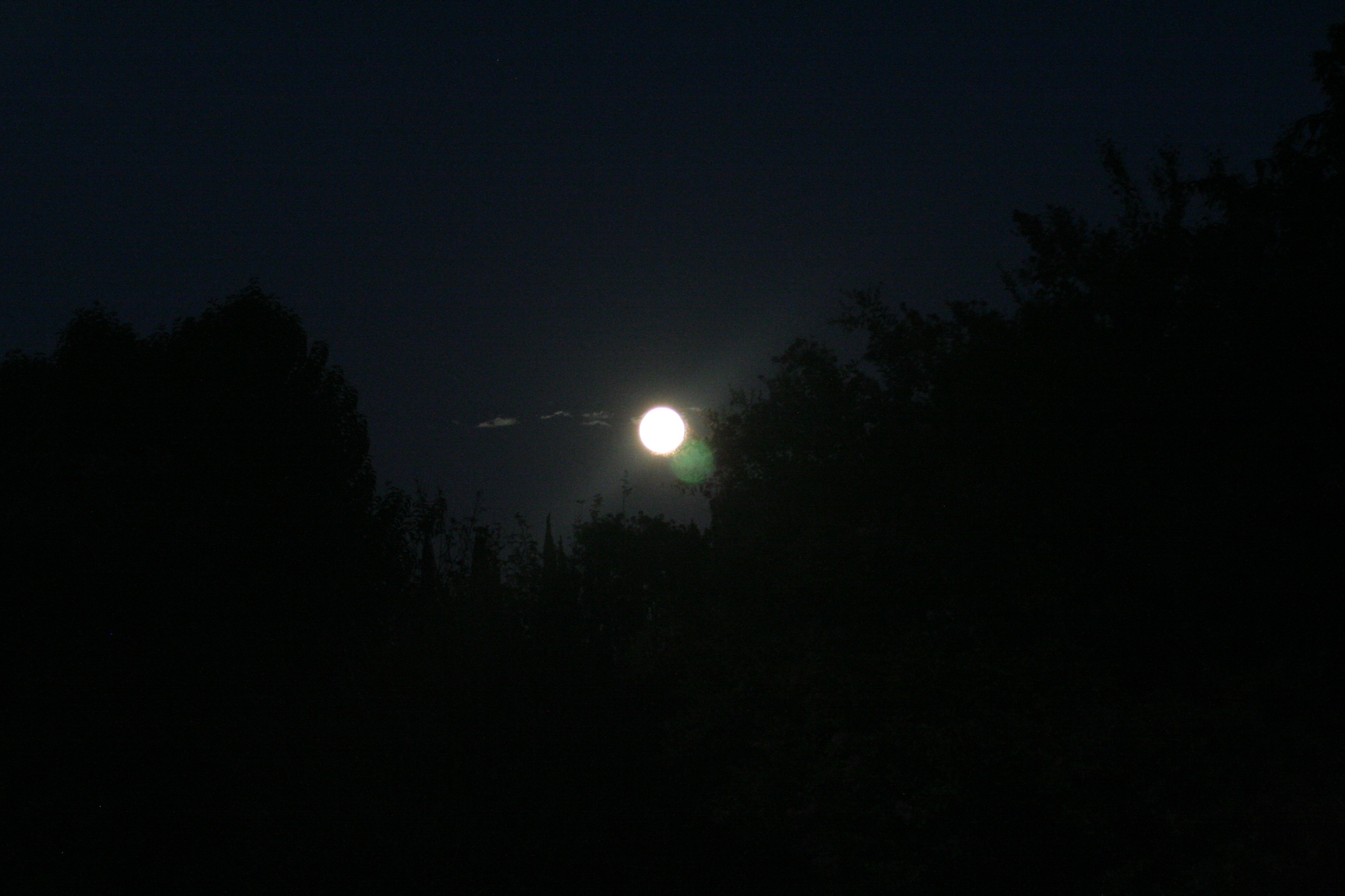 Zooming back out and taking much longer exposures, you see the trees silhouetted and a few thin clouds near the moon. (This is a 1/13 second exposure, over 300 times longer than the closeups above.)