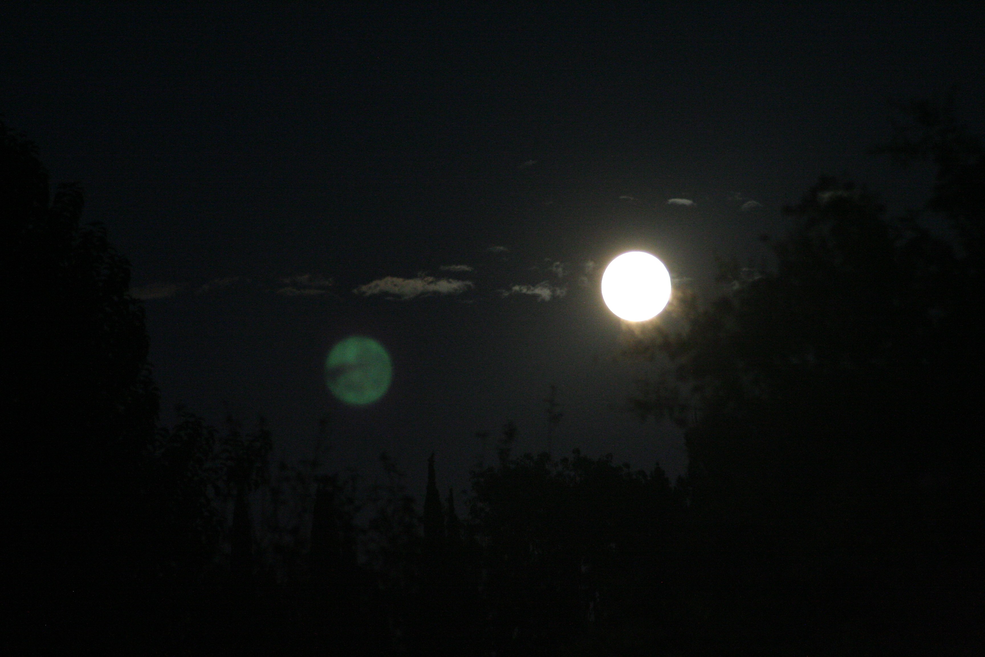 Of course, in taking longer exposures to bring out the trees and clouds, especially if you zoom in just a bit (thus brightening the moon), you completely overexpose the moon and start to pick up some “ghost” reflections inside the lens.
