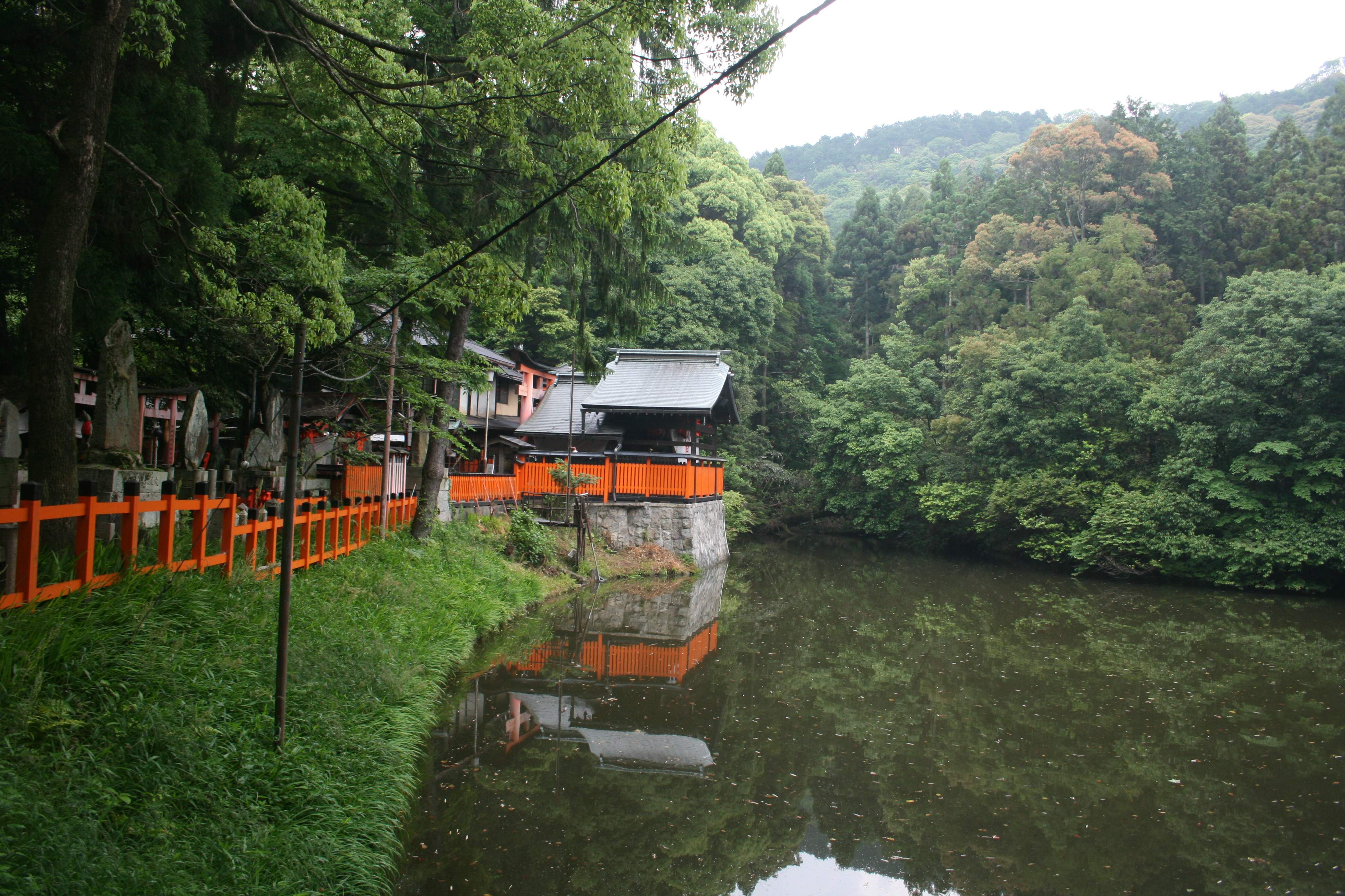 Each shrine off on a side path seemed to have slightly different architecture or style, yet all had the unifying themes seen everywhere. (Torii gates, vermilion colors, statues of foxes wearing vermilion scarves, and so on.)