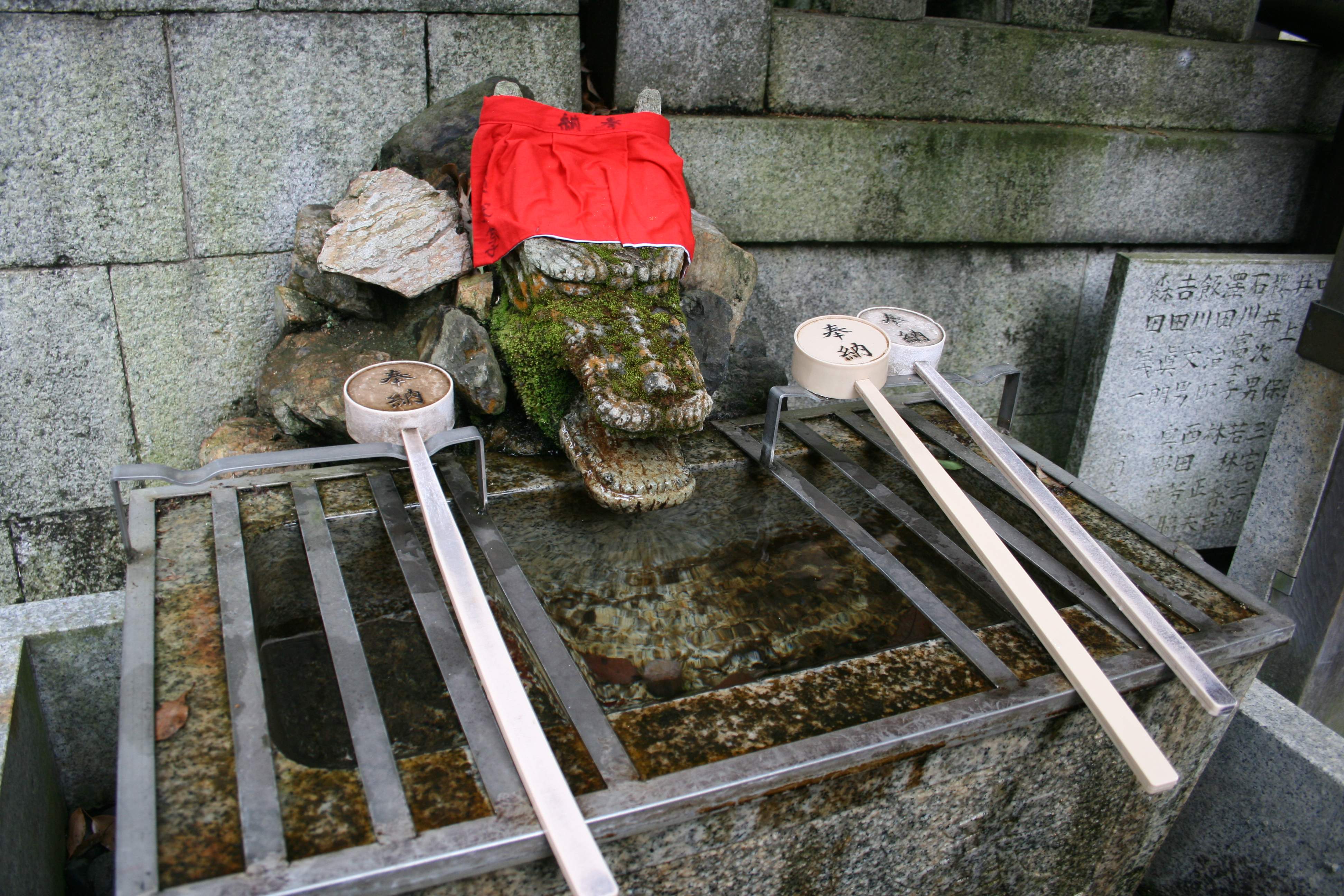 Near the top I found another fountain with ladles, this time guarded by an alligator statue. But it’s still wearing a vermilion yodarekake.