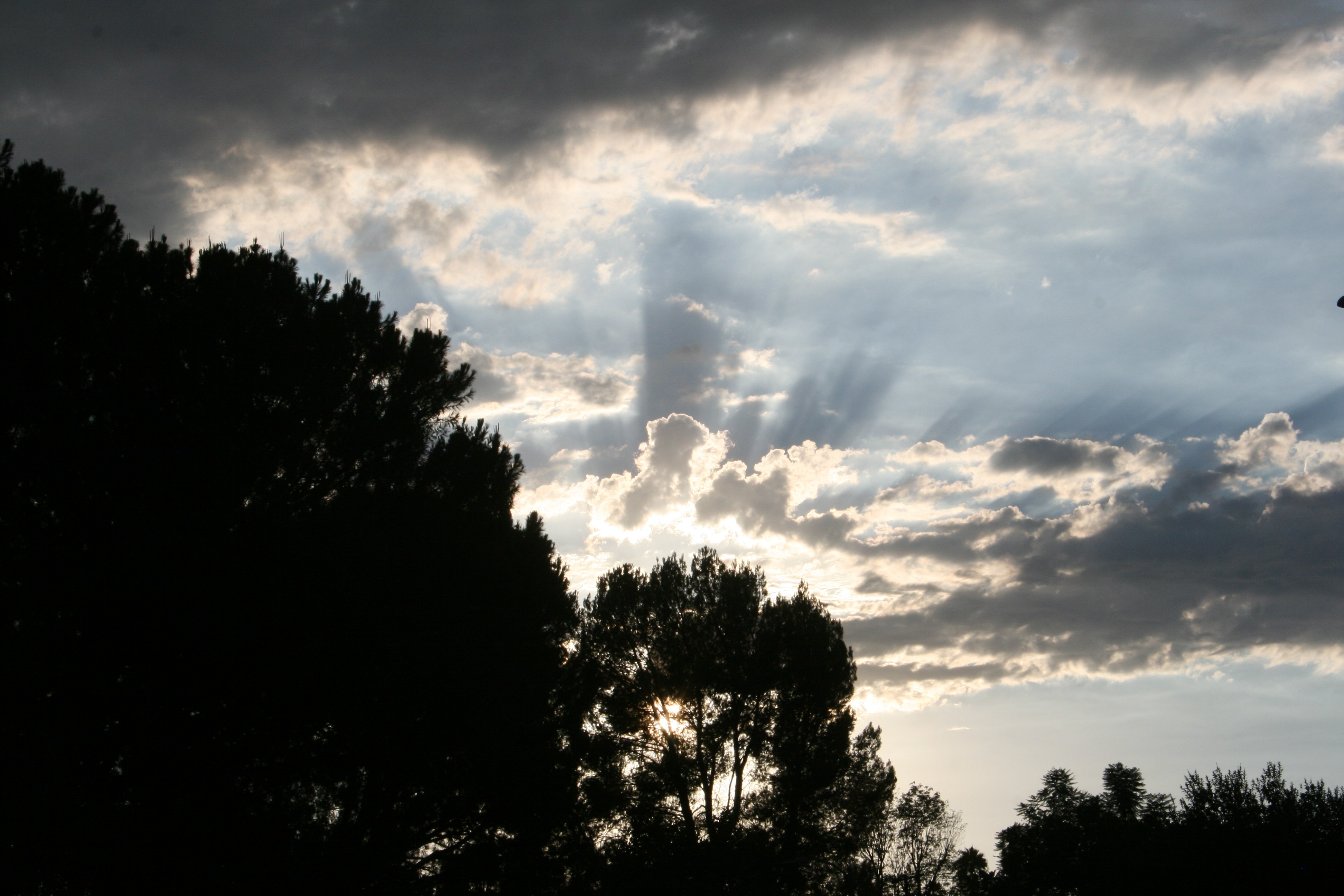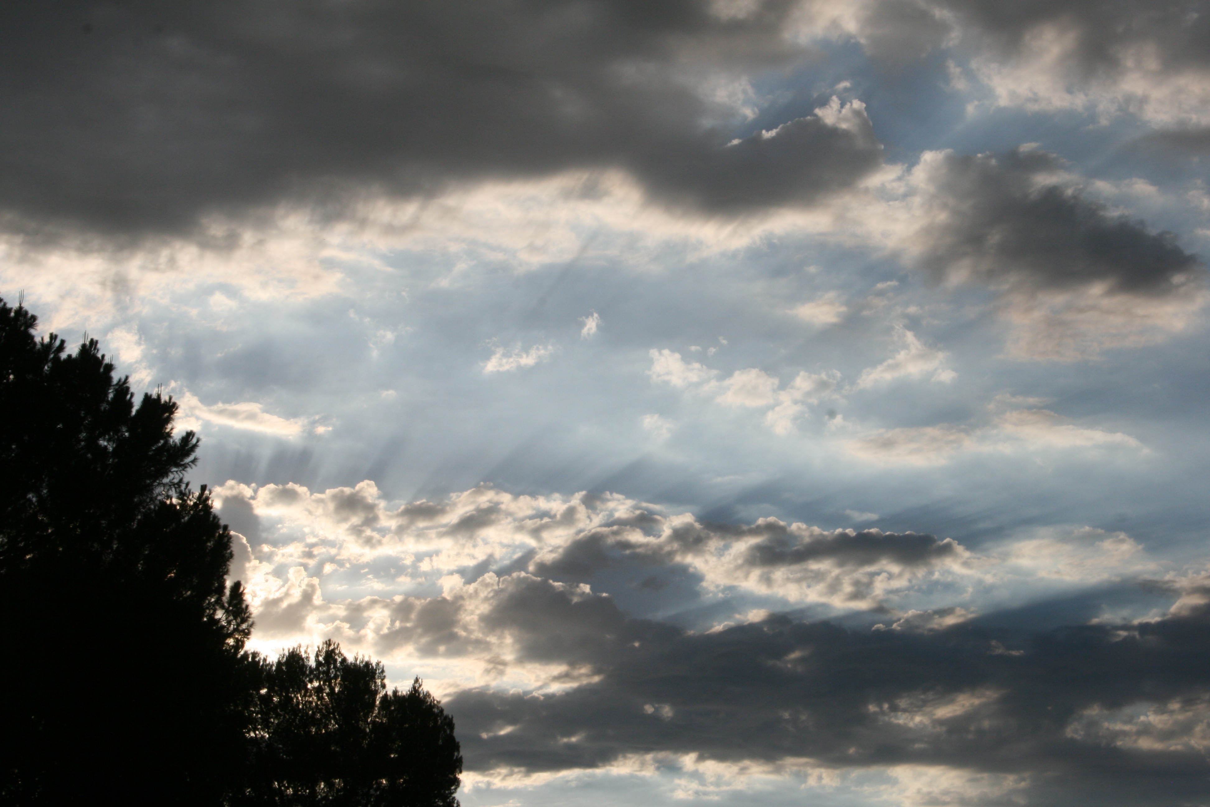 Despite that big, threatening cloud directly overhead, no, we never got a drop of rain, no matter how desperately we need it. Just a pretty sunset, clouds, shadows, and crepuscular rays.