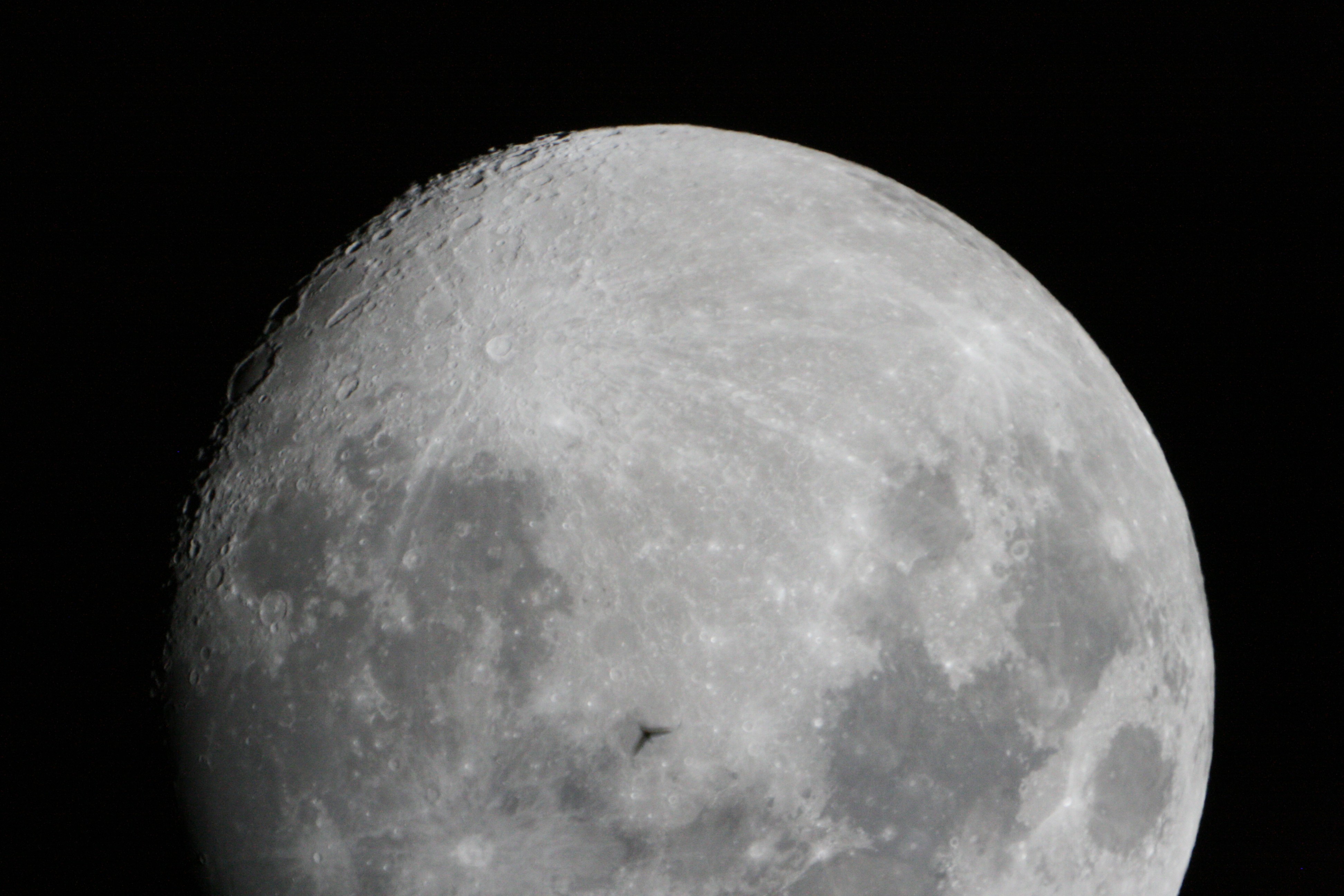 It’s way out of focus since I was focused on the moon, 362,544 kilometers away. At first I figured it must be a plane up at 35,000 feet, since we are right under the departure track from LAX to parts north and Asia-ward. But if it were a plane, wouldn’t we see the anti-collision lights? So maybe it is a bird at 350 feet? But those are really long wings for any bird normally seen around here.