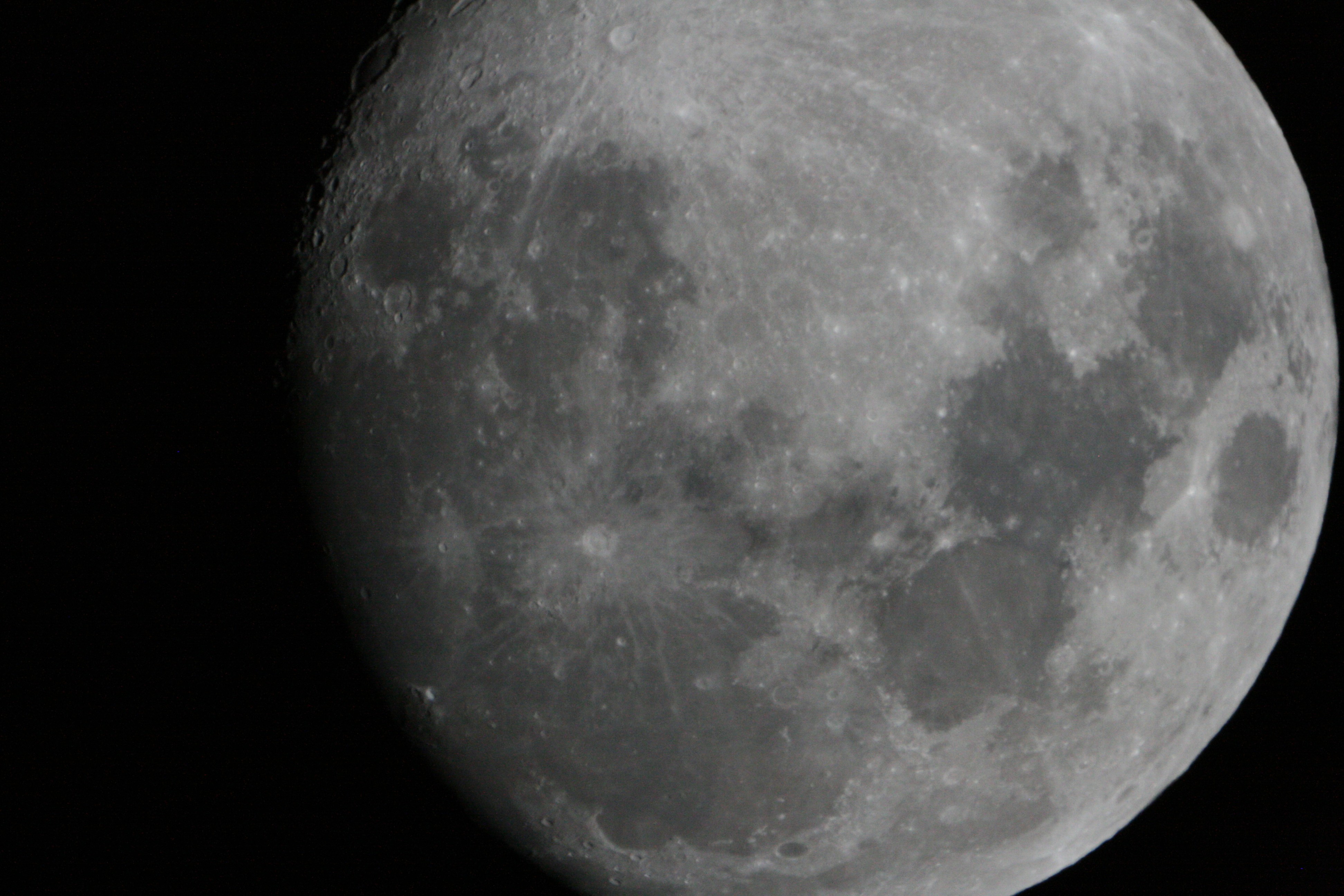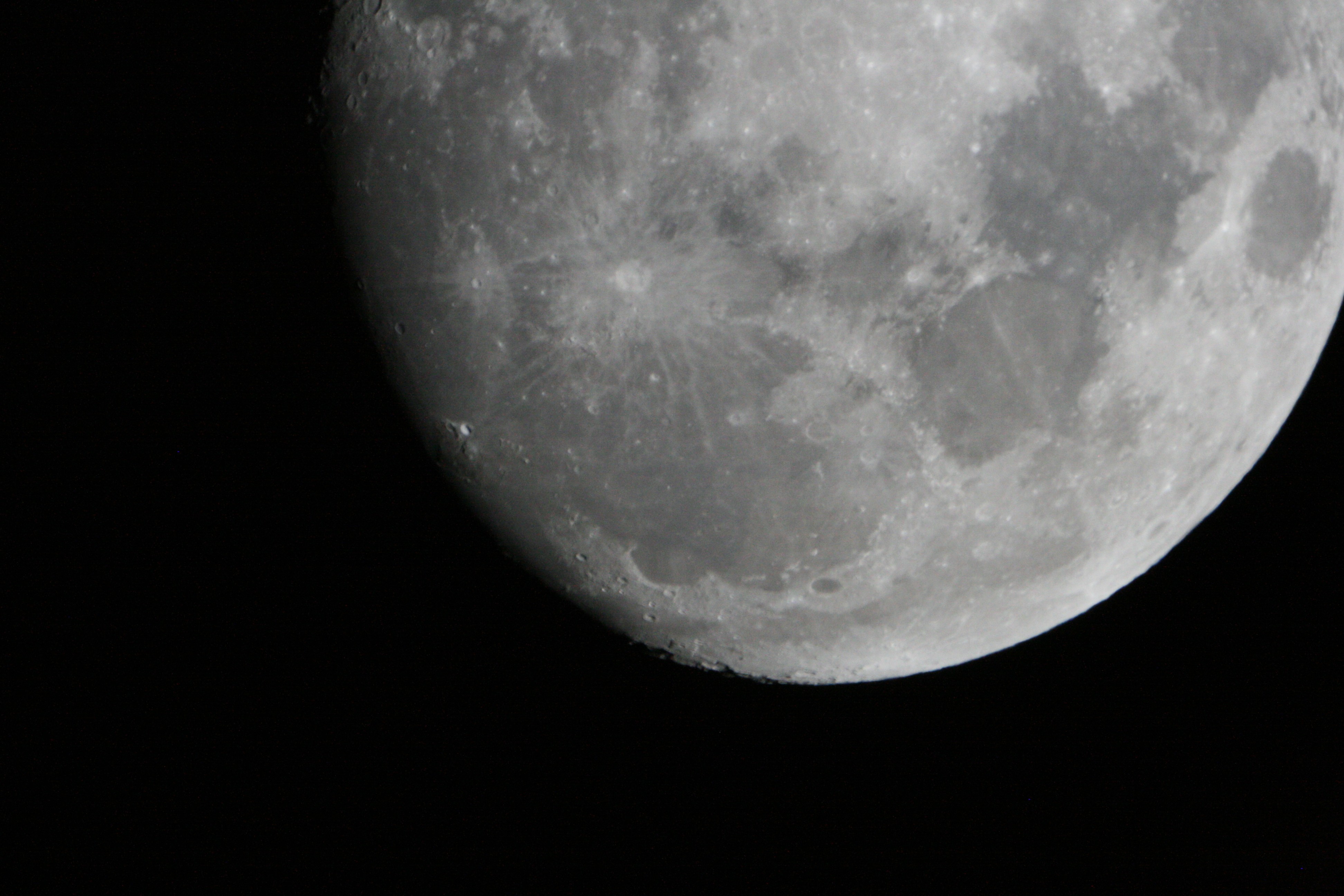 The terminator is at the upper right here and you can see some good definition of the mountains and craters along that edge of the moon. The huge crater at the upper left, with rays shooting halfway across the globe is Tycho.