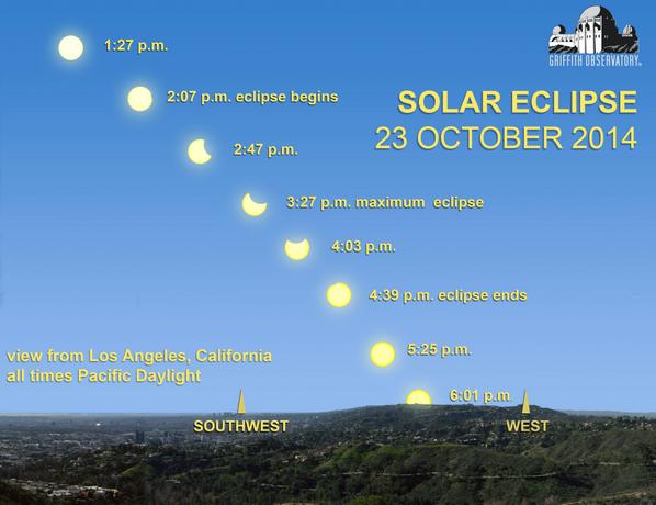 You may have heard (like here where I ranted about it last week) that there’s a partial solar eclipse tomorrow afternoon. As always, BE SAFE WHEN LOOKING AT THE SUN, but beyond that, the short version is that the further north and west you are in North America, the more of the sun you’ll see covered. There’s an excellent map here that shows coverage for tomorrow. If you’re in the Los Angeles area, here’s a great graphic from Griffith Observatory showing what to expect and the times: