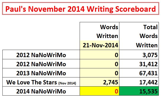 The good news is that I got to go to that tremendous NASA Social for two days. The bad news is that the time spent for days beforehand doing my homework for that event so that I could ask intelligent questions, plus the event itself, plus writing about it after the event (2581 words today about Day Two, woo hoo!), all are sucking huge chunks of time out of my NaNoWriMo writing time.