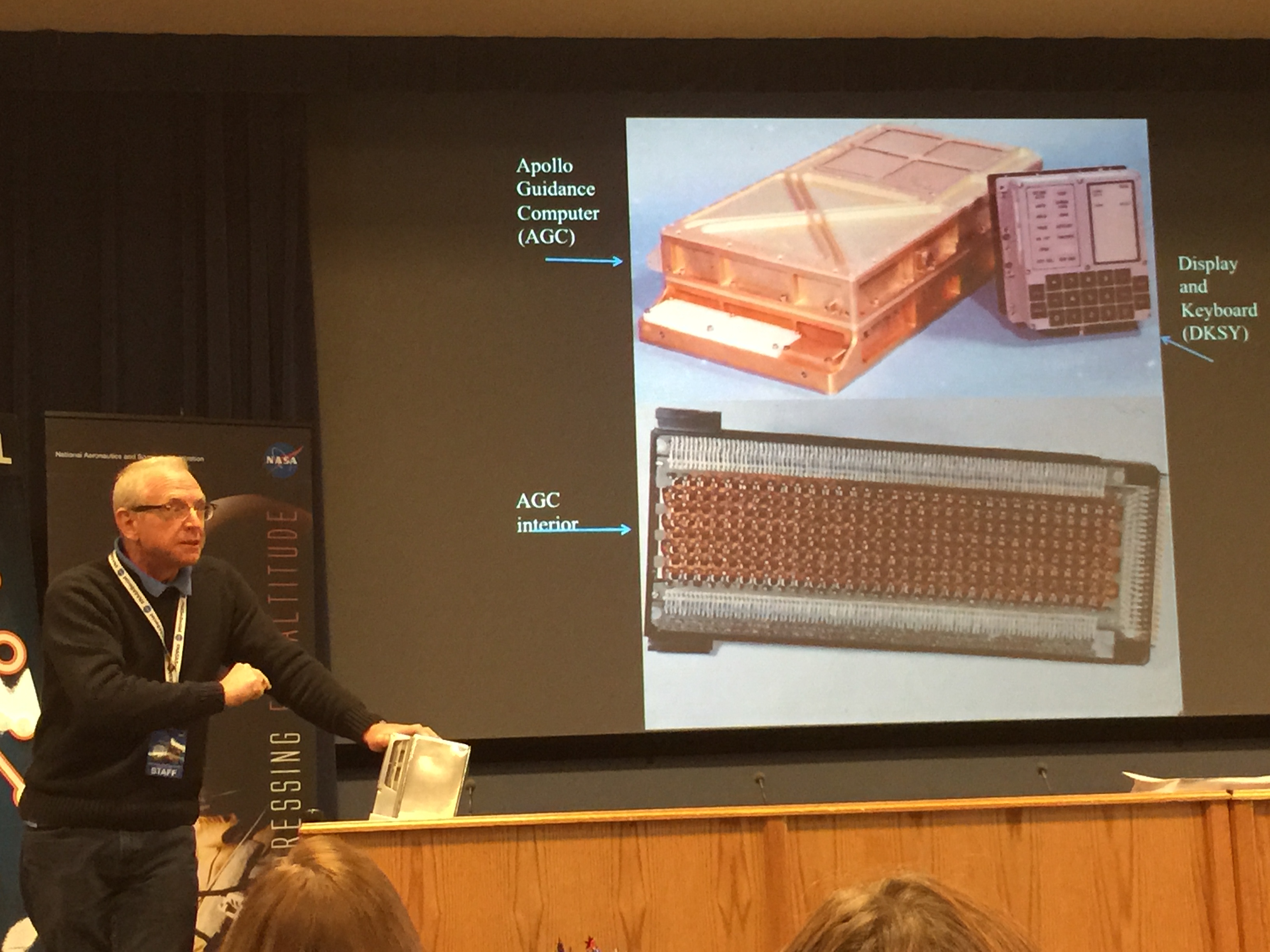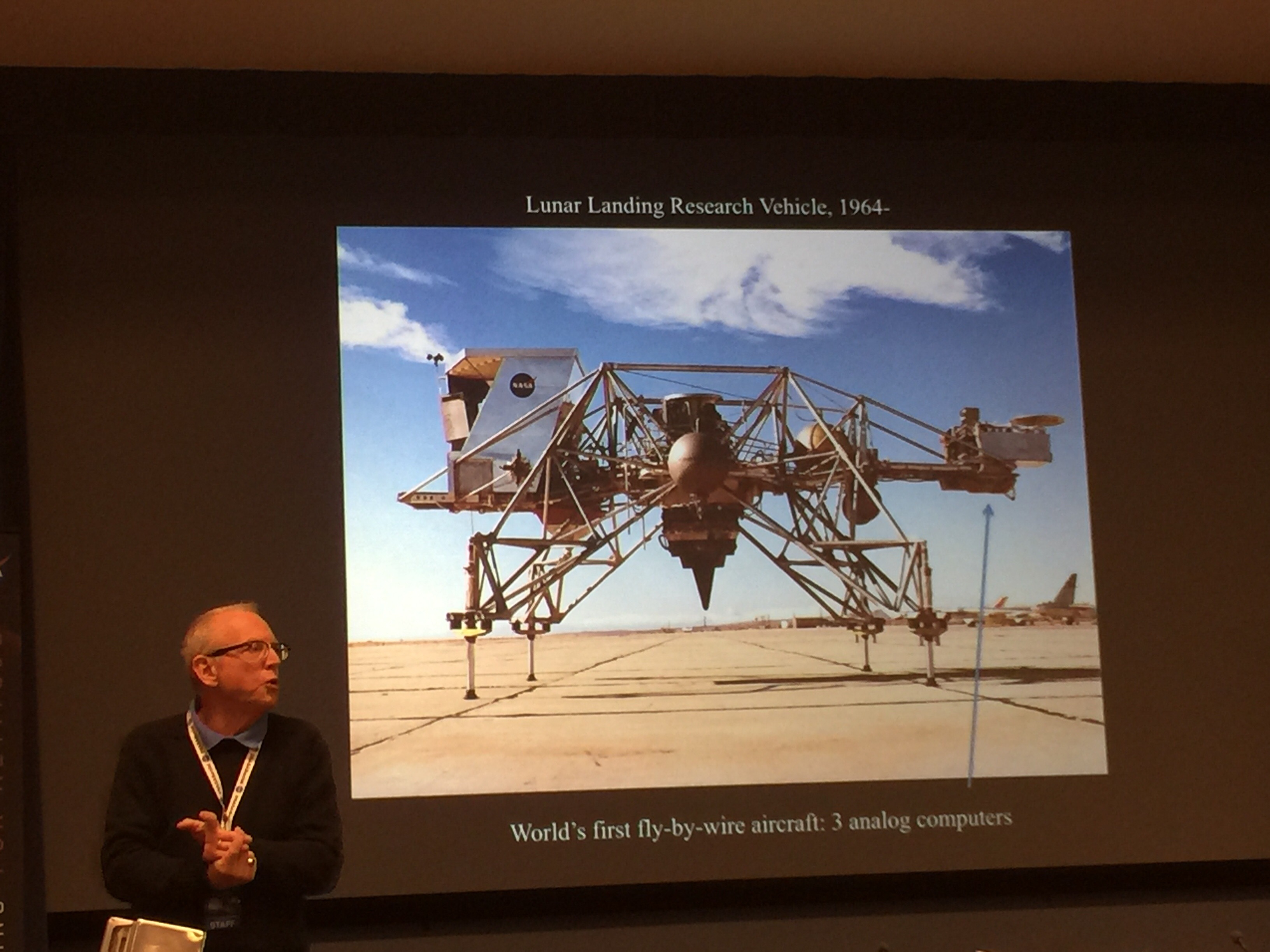 Doctor Christian Gelzer, Chief Historian at NASA Armstrong gave us a talk on the history of “fly-by-wire” (FBW) control systems. The short version is that in an older commercial or military plane, and still in almost all light general aviation aircraft, controls on the plane (yoke, rudder, trim) are connected to rods and levers and maybe hydraulic systems, which are in turn connected directly to the ailerons, flaps, and rudder. In a FBW system, which now includes all military aircraft and the vast majority of all commercial airliners, the controls talk to a computer and the computer talks to a motor attached to the ailerons, flaps, and rudder to move them in the way the pilot is commanding.