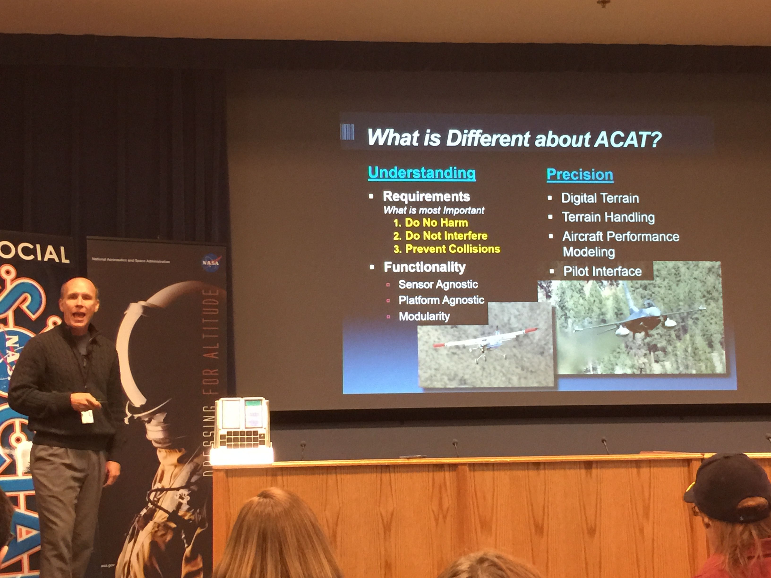 Once we had taken a break and I had (at least figuratively) taken a cold shower, Mark Skoog, Chief Engineer of the Automatic Systems Project Office, gave a fantastic presentation on the Automatic Ground Collision Avoidance System (AutoGCAS). In short, the military has a problem with too many pilots flying perfectly good, healthy, functioning aircraft into the ground or the sides of mountains. This can be caused by fog and clouds, by pilots being temporarily disabled by high G-forces, or by pilots distracted by other tasks in the cockpit.