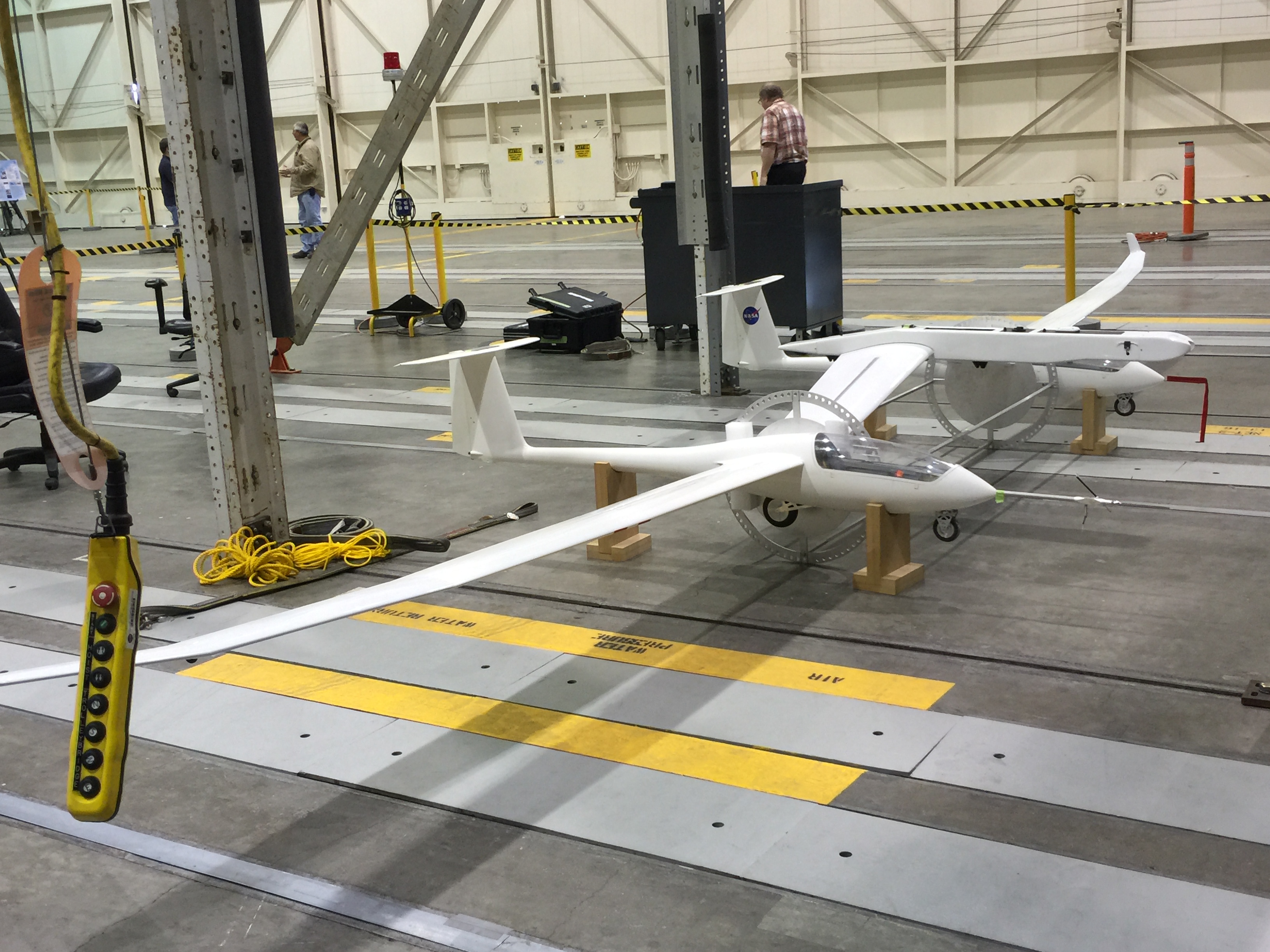 In the lab, being tested for balance and dynamic loads was this scale model of a concept being developed at NASA Armstrong for an unmanned glider which could be used to launch rockets into low Earth orbit (LEO). Similar to Virgin Galactic’s “White Knight 2” carrier airplane, this plane would have much longer wings and be towed to altitude (carrying in the middle the rocket to be launched) by a simple business jet or military cargo jet. At 40,000 feet, the glider cuts loose, the tow plane boogies, and the rocket is launched from the glider.
