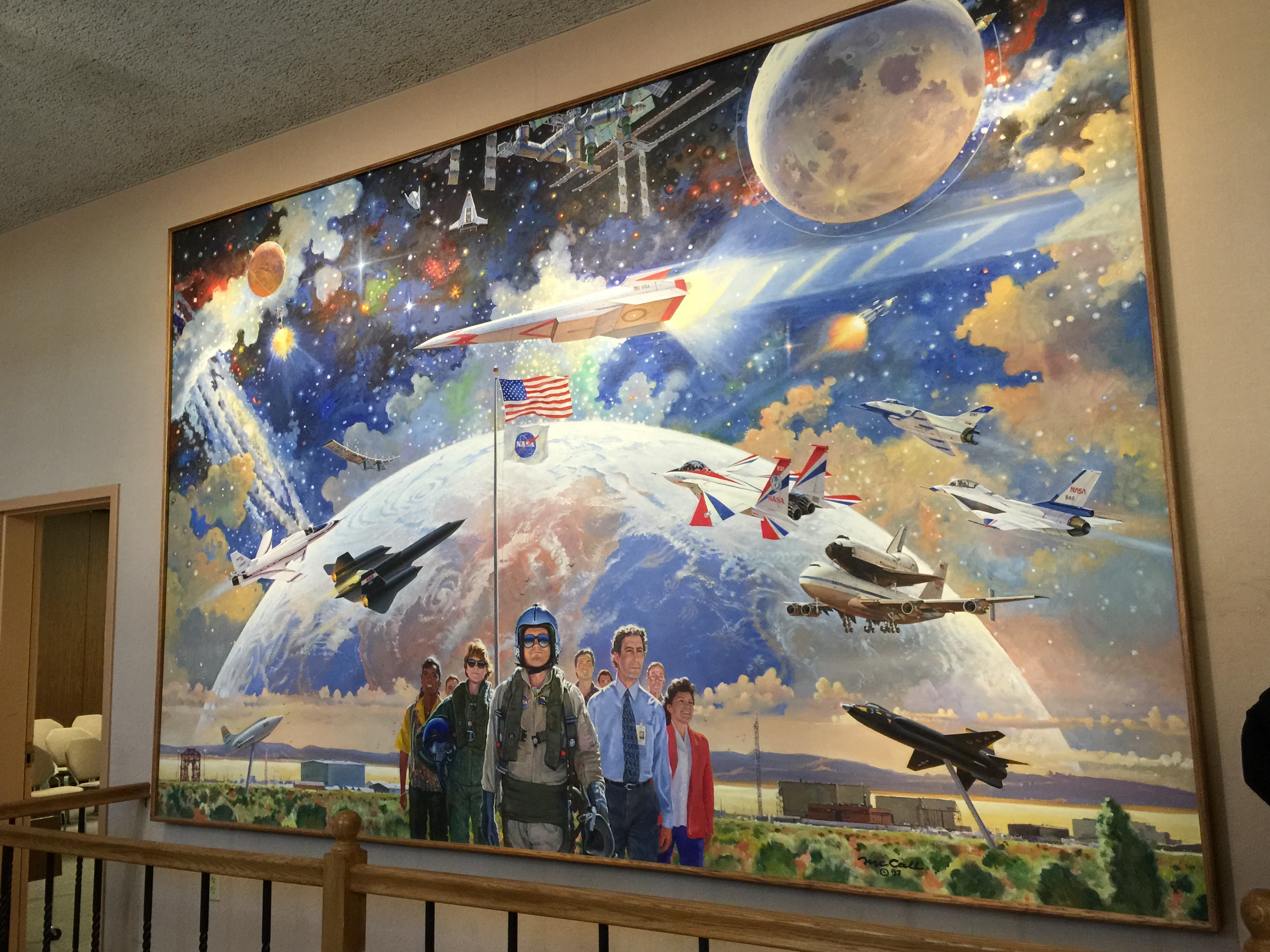 We went to another of the main NASA Armstrong buildings and saw this ginormous painting by Robert McCall. McCall is one of my all-time favorites due to his work in space and aviation art. He worked on the concept drawings for the movie 2001: A Space Odyssey, has had hundreds of paintings commissioned for NASA centers all over the country, and has even had his artwork featured on US postage stamps.