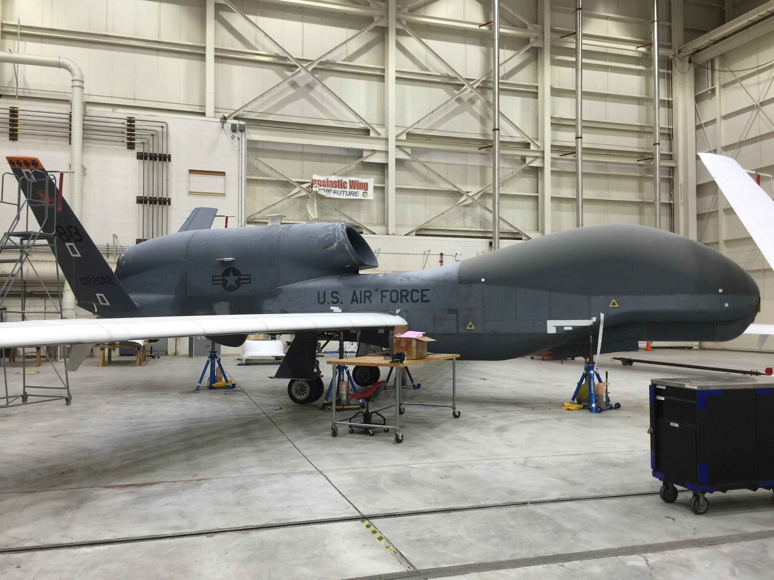 In that building we saw a couple of the NASA Global Hawk UAVs. These are used by NASA to fly long missions, up to twenty-four hours at a time (or longer) in order to gather data on atmospheric conditions, weather, and hurricanes. They are flown remotely from either NASA Armstrong, NASA Wallops Island in Virginia, or a portable mission control setup.