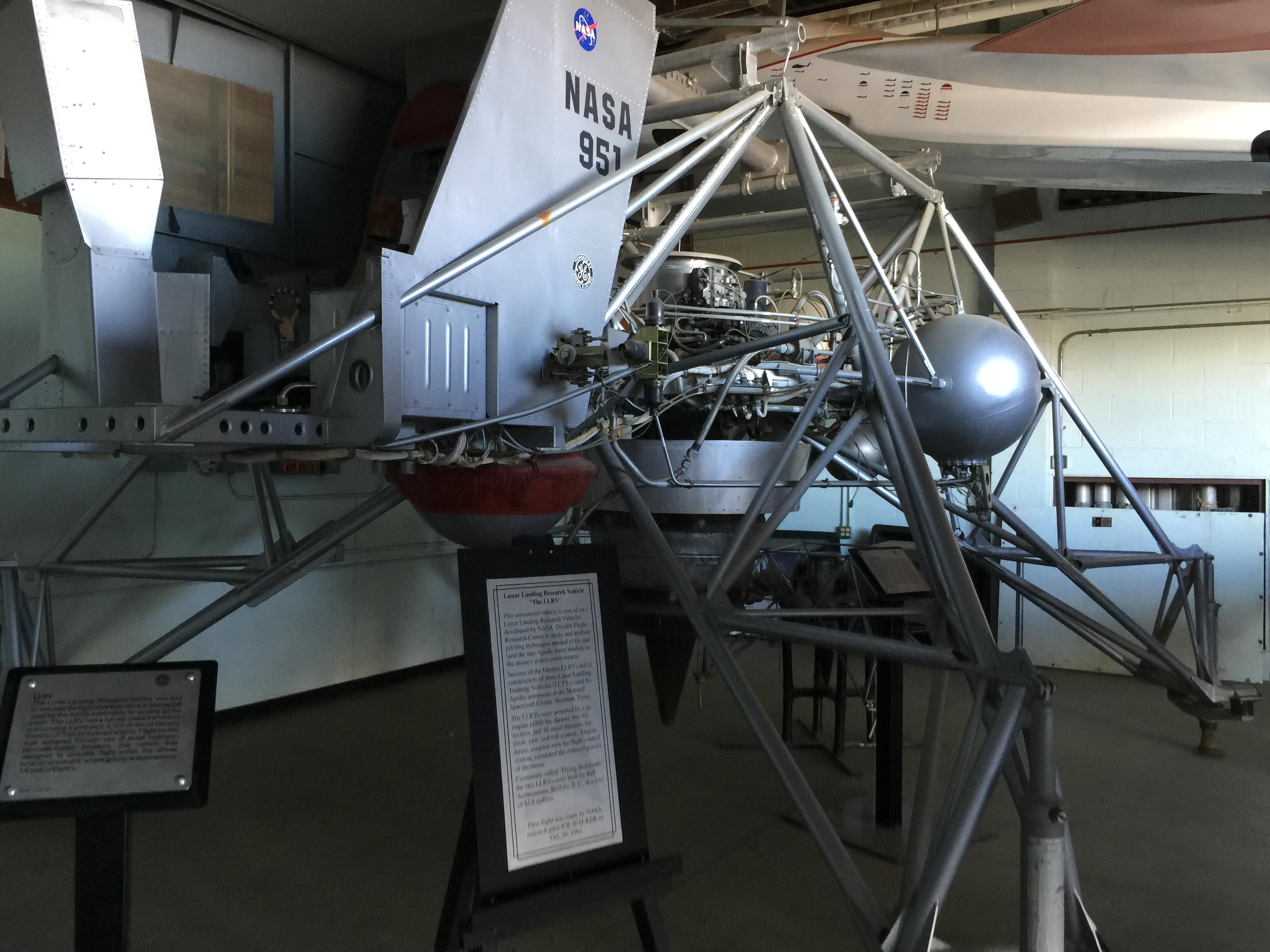 In the garage behind the M2-F1 was the last of the Lunar Landing Research Vehicles. Remember, I told you above to remember that fly-by-wire slide. Here it is! (Cue more über-squeeee-ing!) In the center left you can see the pilot’s compartment cantilevered off of one side. The large jet engine, pointed straight down, is in the center.