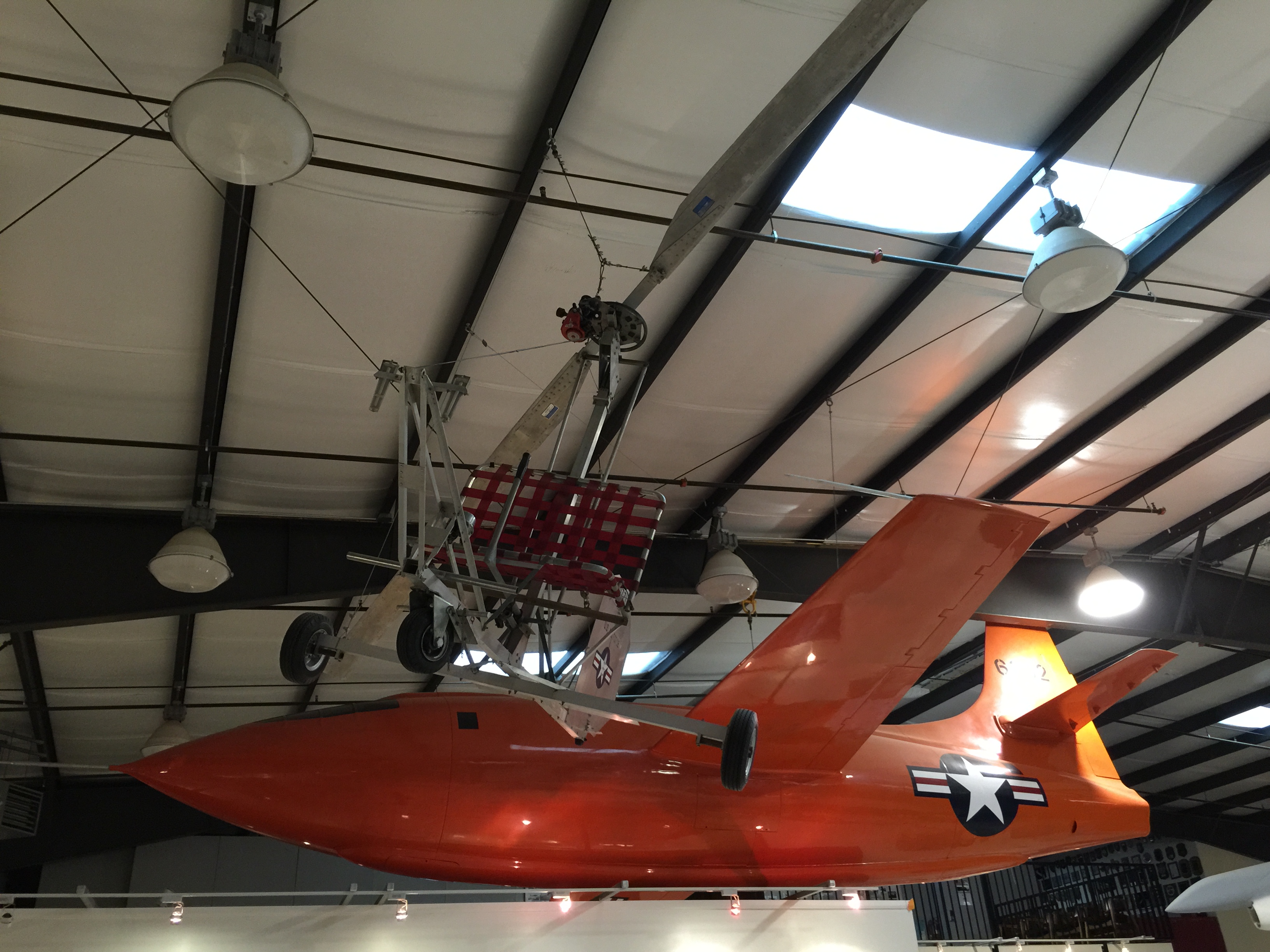 Above your head is a very early gyrocopter, and an exact model of the Bell X-1 aircraft which Chuck Yeager used to break the sound barrier. (The actual original aircraft is in the main hall of the Smithsonian Air & Space Museum in Washington, DC.)